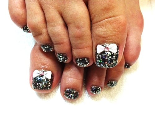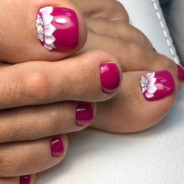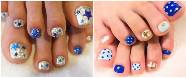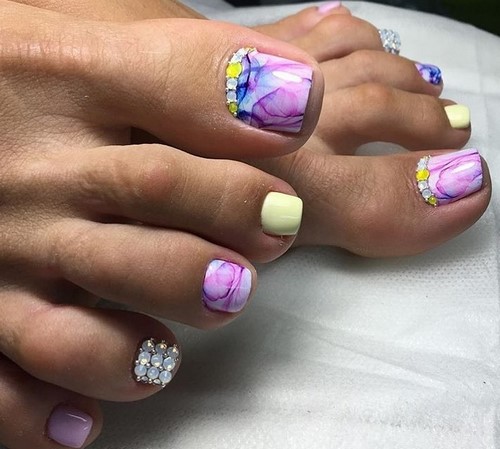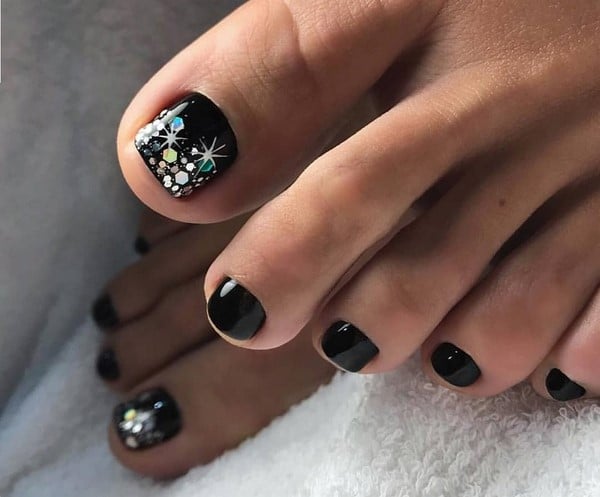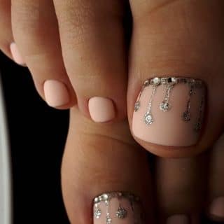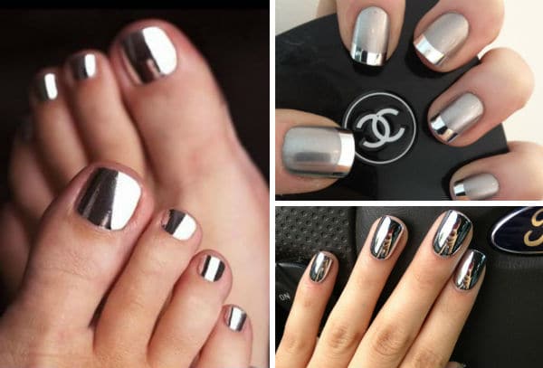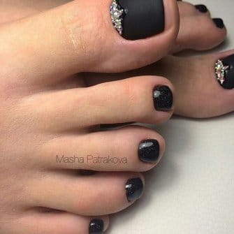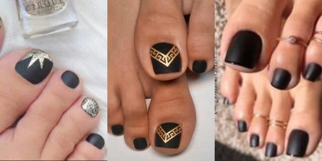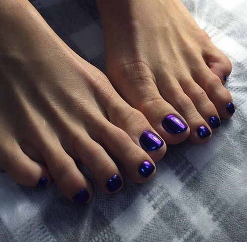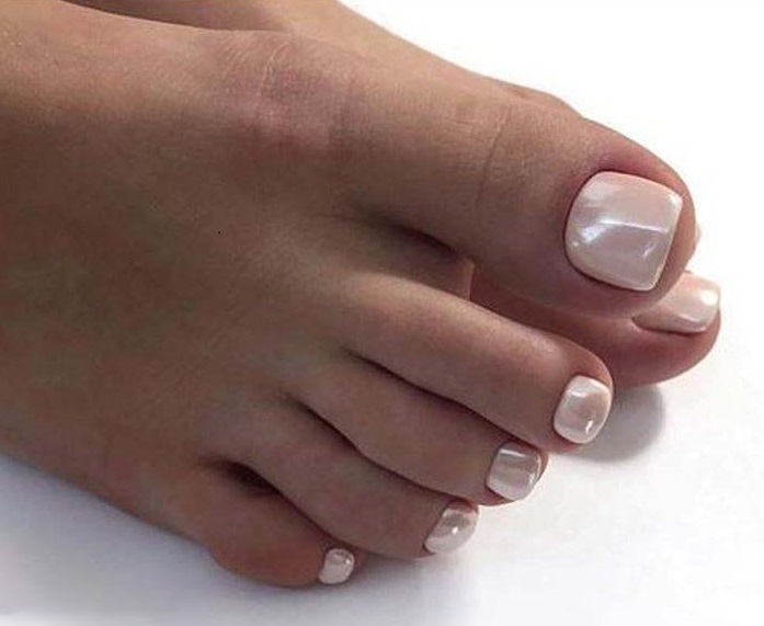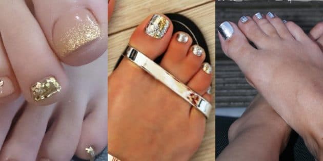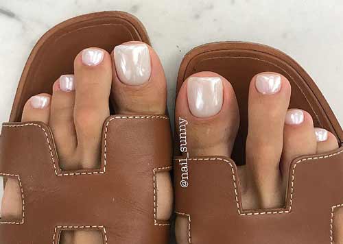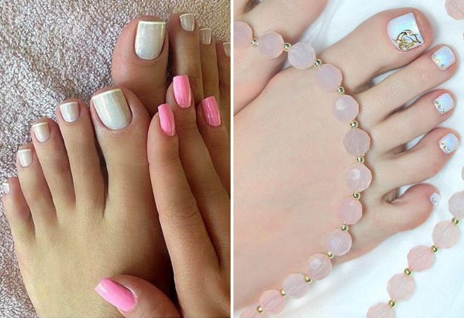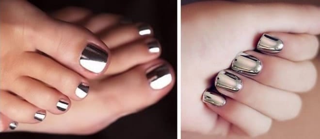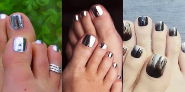 You can not ignore such pedicures as mirror and pearl. This pedicure is done using a special rubbing, which gives the nails a mirror shine. There are many options for such a pedicure, one of them is the alternation of a mirror finish with a matte finish. Using white, you can create a pedicure that will resemble pearls. Golden will give your nails a real golden glow, and gray will give them a metallic sheen. Whatever color you choose, a pedicure with a rub will surely draw attention to your legs.