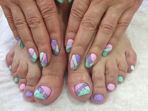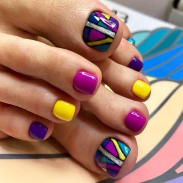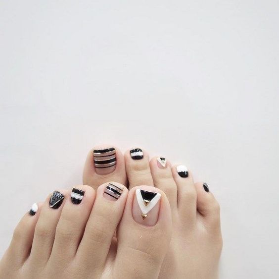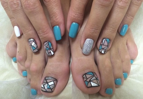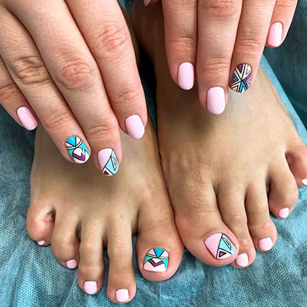 Drawing geometric shapes on nails has become very fashionable lately. Geometric pedicure can be either minimalist or quite bright and youthful. It can be represented by the intersection of several lines, a small figure on the nail or the whole intersection of complex geometric shapes. Very often, geometric pedicure is combined with the technique of negative space. From geometric shapes, you can create a whole picture on the nail that will attract the attention of others, while combining the simplicity of lines and the mystery of their intersections.