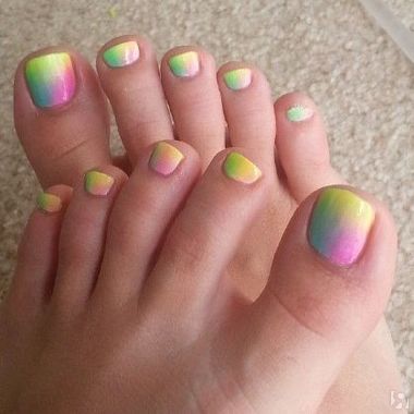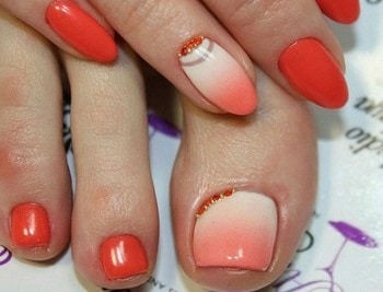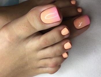 Gradient pedicure in its popularity does not lag behind the French, despite the fact that this is a new trend in the nail industry. This pedicure is often called ombre. Its essence is in mixing colors, through a gradient transition. Ombre can be made using both bright and nude shades. Of course, mixing nude shades, the transition will not be so pronounced, but it will not lessen the charm of this technique. Gradient transition can be used on all fingers, and only on the big one.