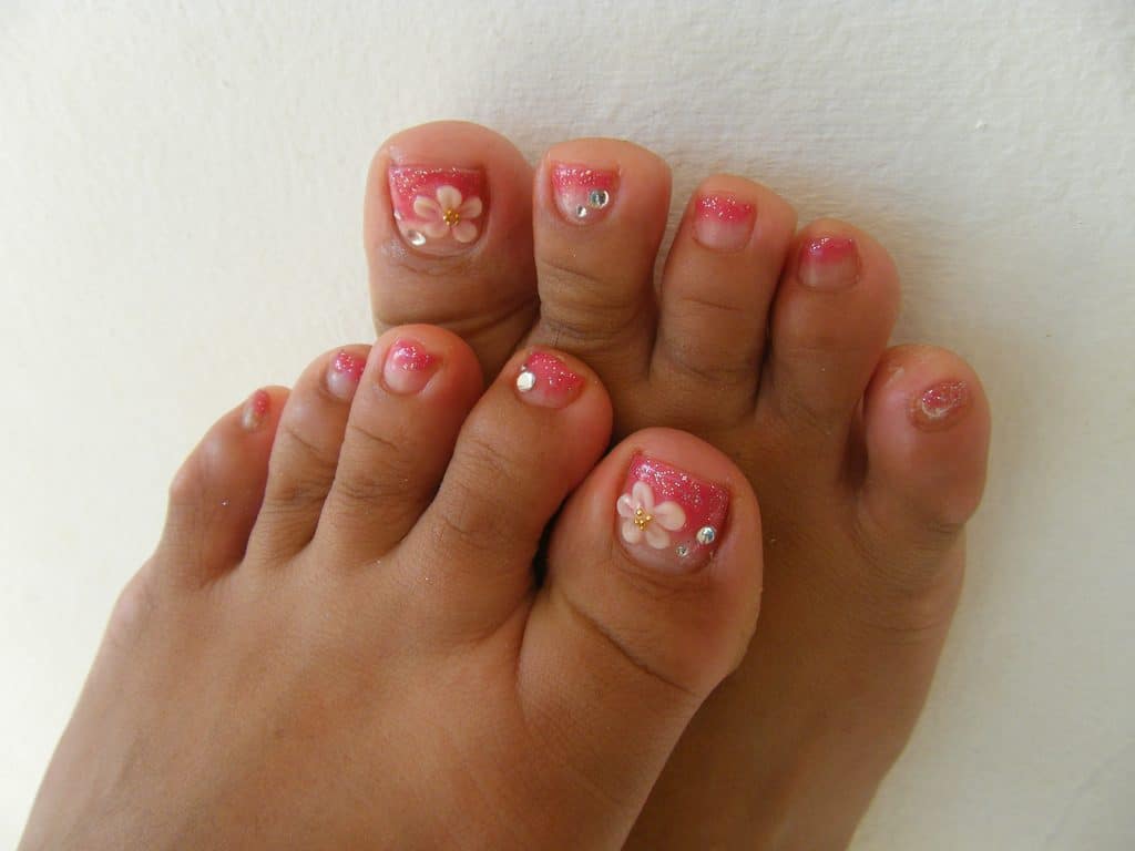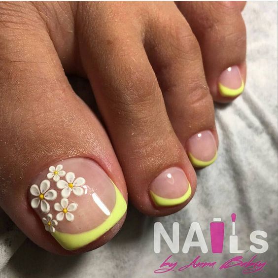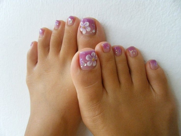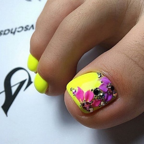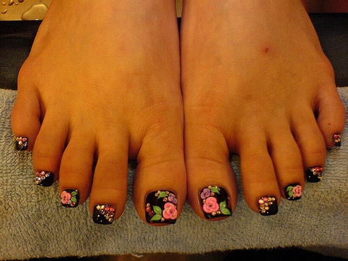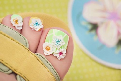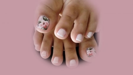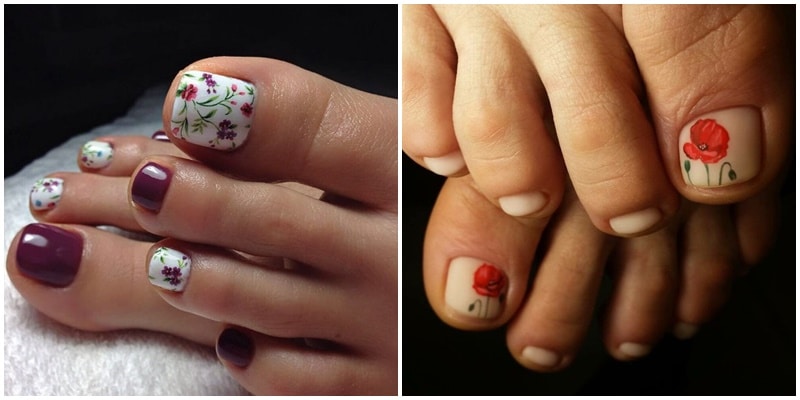 Floral pedicure is the best suited for the spring-summer period. When nature begins to blossom its flowers, one wants to help her and decorate everything with flowers and legs are no exception. For spring, spring flowers are best suited: tulips, snowdrops, geocints, and in summer you can use chrysanthemums, poppies, chamomiles and many other summer flowers. Floral patterns can be done by hand or using stamping, it does not matter, the main thing is that your mood matches the pedicure.