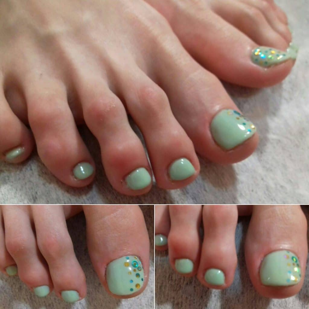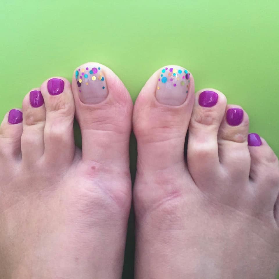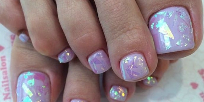 Kamifubuki is a pedicure technique that requires virtually no skills, even a novice who for the first time picks up gel polish can do such a pedicure. Kamifubuki look like small multi-colored sweets that accidentally landed on your legs. All you need to do is carefully sprinkle nails with them and cover with a top. Kamifubuki come in different sizes and even shapes. Classic kamifubuki are round, but there are also stars, hearts and stripes.