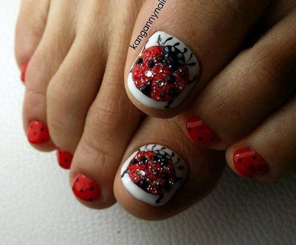 3D pedicure impresses with an abundance of design solutions. This is the most fashionable pedicure of 2024. 3D-style nail designs seem to come to life with just one look at them. The most saturated of course, the summer design of 3D drawings. Bright colors and a clear rendering of fruits make them seem to have just been cut from a branch. Do not forget about the drops. The pedicure with drops of water on the nails is so real that sometimes even the owners of the pedicure themselves try to brush them off. And if you want, you can arrange a real fairy tale and put ladybugs or incredibly beautiful butterflies on your nails, no one will guess that they are not real.