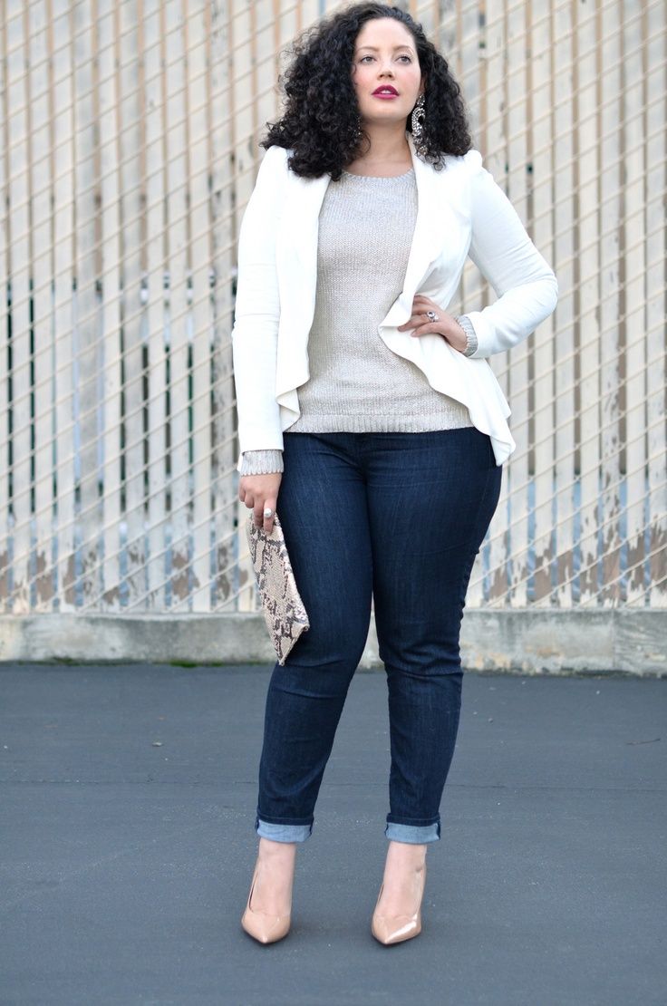 Jeans can be black and light blue with a rip. From shoes you can pick up pumps, ankle boots, or moccasins.