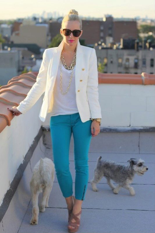 Bright trousers under a white jacket will help you move away from stereotypes. Such an image will be practical and beautiful. You can combine any bright color with white. Because white is universal and fits everything.