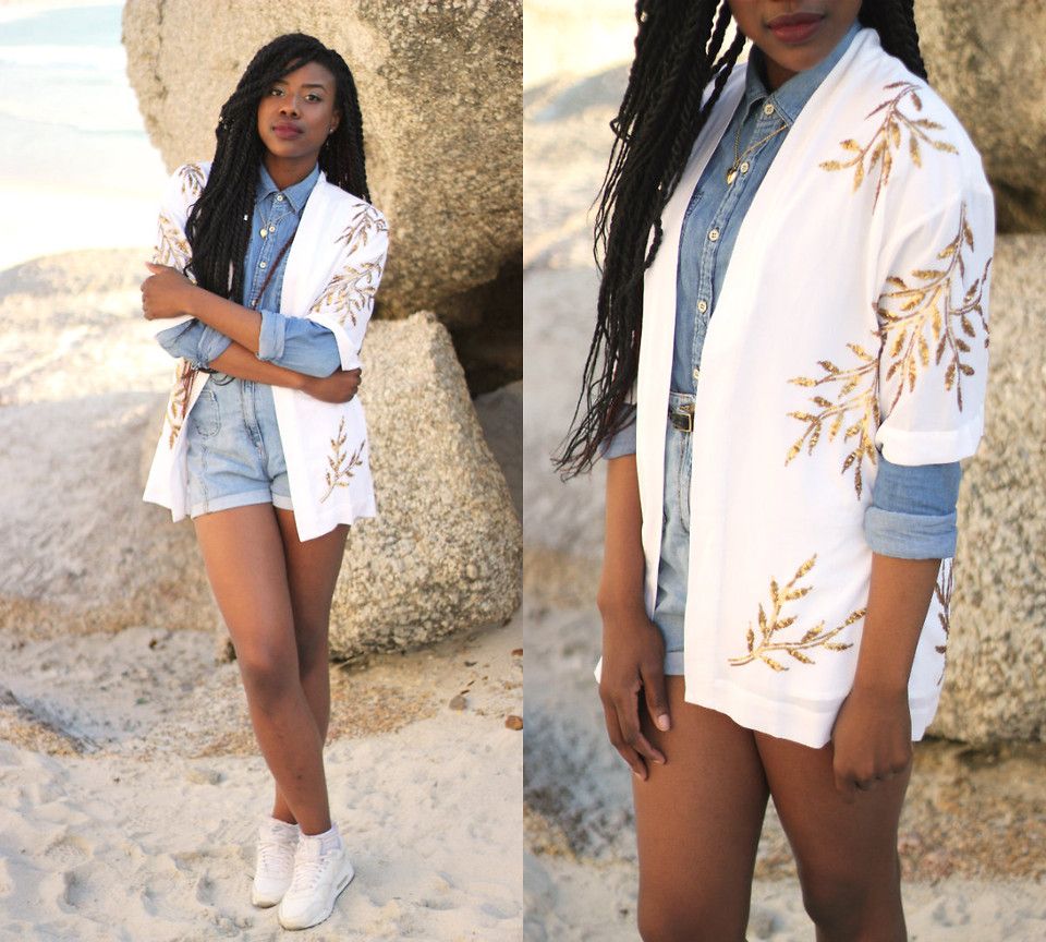 An excellent solution is to wear a white jacket and match short shorts with them. White color perfectly shades your skin, making it even more tanned.