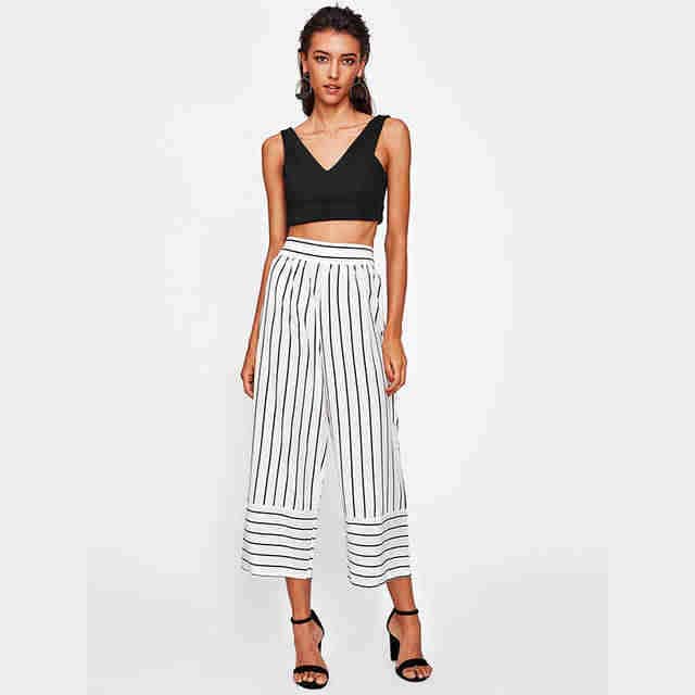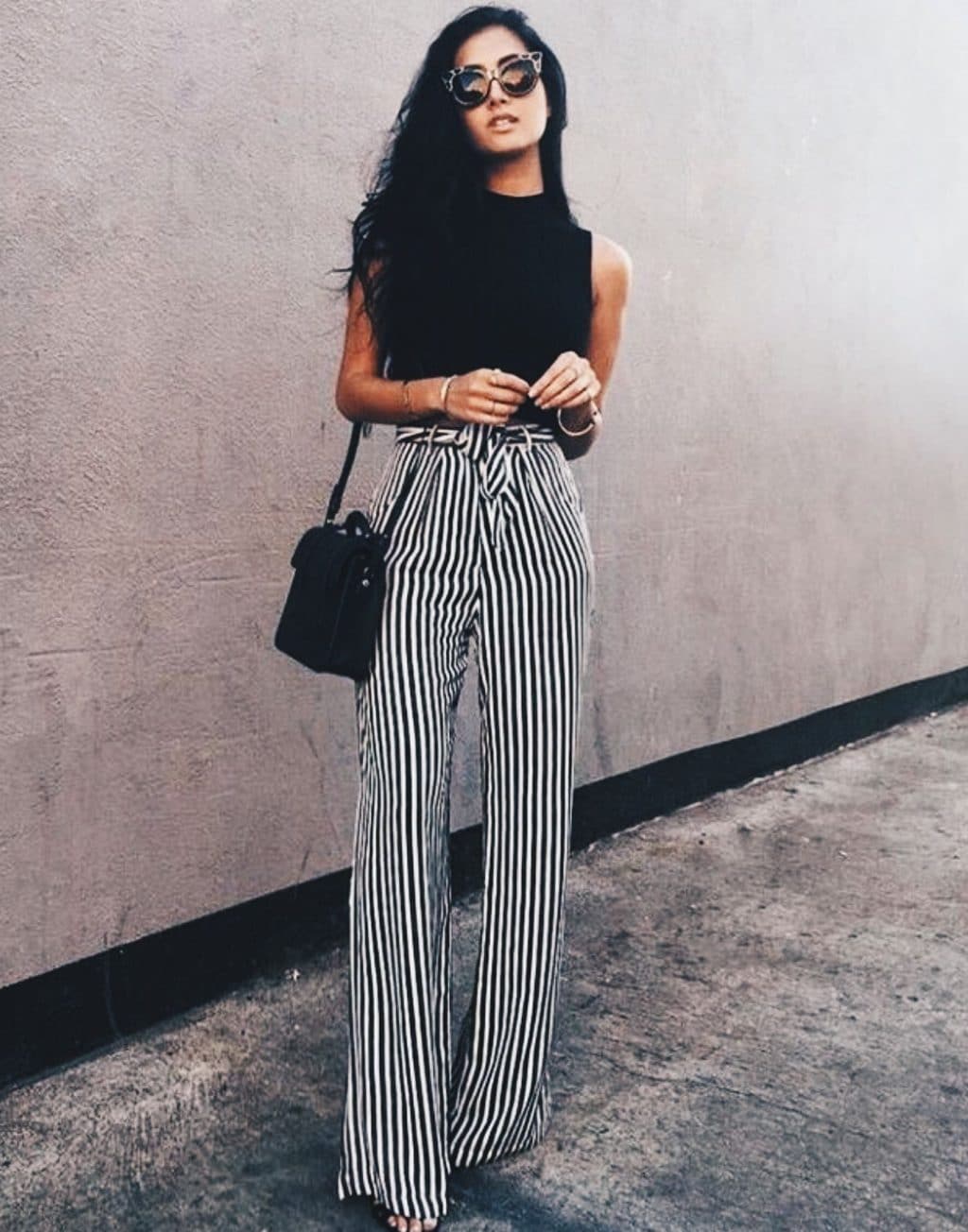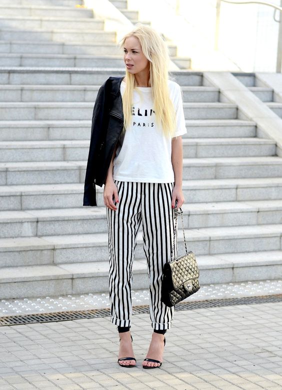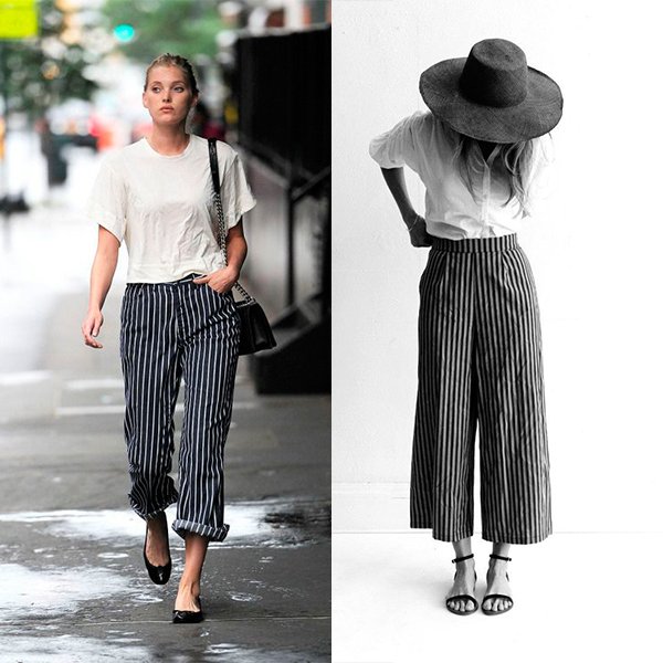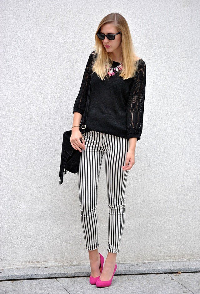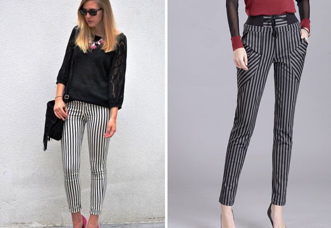 In order not to overshadow your striped trousers, stylists recommend choosing a light top. Of course, you can choose a black and other bright shirt, but the main rule is that it should be plain.
