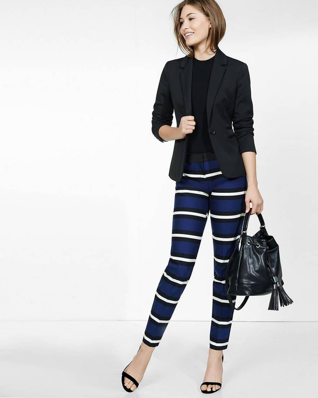 Classic striped trousers have a mostly straight, cut not narrowed down. They are great for office work, as they have a strict style.