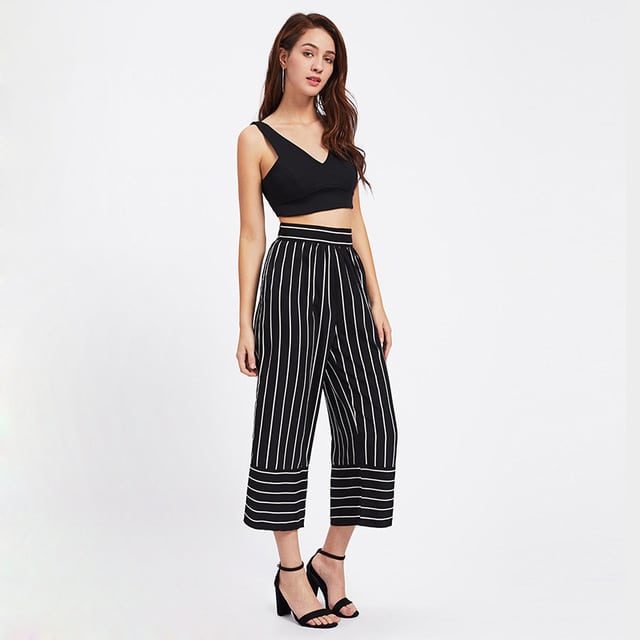 Wide trousers can be of different cuts. There are more elongated models and shortened ones. For short models, pick up short tops in hot weather. Sandals are perfect for such a cut of trousers.