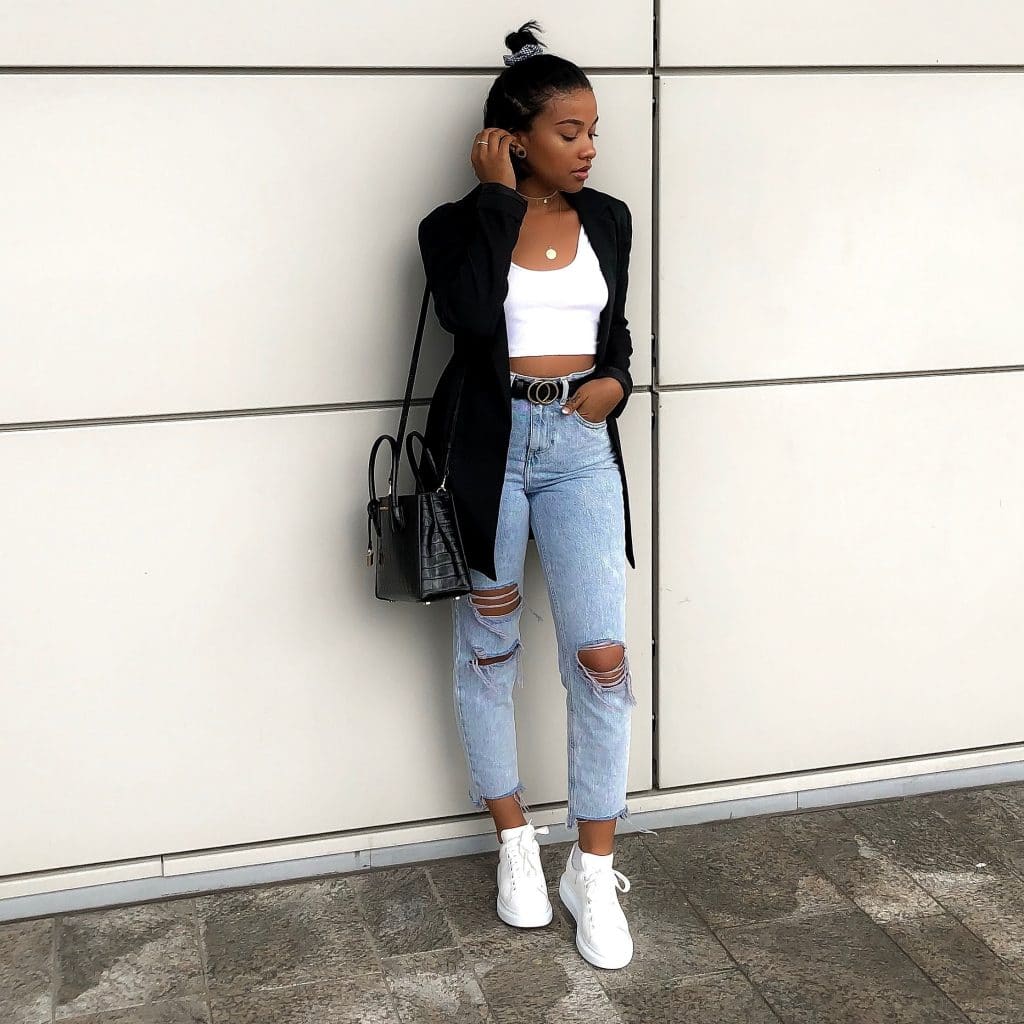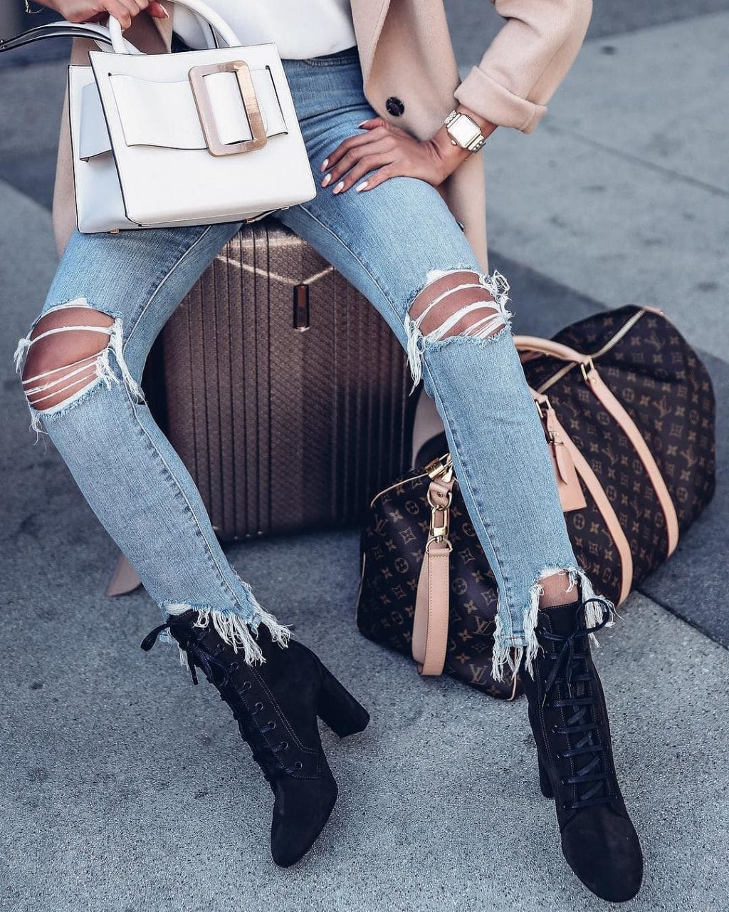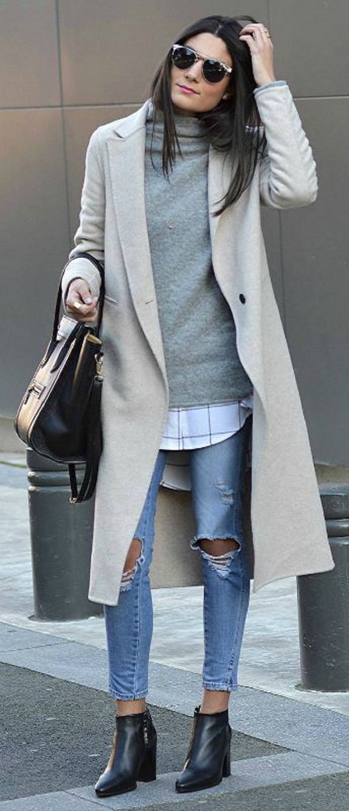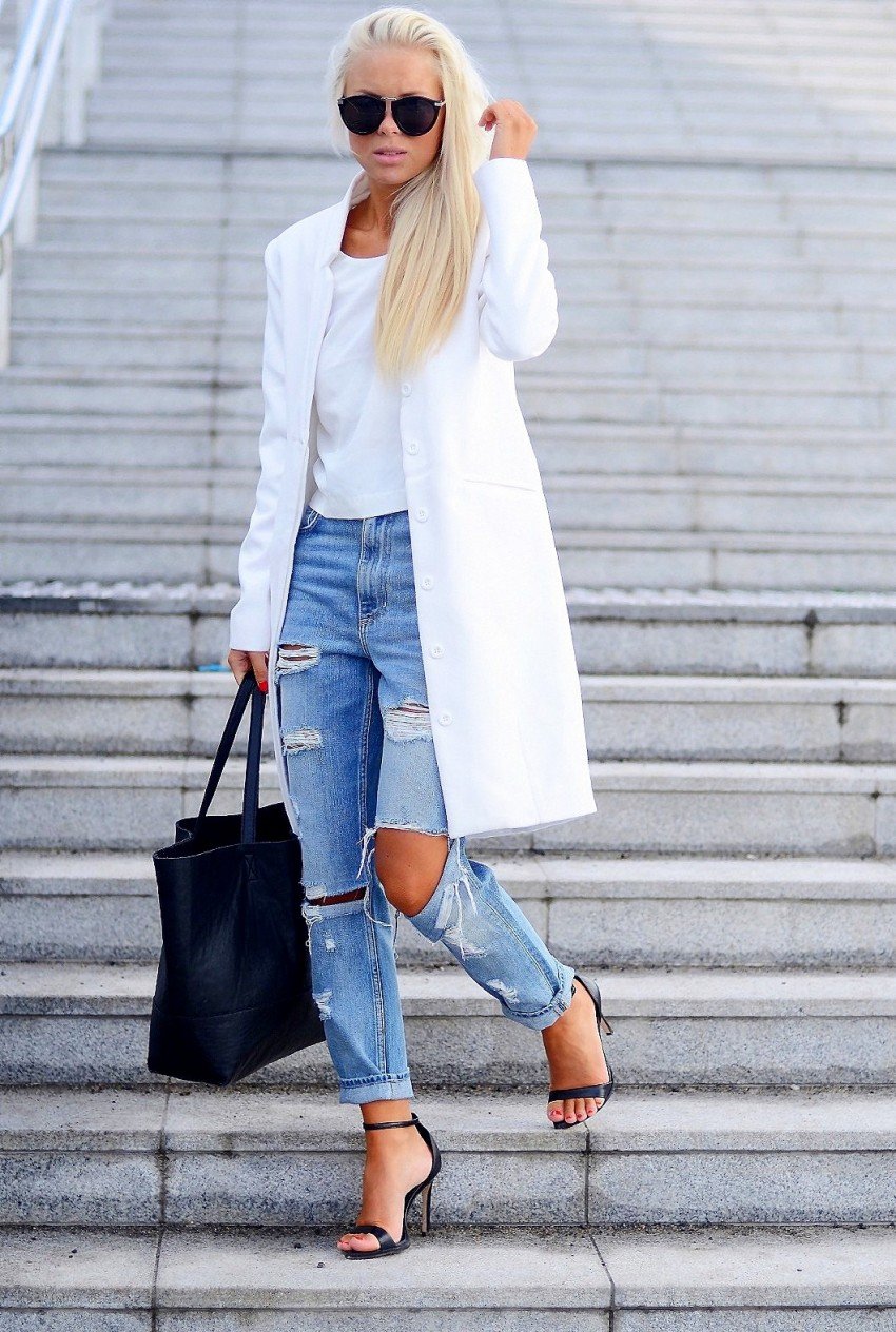 Although a coat is considered a more feminine thing, with ripped jeans you can also wear it. The coat can be both fitted and oversized. All jeans models will fit into such an image: mom jeans, skinny, straight.
