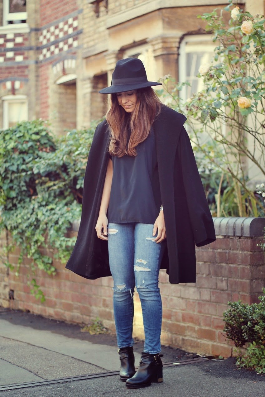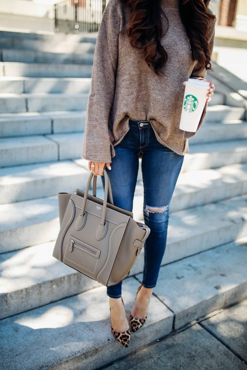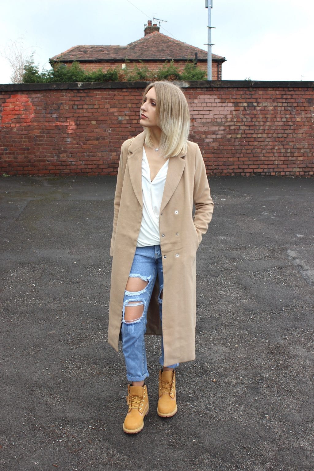 Although a coat is considered a more feminine thing, with ripped jeans you can also wear it. The coat can be both fitted and oversized. All jeans models will fit into such an image: mom jeans, skinny, straight.