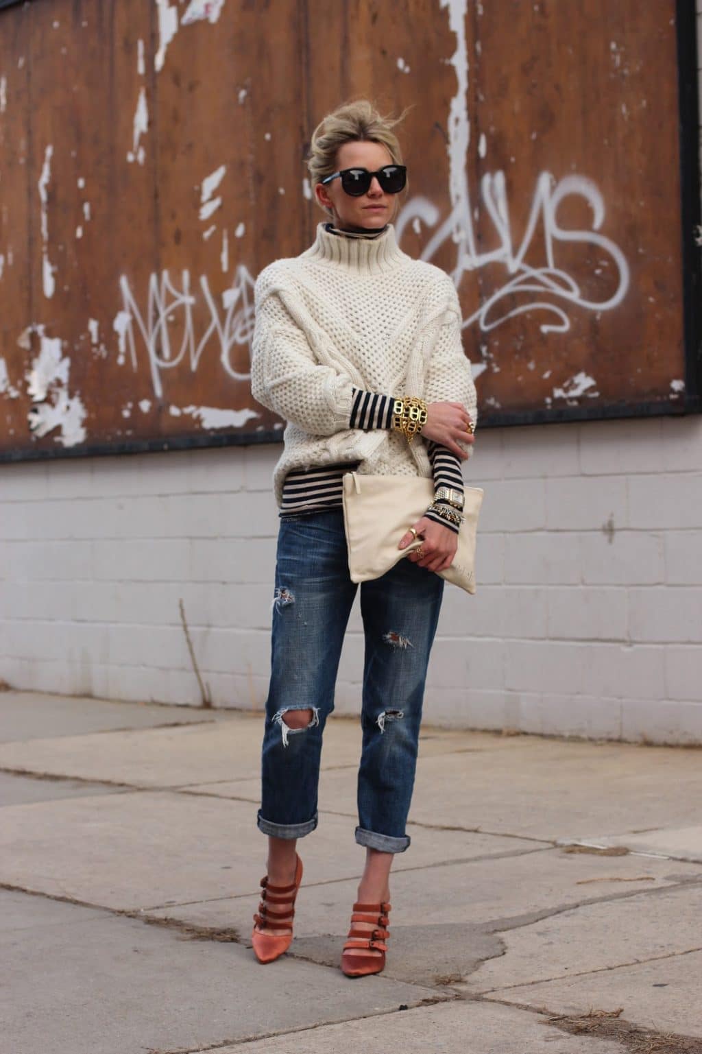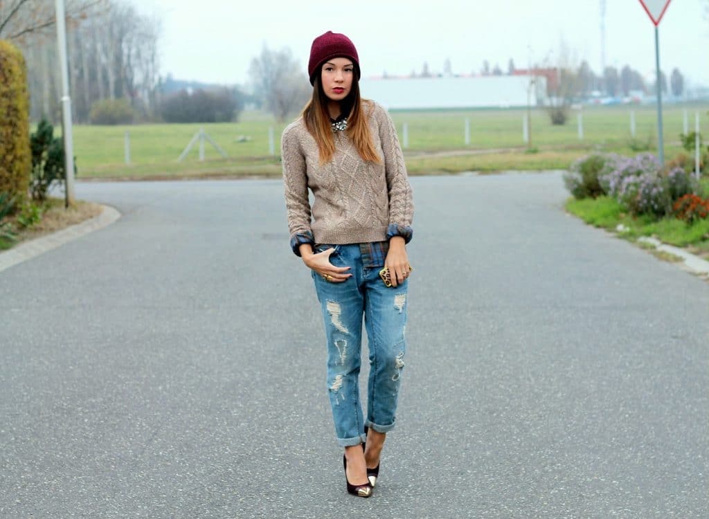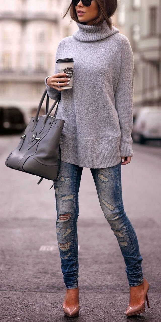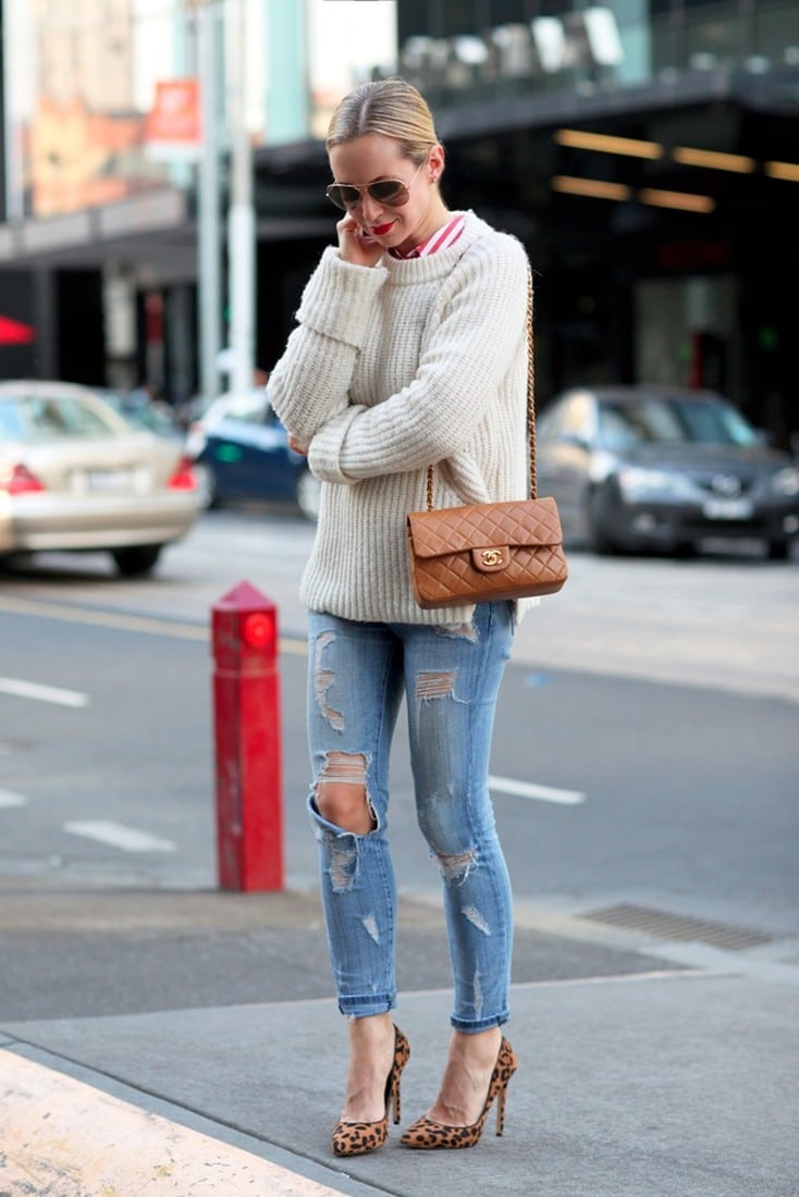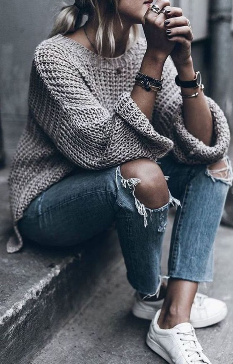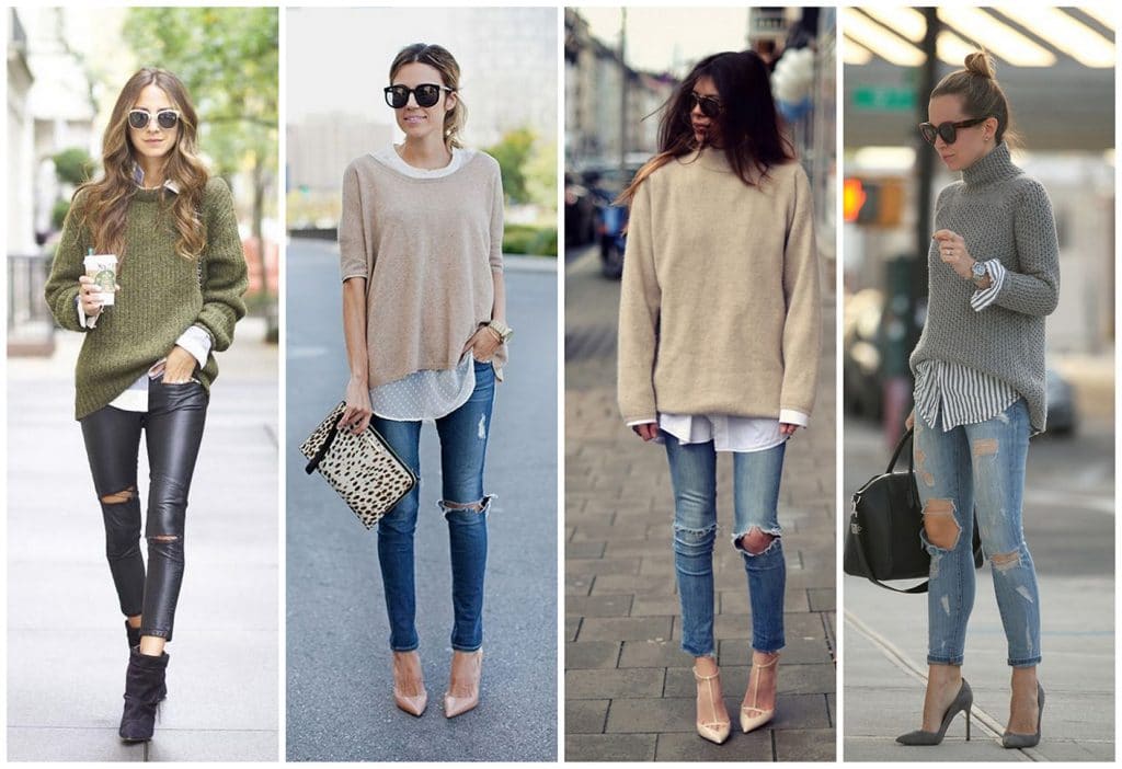 Various sweaters are great for ripped jeans. Now the most fashionable models of sweaters are oversized (free cut). A large knit sweater will look stylish, possibly with braids. Under such a sweater, you can put on a shirt and make a hem or collar on the issue. Of course, you can wear not only a knitted sweater, but also a thin cardigan. It can be with a high neck or with a v-neck. The jumper can be extended.