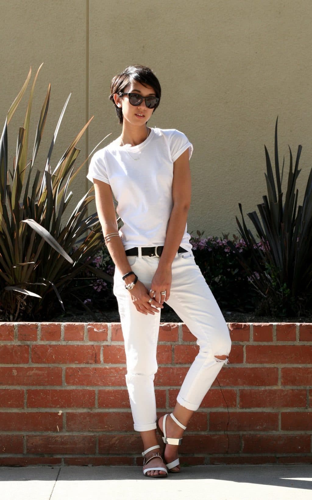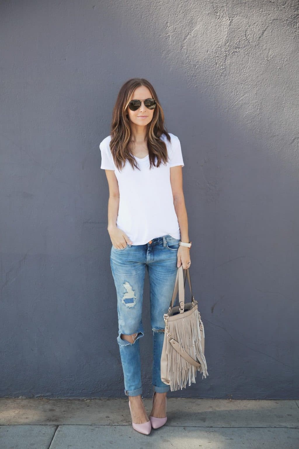 The most common combination. But if you do not know what to go for a walk, then the combination of a white T-shirt with equal jeans will be an ideal option. The model of a T-shirt can be different: with a v-neck, a loose model or a tight-fitting silhouette, you can also consider the option with an inscription or a large pattern.