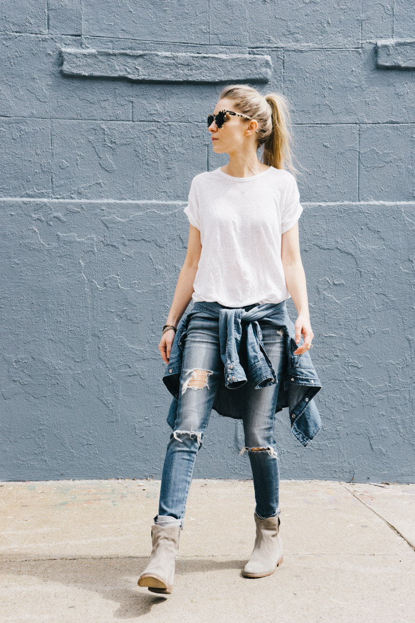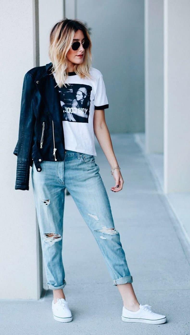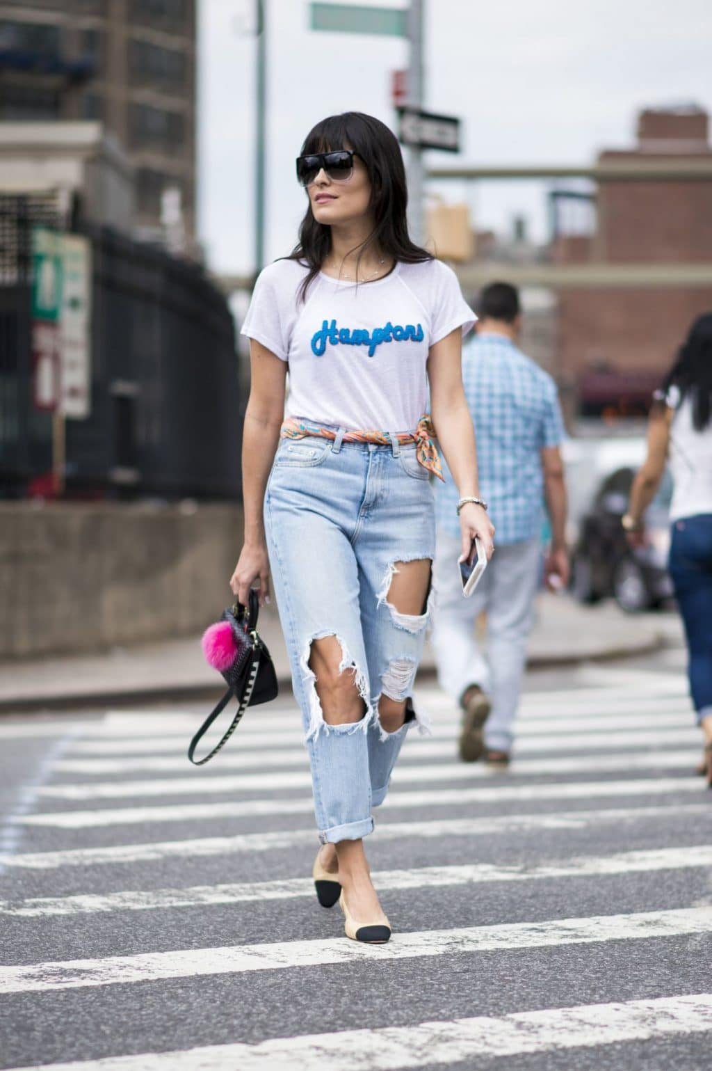 Ripped jeans came to us from the 90s, a time of fashionable rebels. Often, these jeans were combined with a voluminous colored T-shirt and sneakers.