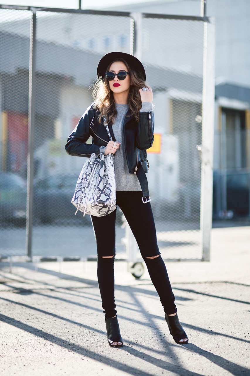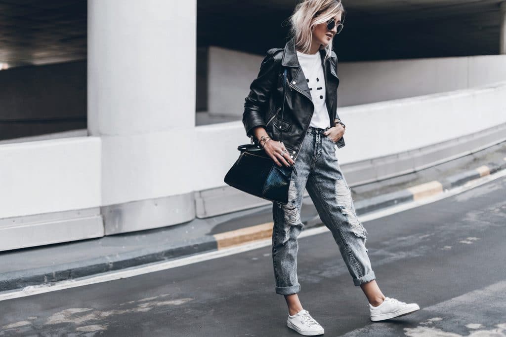 The most audacious option would be to combine jeans with leather jacket. It will be a very brutal image, especially with a jacket and a jacket with spikes and rivets.