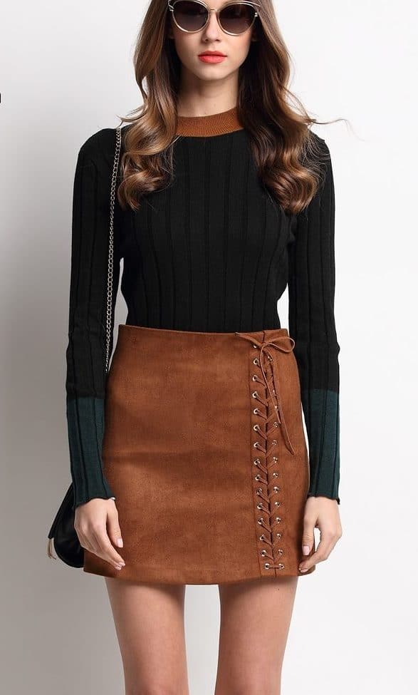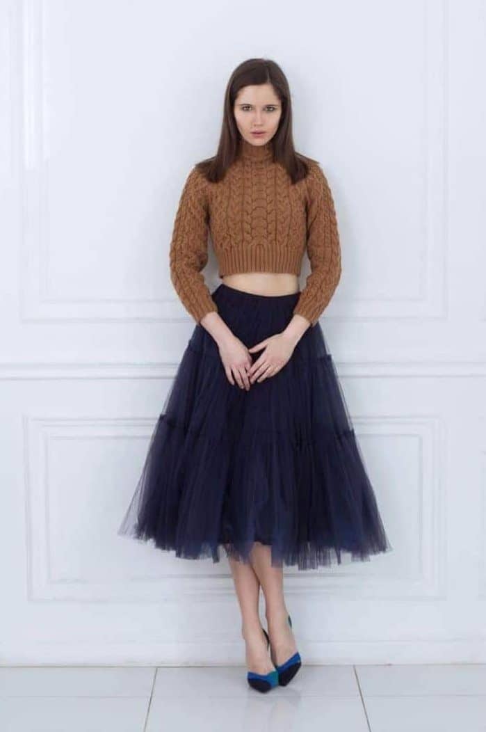 A practical solution is to choose a sweater in the color of the skirt itself. The main thing here is to choose the length of the skirt itself. If the skirt is short, then the sweater should be at your waist. If the length of the skirt is up to the knee, then the sweater can be worn even longer or leave the entire same length.