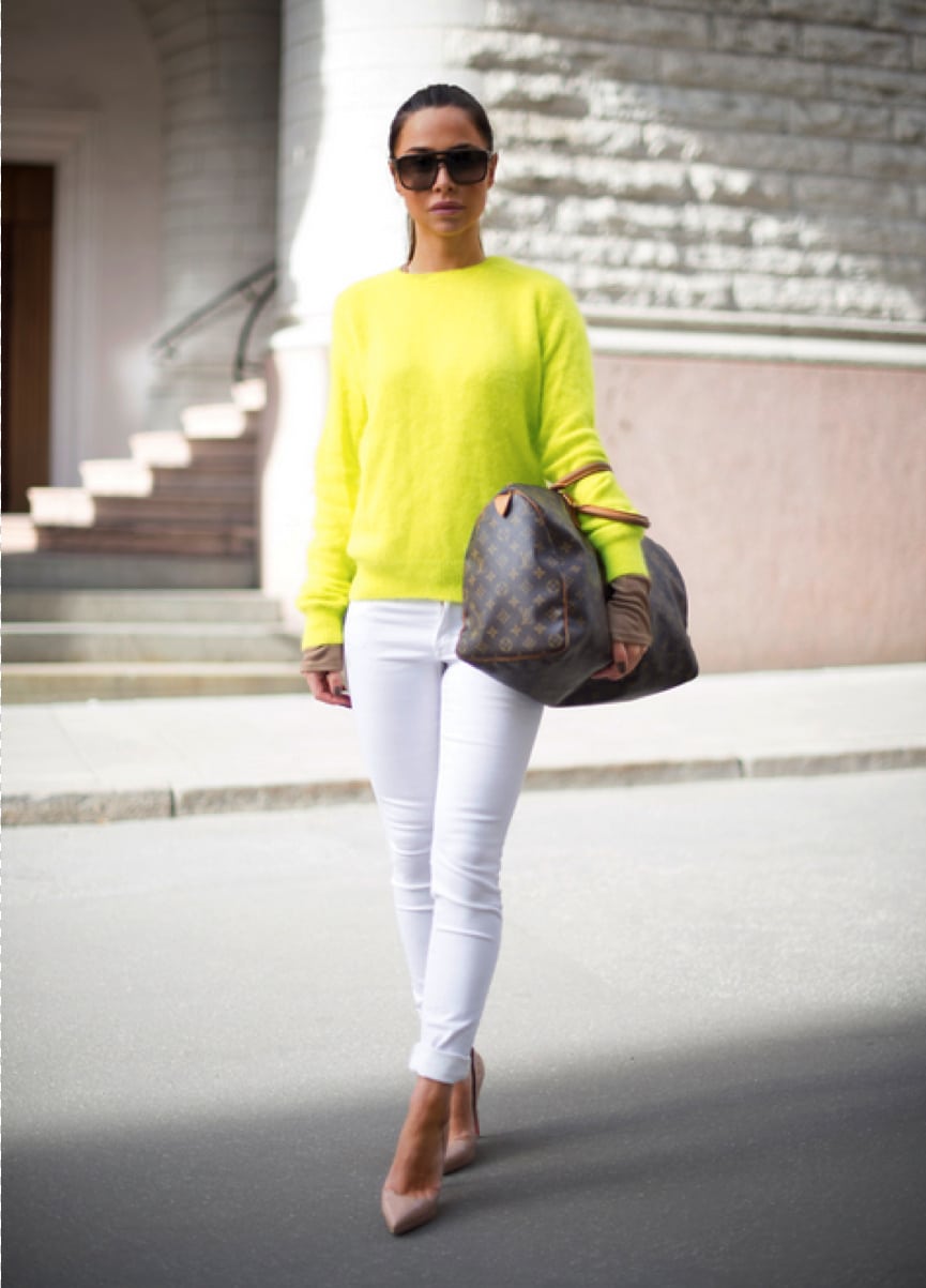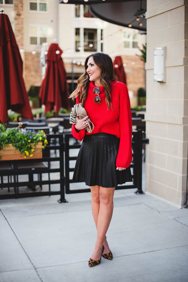 The bright color of the sweater will go well with a black skirt.