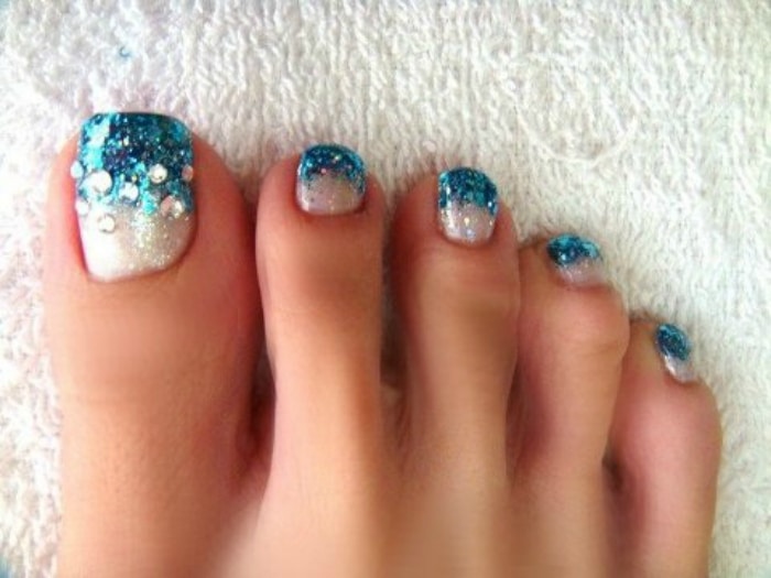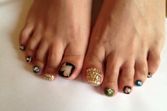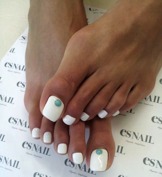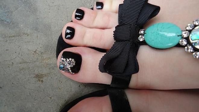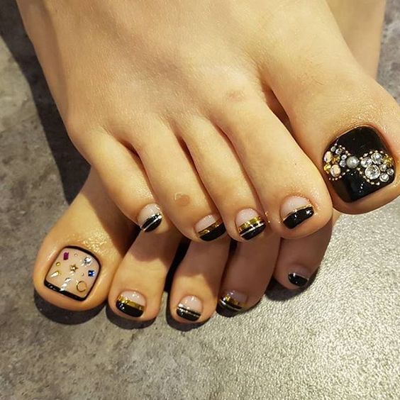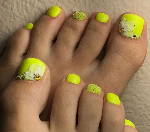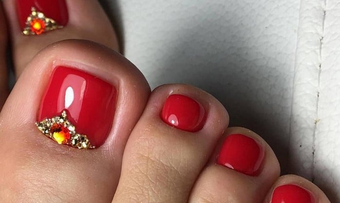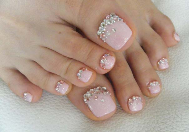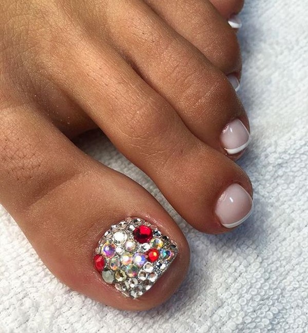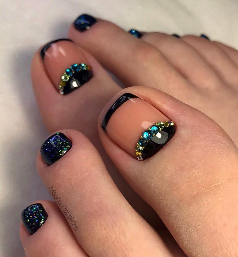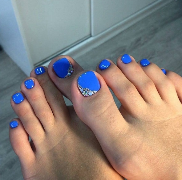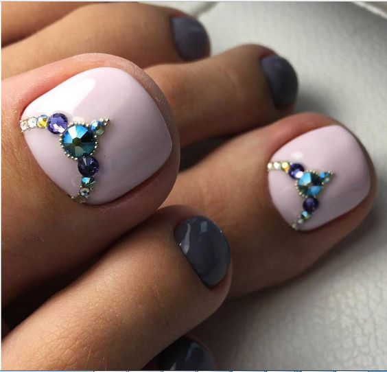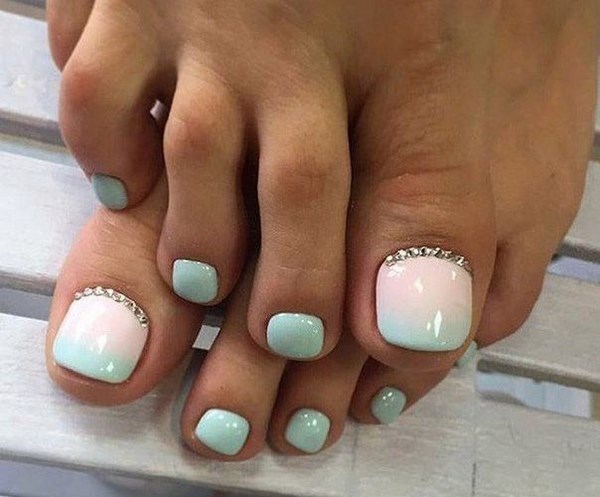 It is impossible to imagine a summer pedicure without rhinestones. Despite the fact that rhinestones have long been used by nail service masters to decorate nails, they do not go out of style. There are many uses for rhinestones in pedicure design. Just one small small pebble is able to turn a everyday monophonic pedicure into a smart one. From rhinestones, you can lay out drawings, supplement them with other design techniques, or even completely highlight the nail with stones.