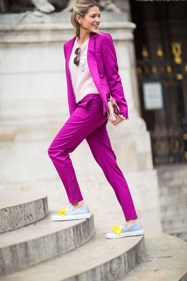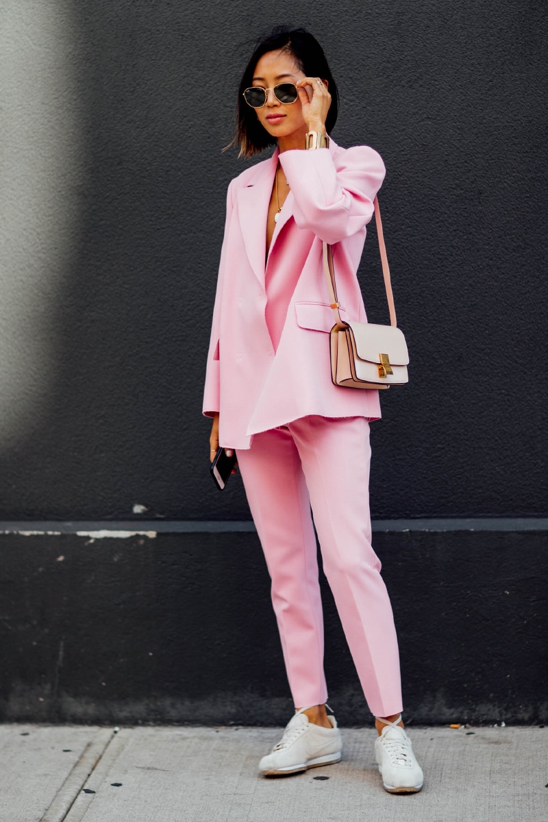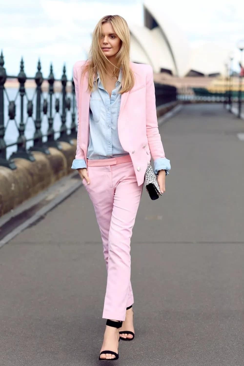 Pantsuit has always been a classic that does not go out of fashion. Now it is the most fashionable trend. All designers presented at least one version of the costume. Monochrome pink suits perfectly complement your wardrobe and give it brightness. You can choose pastel pale pink or bright and juicy pink. Give preference to an elongated jacket. And trousers can be of different cuts and silhouettes. The main thing when choosing a costume is the lack of a hint of formality. Therefore, you can choose any shoes, both with heels and sports shoes.