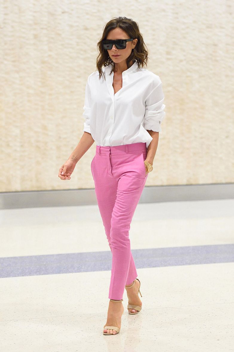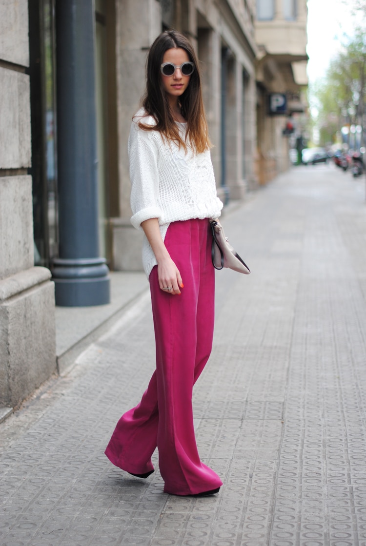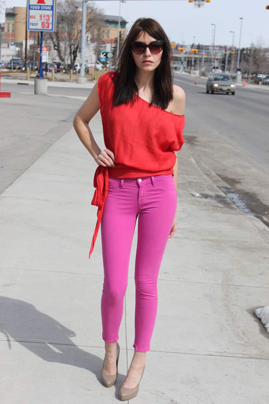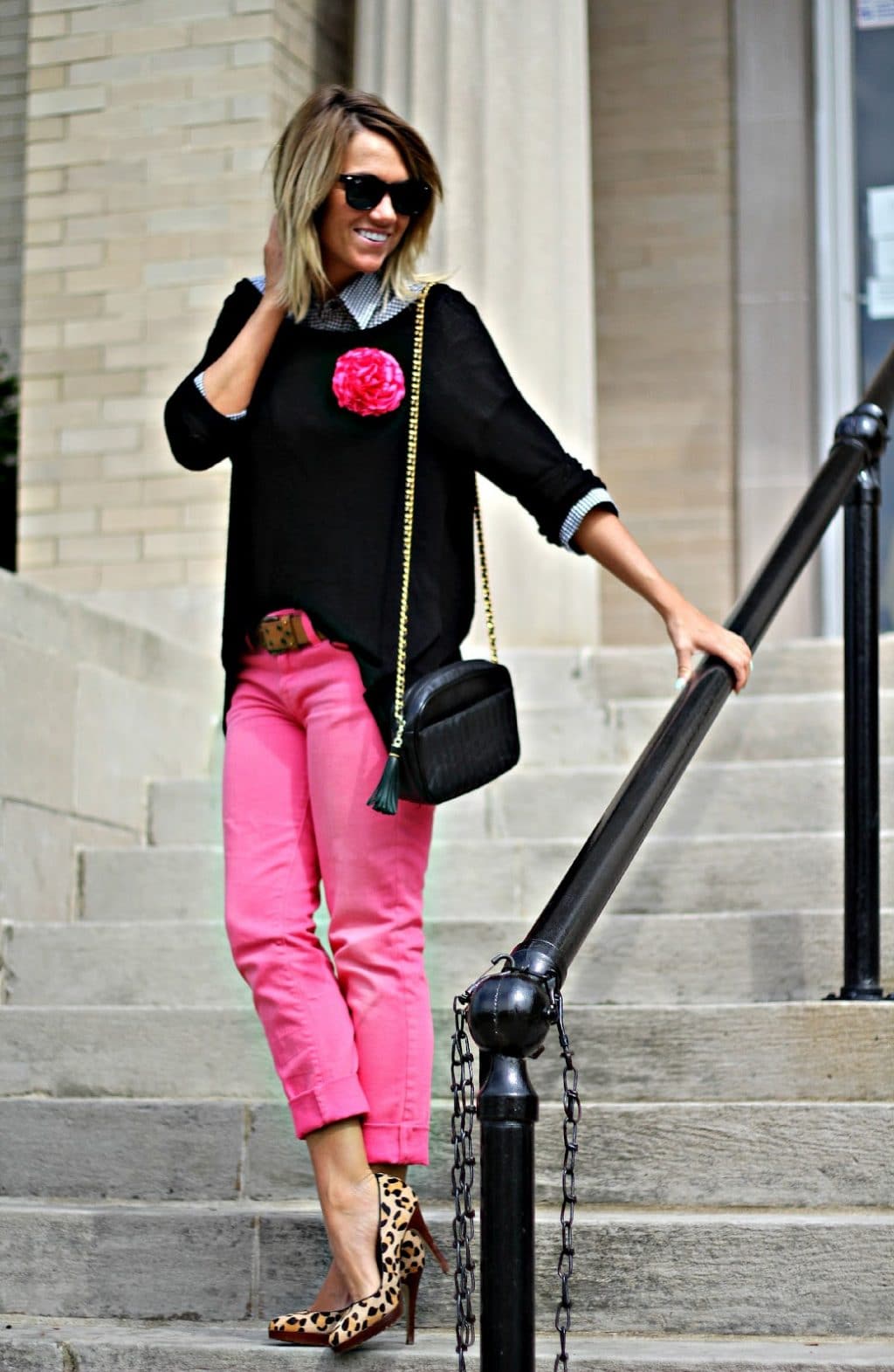 If you think that you do not like pink, but really want to wear it, then the option of pink trousers is for you. In this case, you remove the pink from the face and then you can choose any shade of pink. Pink pants can be combined with a t-shirt, shirt or blouse. With solid pink trousers, solid pastel and basic dark colors of the top are suitable. Wear pale pink trousers and a bright top. For example, red, orange, bright blue, the one that suits you best. Try to put on a top or a blouse with a print, it can be a large picture or an inscription. But be careful not to seem like a teenage girl.