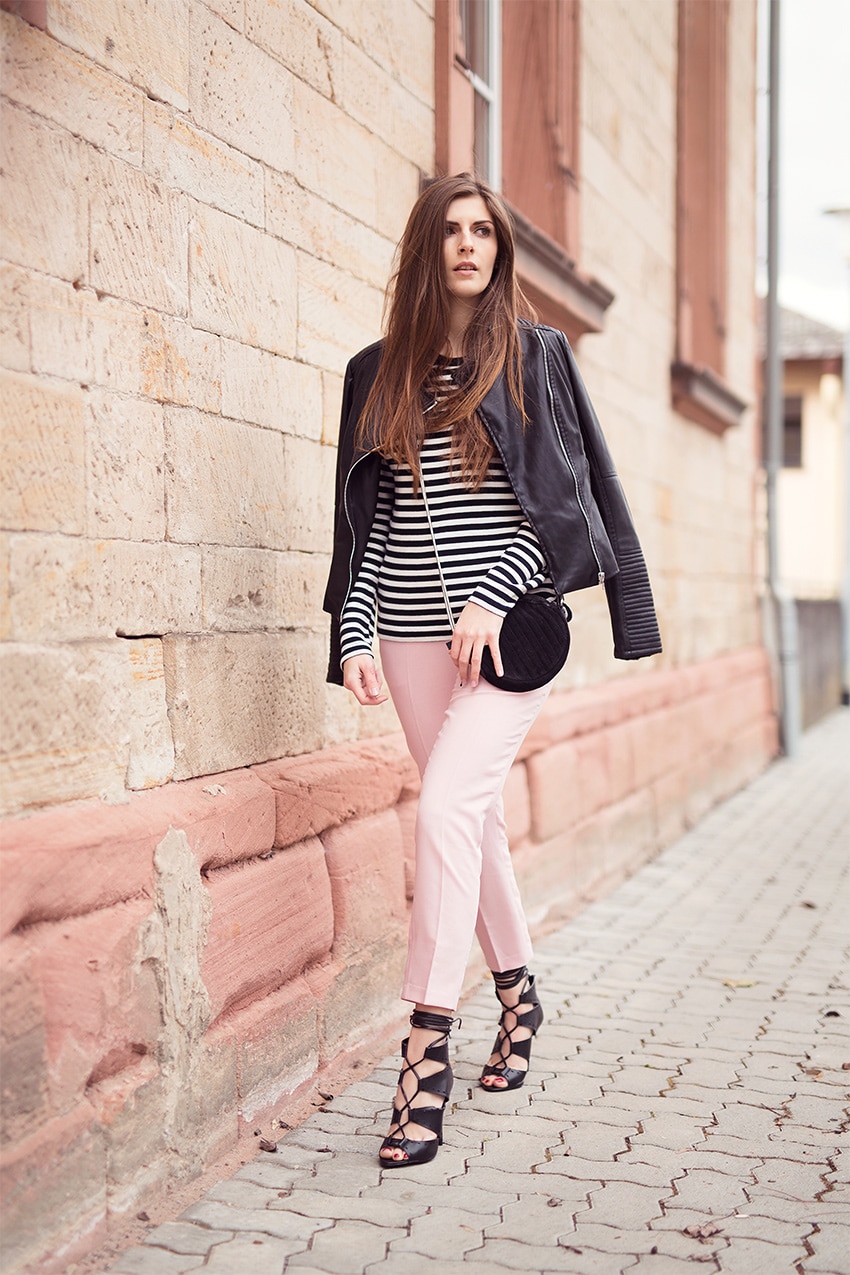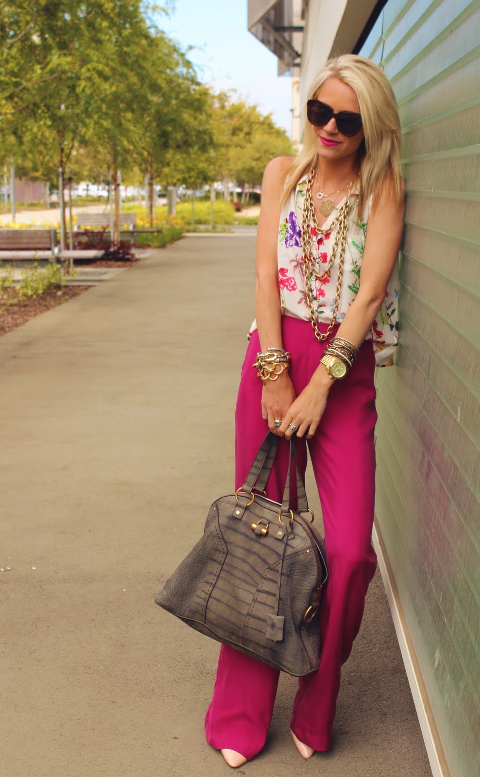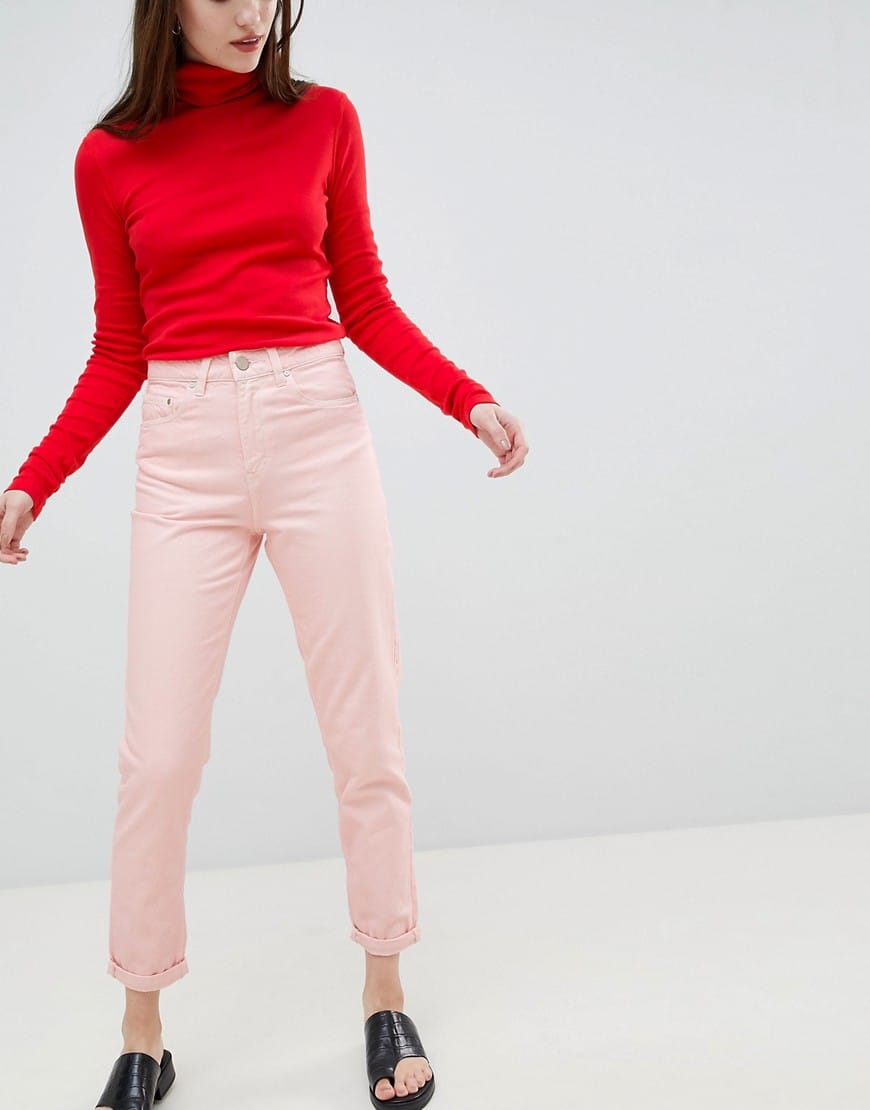 If you think that you do not like pink, but really want to wear it, then the option of pink trousers is for you. In this case, you remove the pink from the face and then you can choose any shade of pink. Pink pants can be combined with a t-shirt, shirt or blouse. With solid pink trousers, solid pastel and basic dark colors of the top are suitable. Wear pale pink trousers and a bright top. For example, red, orange, bright blue, the one that suits you best. Try to put on a top or a blouse with a print, it can be a large picture or an inscription. But be careful not to seem like a teenage girl.