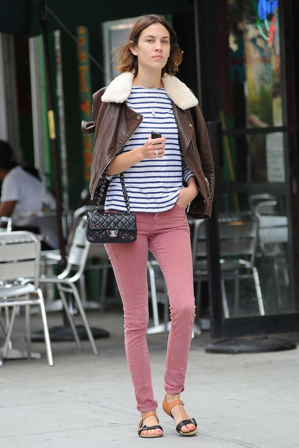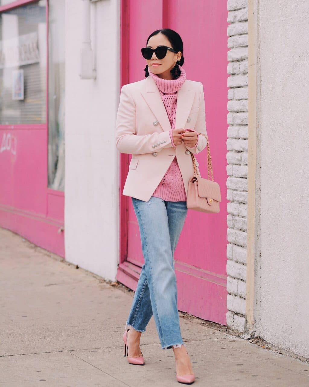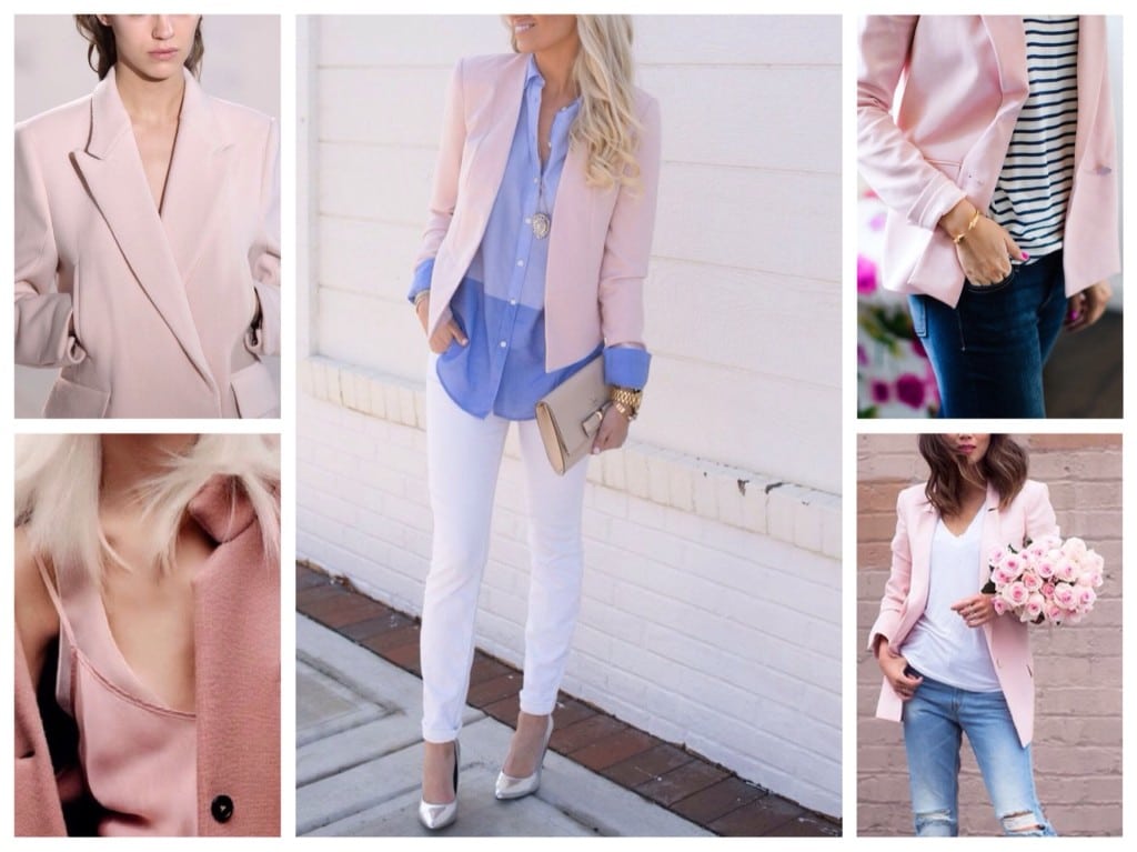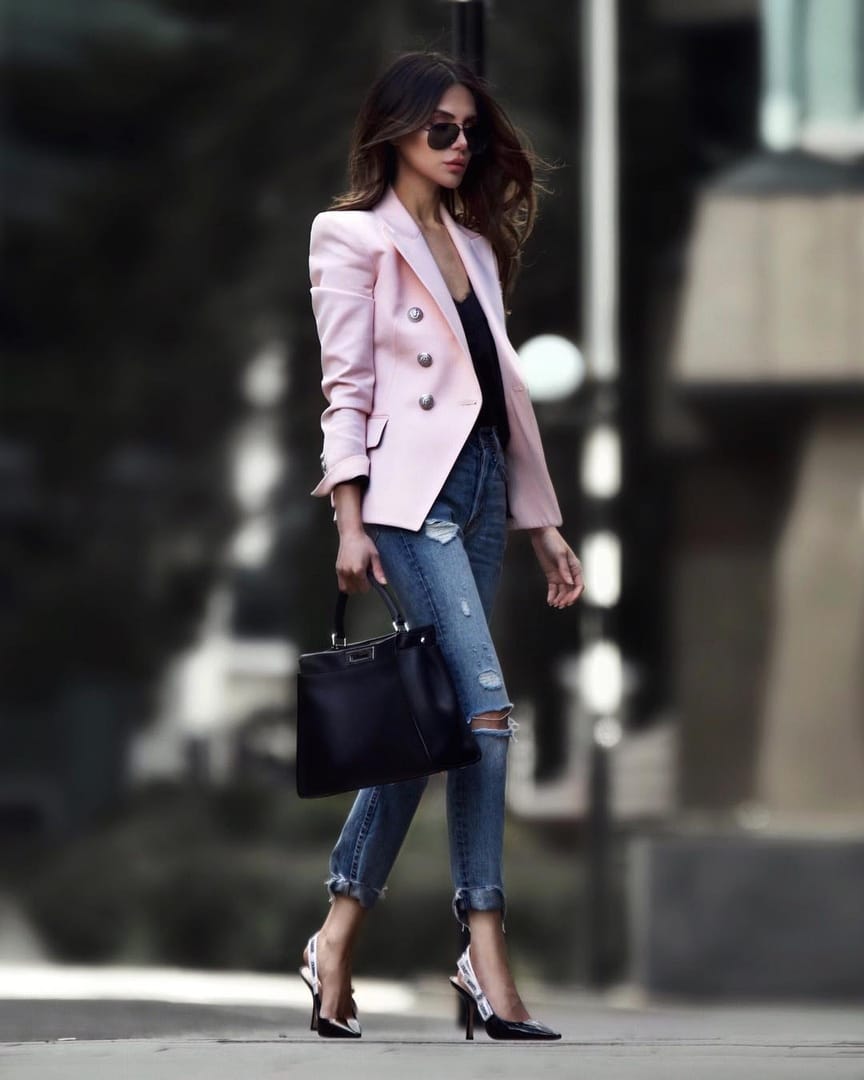 For lovers of the classic style in clothes, a pale pink jacket is perfect. He will not be evident, but gently emphasize your femininity. The most delicate option with such a jacket would be to combine it with white or beige things. You will look like an airy and flirty person. With this, it is best to combine pumps, preferably beige. And the same not so flashy bag, for example, beige, white, brown, light gray.