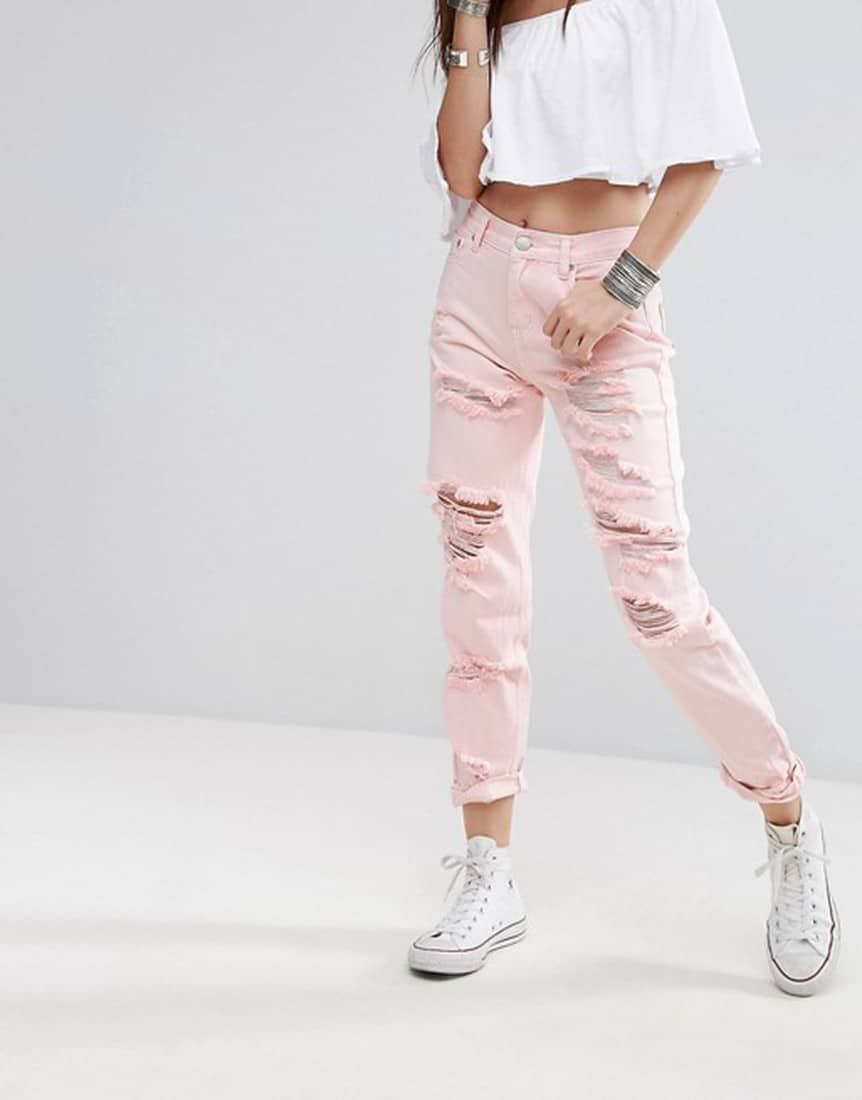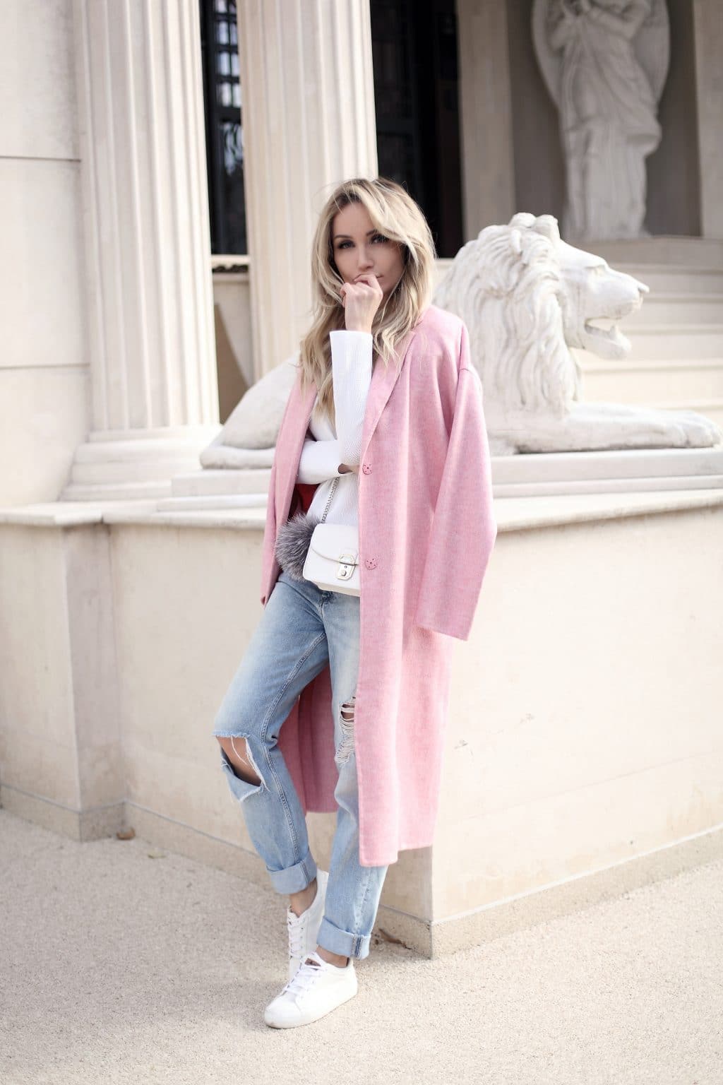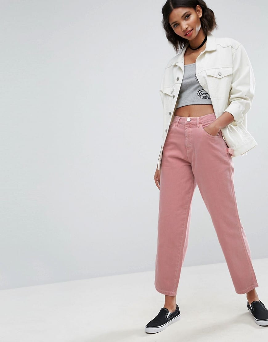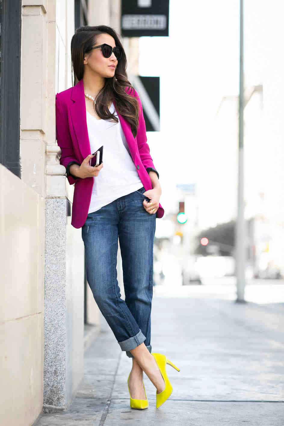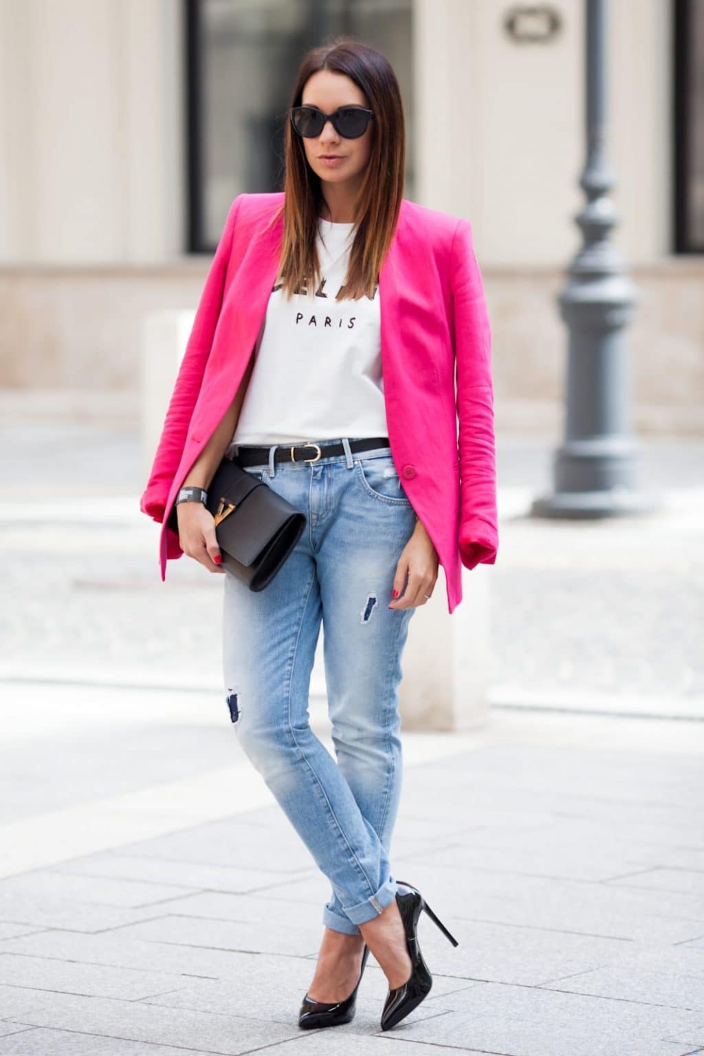 For lovers of being in the spotlight, there are bright shades of pink. Torn jeans are perfect for such a jacket. From shoes you can choose heeled shoes, it will be such a fashionable street style. Your image will combine femininity and audacity at the same time. Or you can choose sneakers for a casual look.