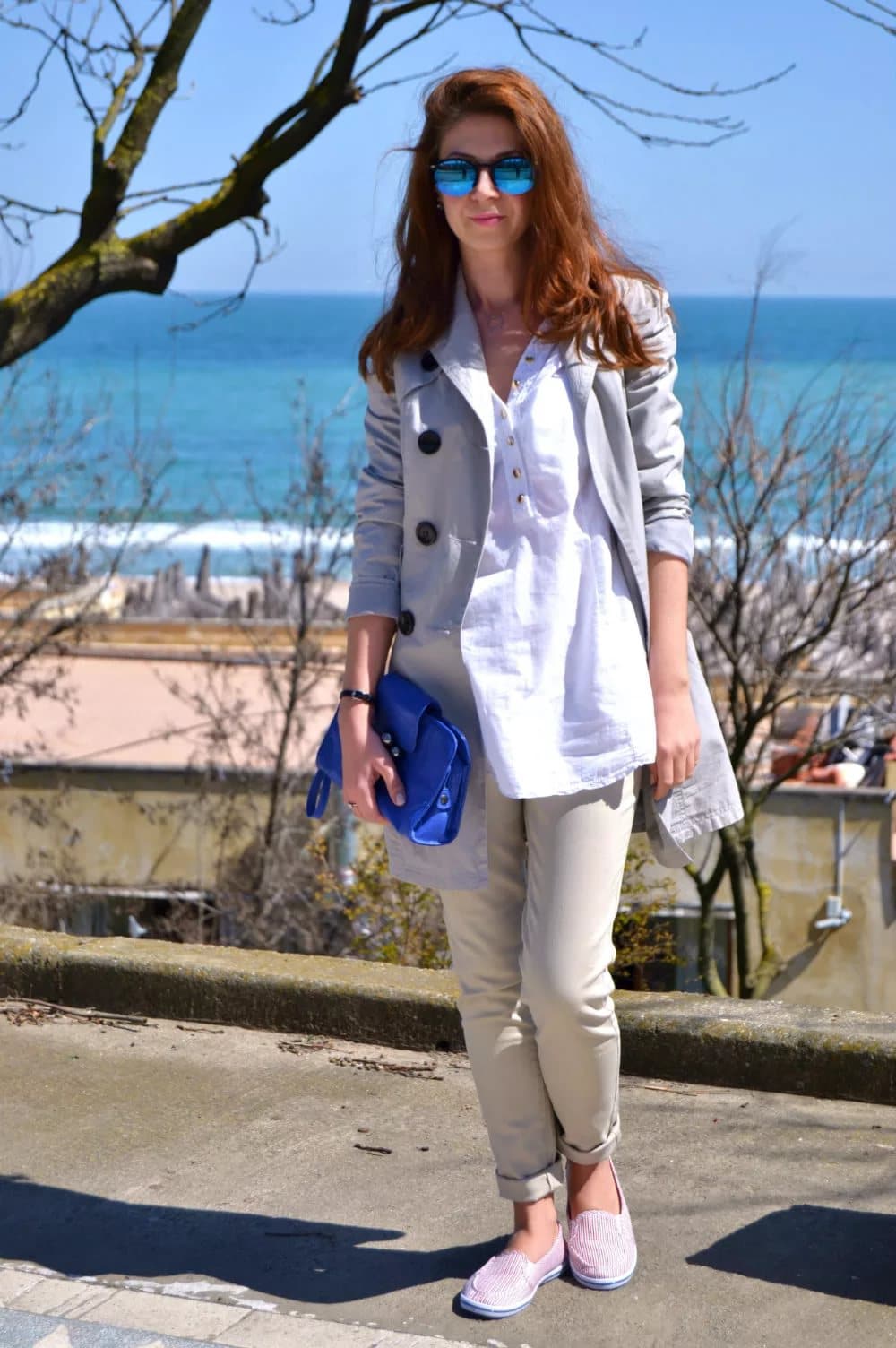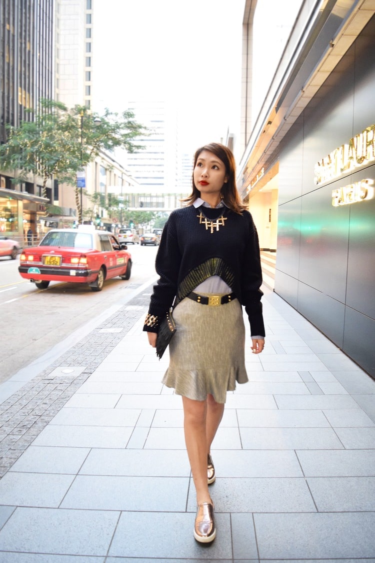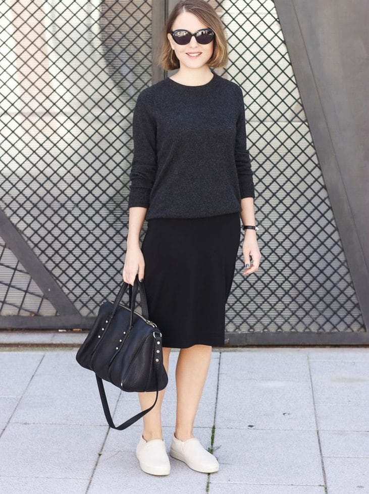 If you want to go to work wearing slip-ons? No problem. Slip-ons combined with a white shirt tucked into a strict pencil skirt in dark blue, and a great bow is ready!