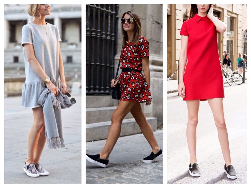 The most common look is black slip-ons. With them it is easy to combine many things from your wardrobe, and in particular with dresses.
