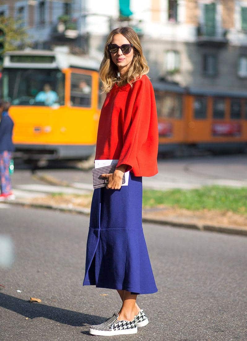 Bright shirts, sweaters, T-shirts will perfectly dilute your look. The most important thing is to combine the right colors. If you want a bright top, then the skirt should be black, white or another universal color. Slipons in this case can be bright in the color of the top. But if you prefer a bright skirt and the same top, then slip-ons must necessarily be of a universal color. Otherwise, you will be full of colors, and the image will turn out to be lurid.