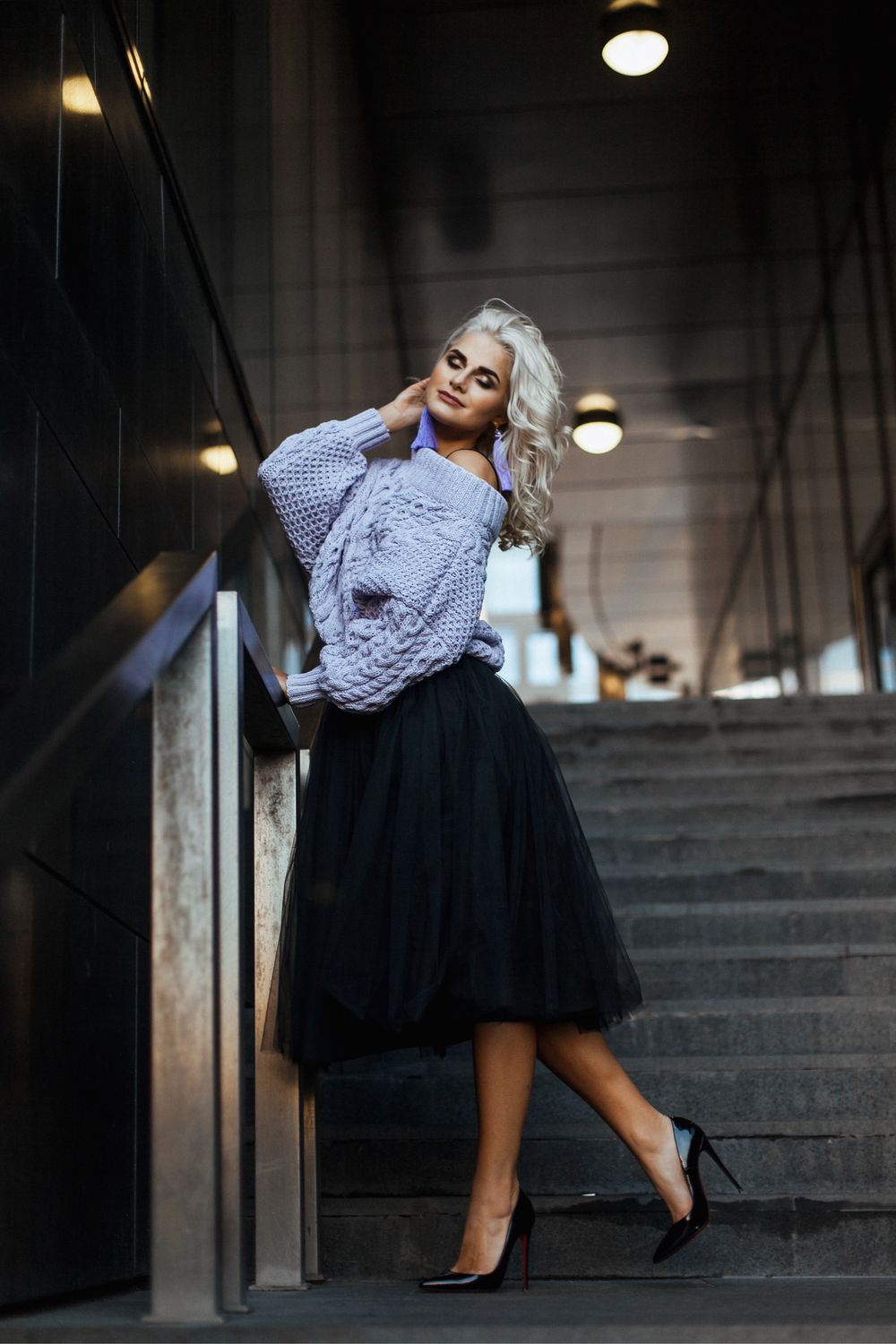 Winter is not a reason to postpone your favorite pack until warm time. An image with a sweater will be very cute and cozy. You put on a pack of skirts, and on top of a large and voluminous sweater. It can be an oversized sweater, with braids, with a high neck or without. Do not forget about tights. Now this is not just a warm thing, but a chic addition to the image. They can be polka-dotted, with small hearts or simply dense, but of an interesting color, for example, gray, milky, can be bright shades.