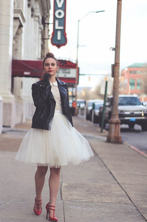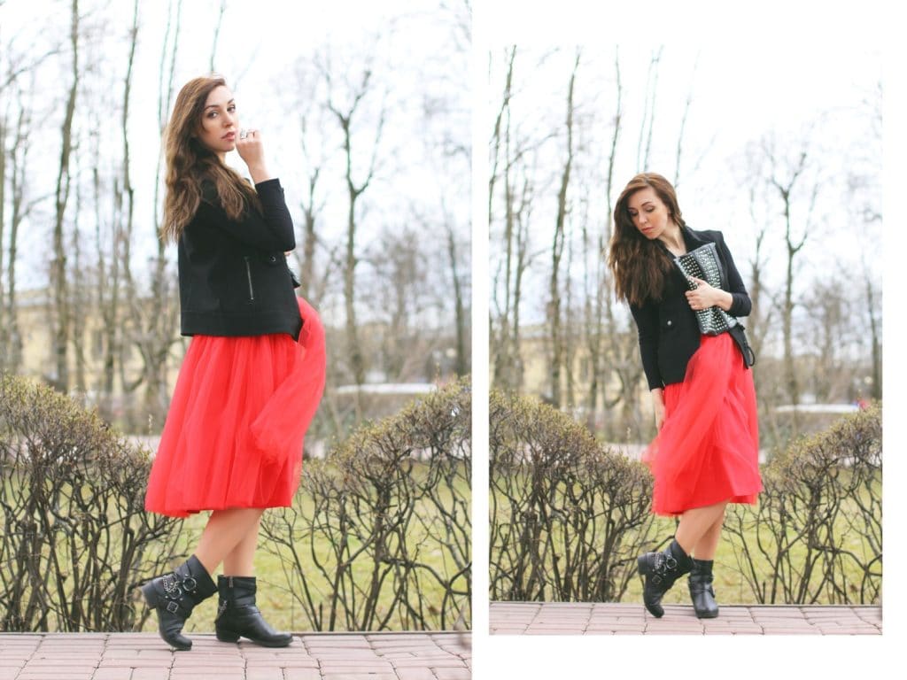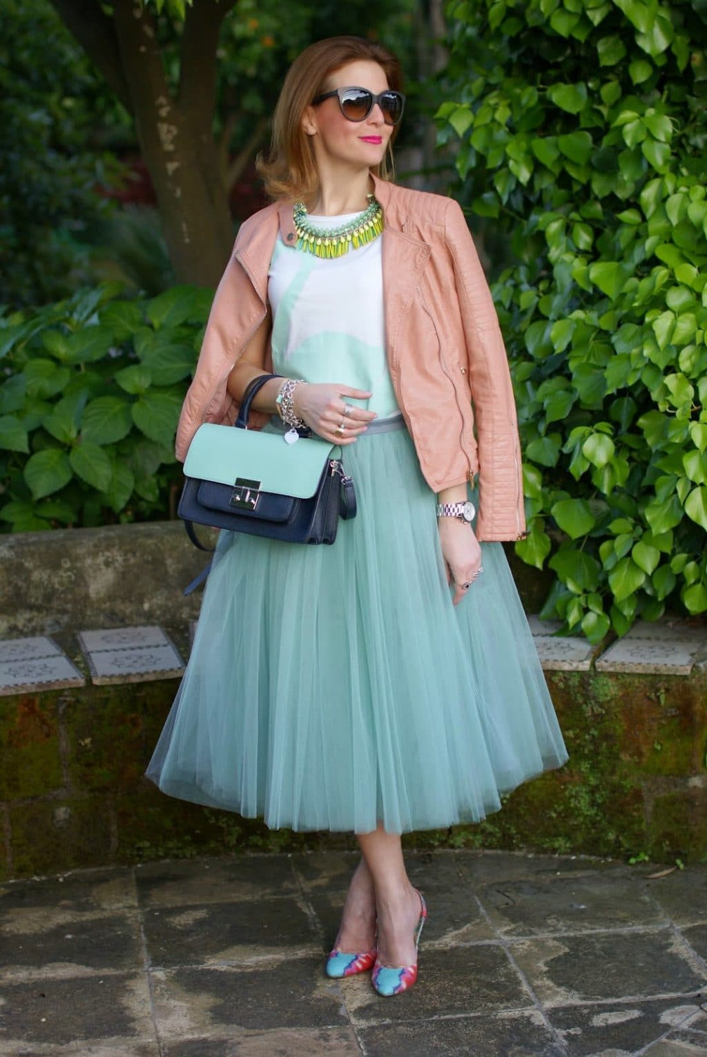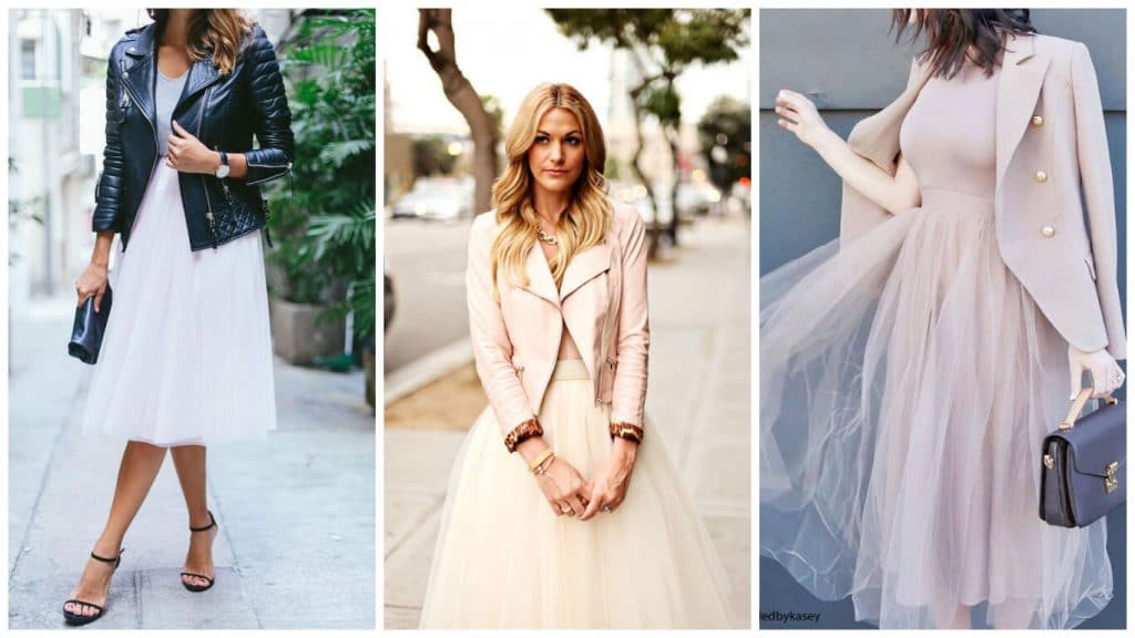 Want a cheeky and brutal look? Everything is simple! To do this, just throw on top of a T-shirt or sweater leather jacket. It will be even better if it is a jacket and a little more than your size, as if “from a man’s shoulder”. So the jacket slightly covers the top of the skirt and makes it less magnificent, but no less stylish.