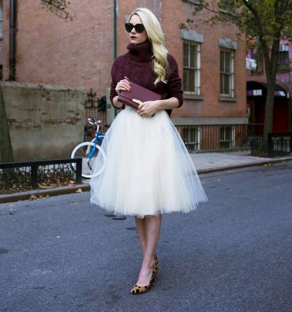 A simple combination for those who are just starting to wear a tutu skirt. A simple cardigan will emphasize your slim and sophisticated top. A jumper can be both tucked in a skirt and for graduation. It will be better to wear striped or plain, so you will be feminine. For girls who want to show a thin waist, emphasize it with an interesting belt. So you hide an elastic skirt and it will already be an elegant dress.