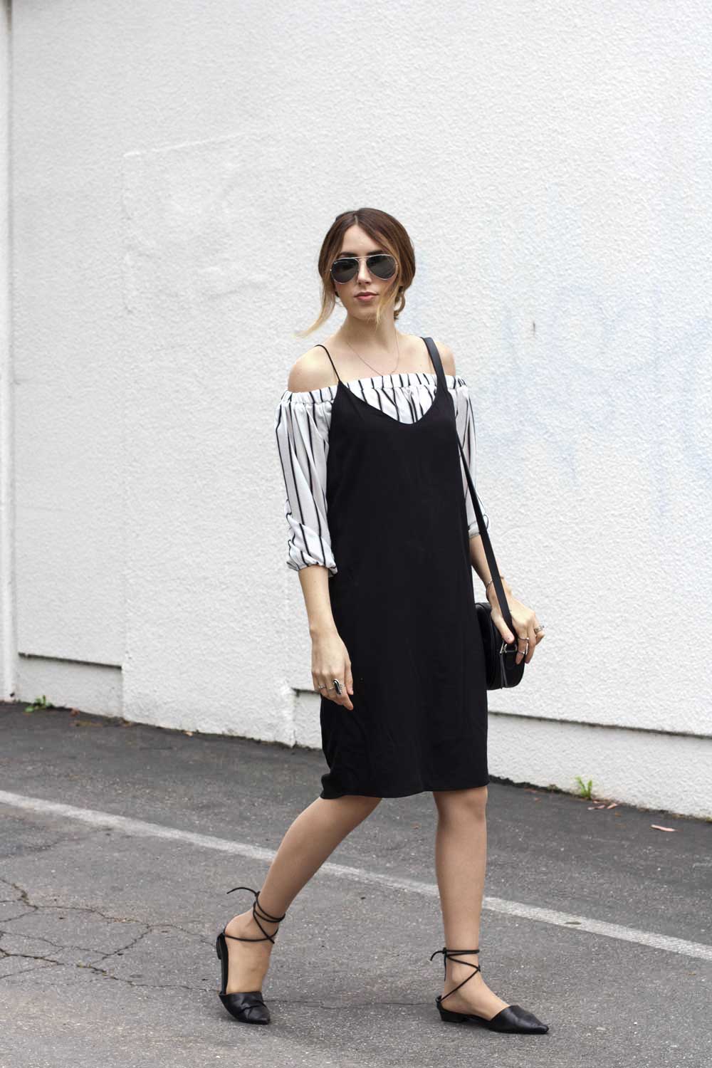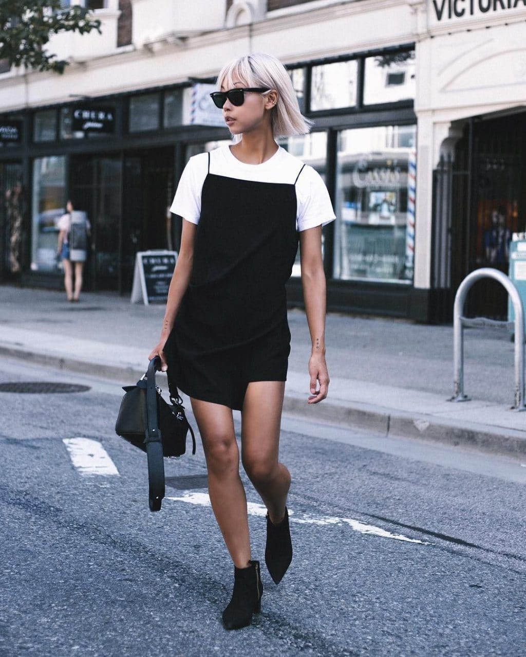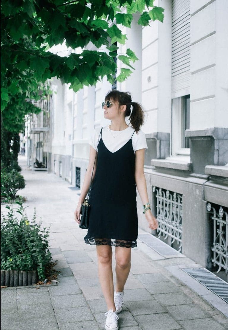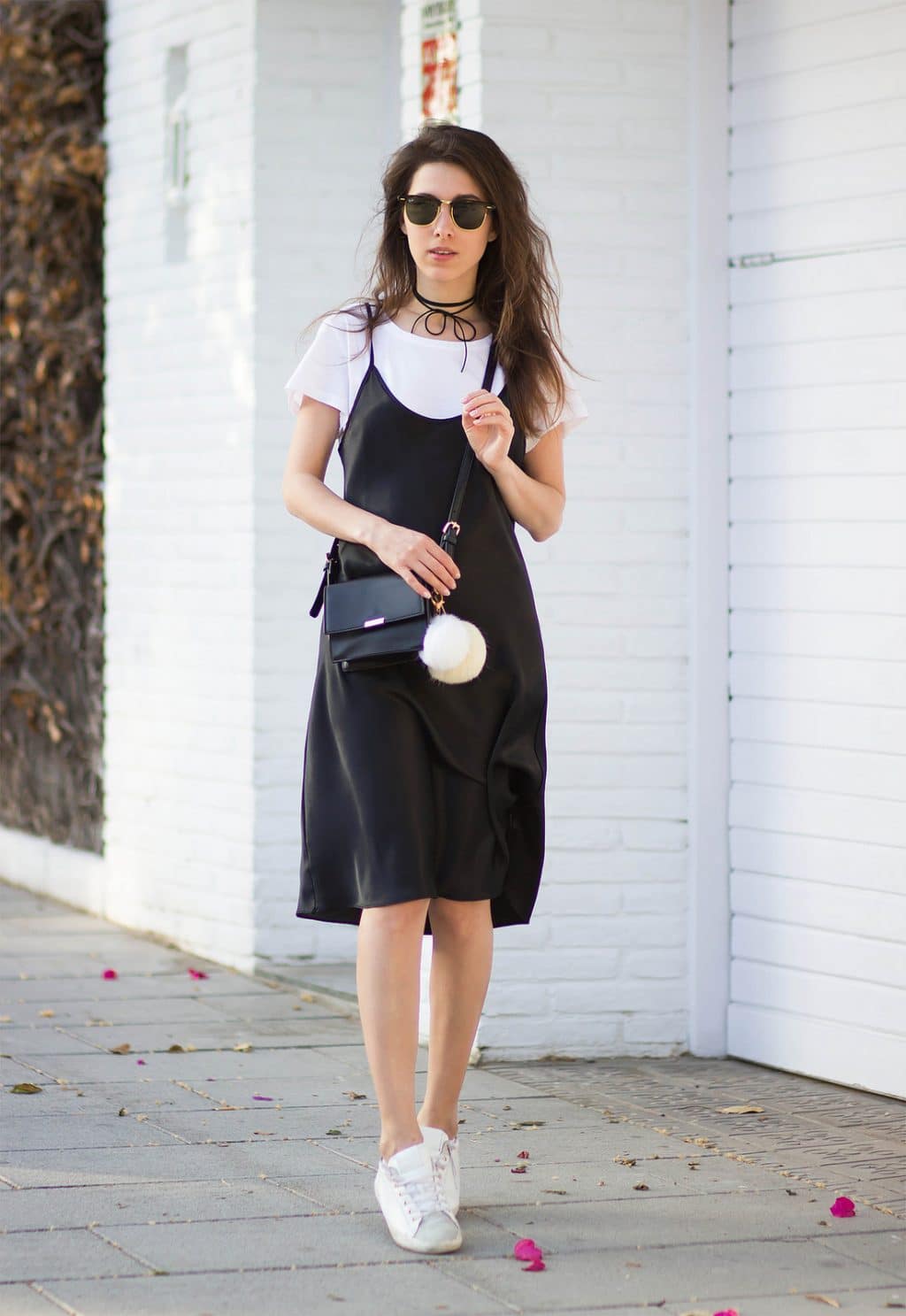 A sundress with a t-shirt is the favorite option of many American celebrities. Most often try on a white basic t-shirt. Any model of a sundress will suit her. Now a fashionable model in this way is a sundress in a linen style with lace. It can be cotton or satin. We choose any shoes, be it sandals, sneakers or high-heeled shoes.