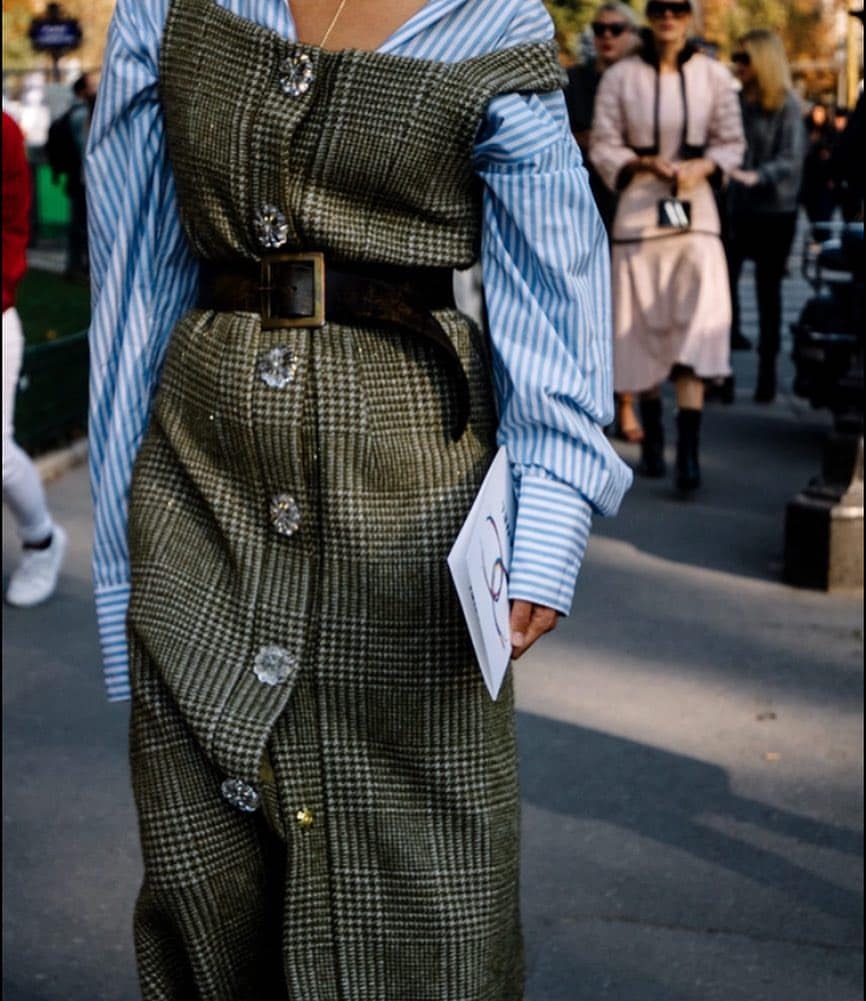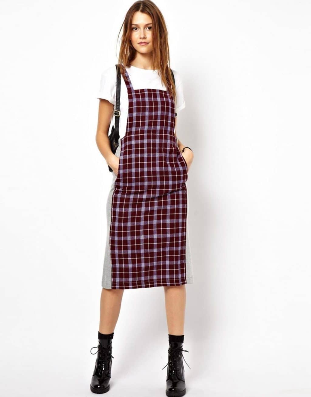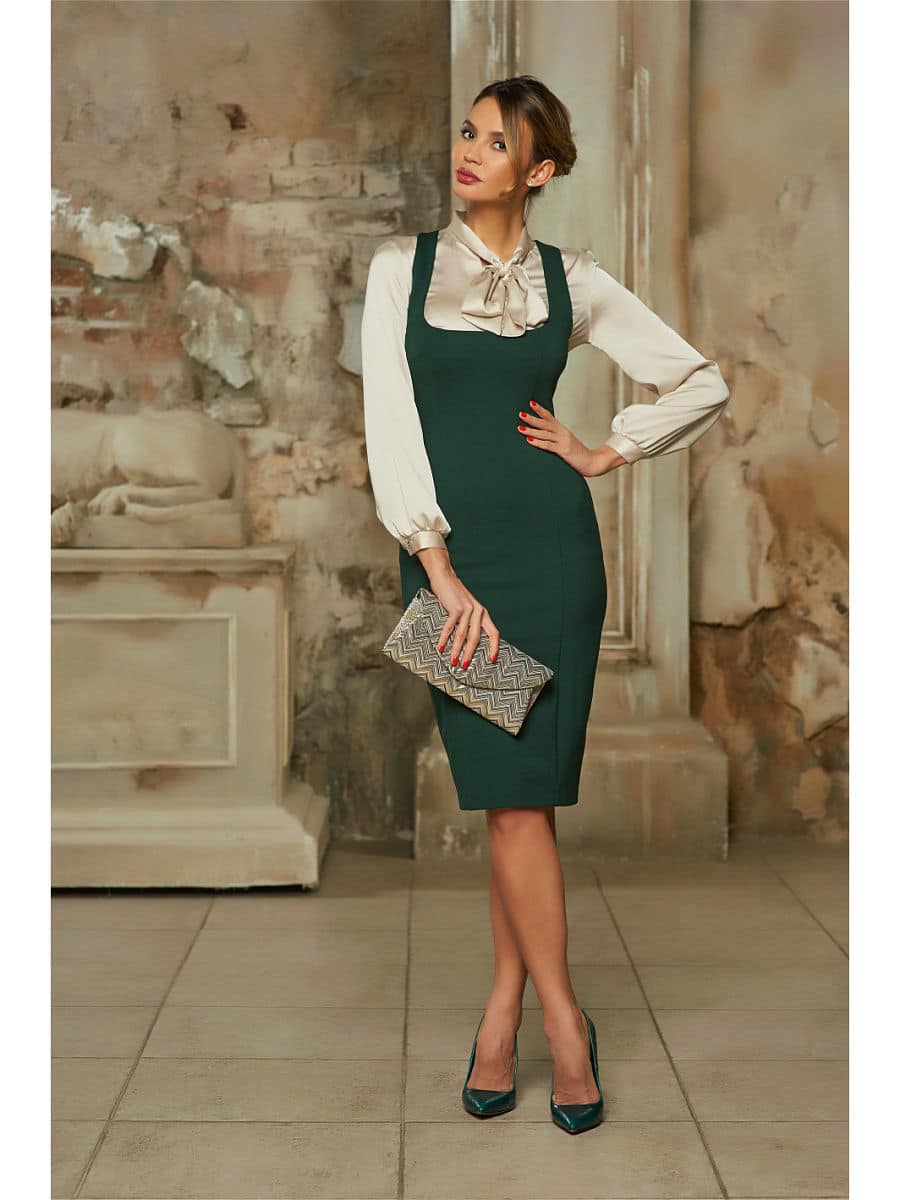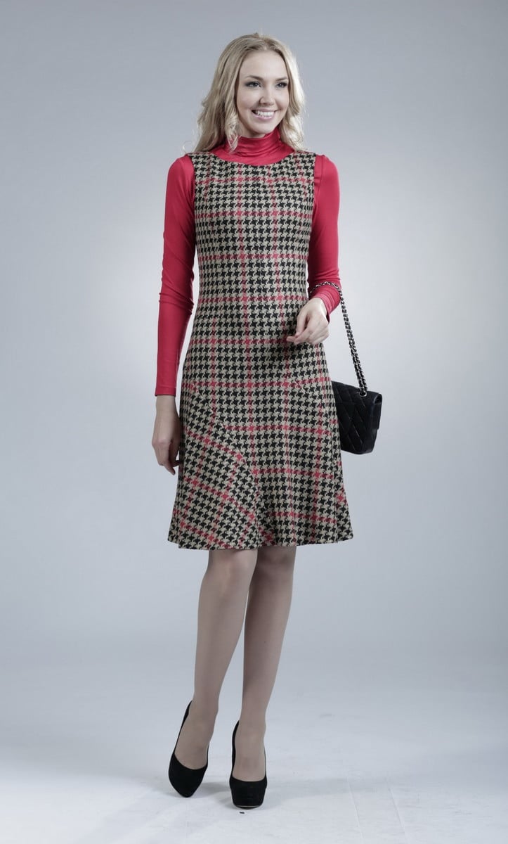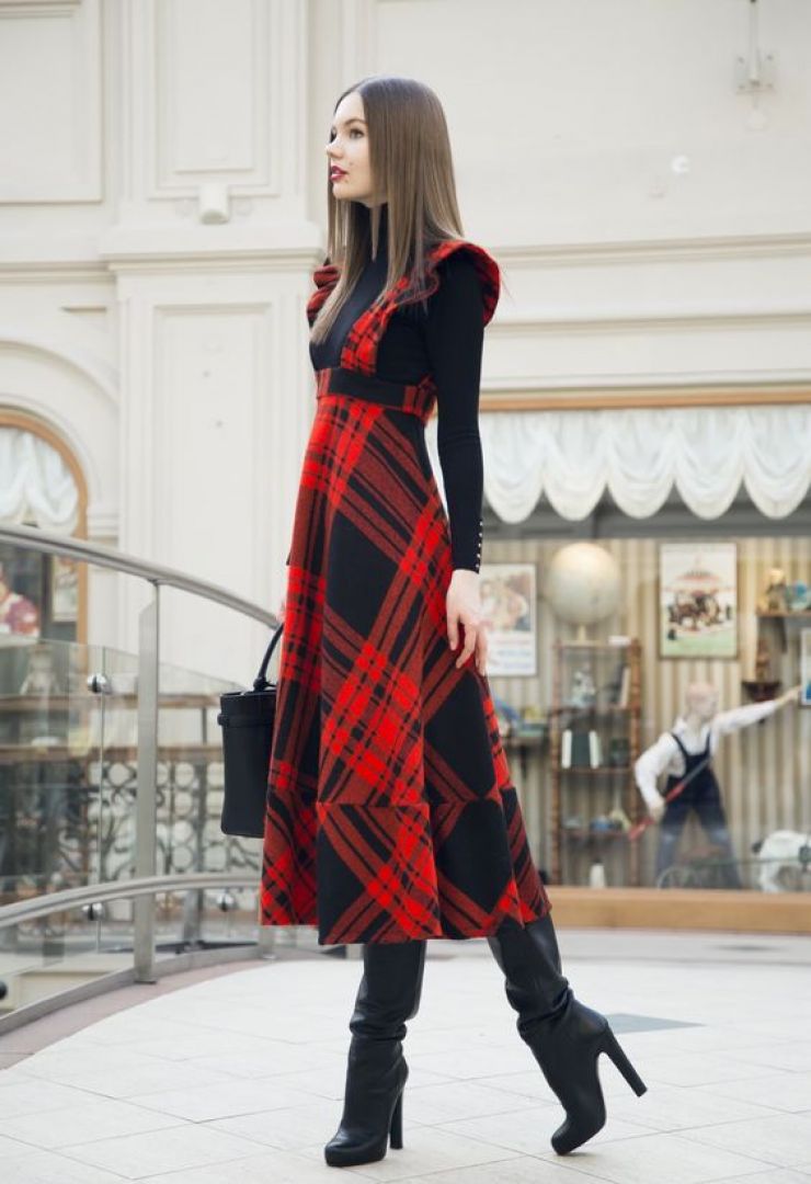For an office or just a more rigorous look, a combination of a fitted sundress and a cotton shirt or chiffon blouse is perfect. The dress itself is better to choose dark shades. Also, a checkered sundress will look very stylish. The “plaid” cage or goose foot is now at the peak of popularity.