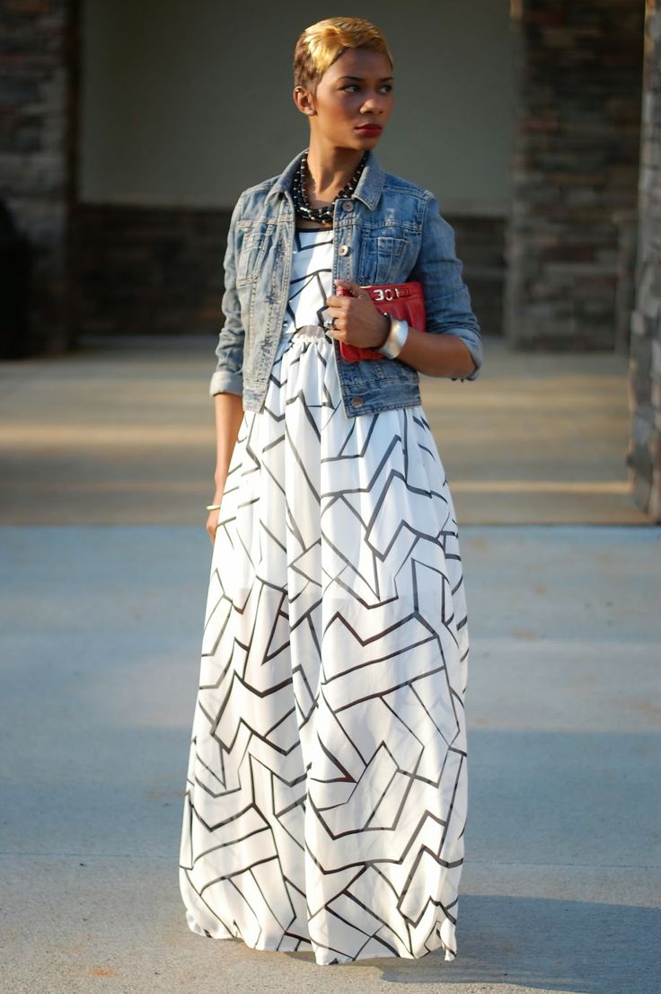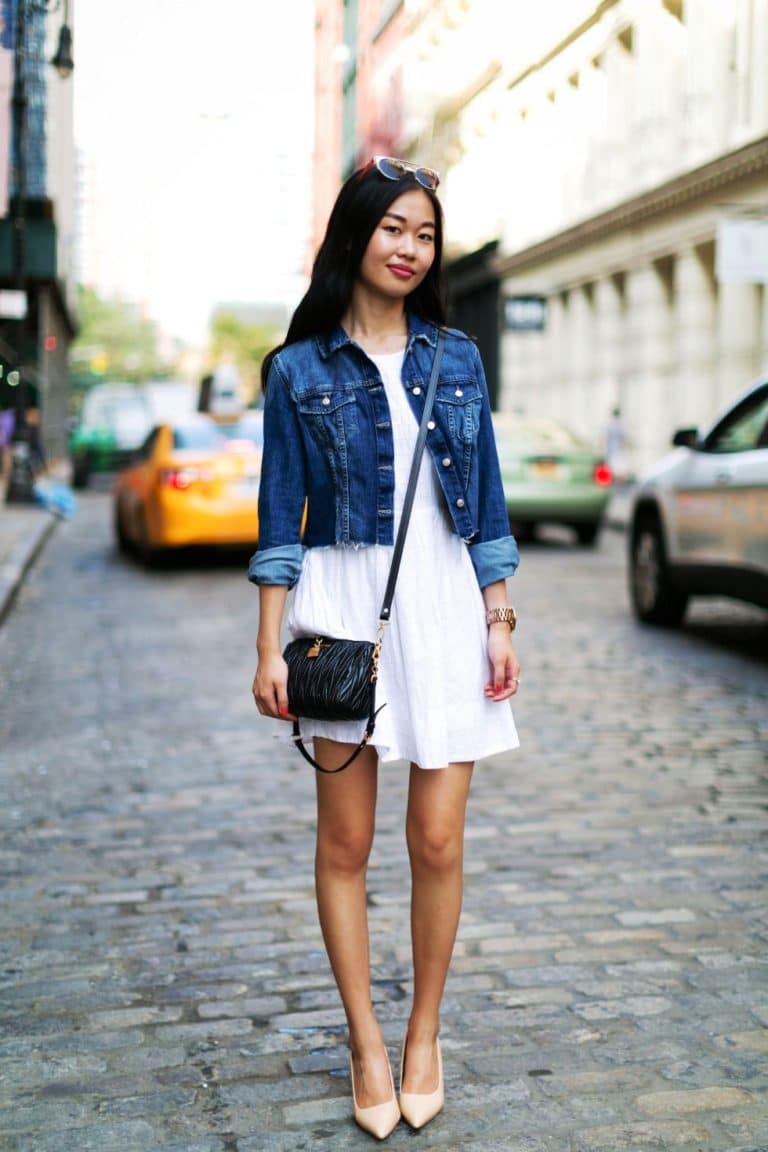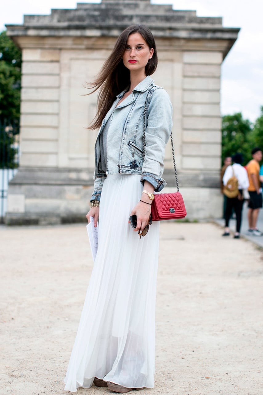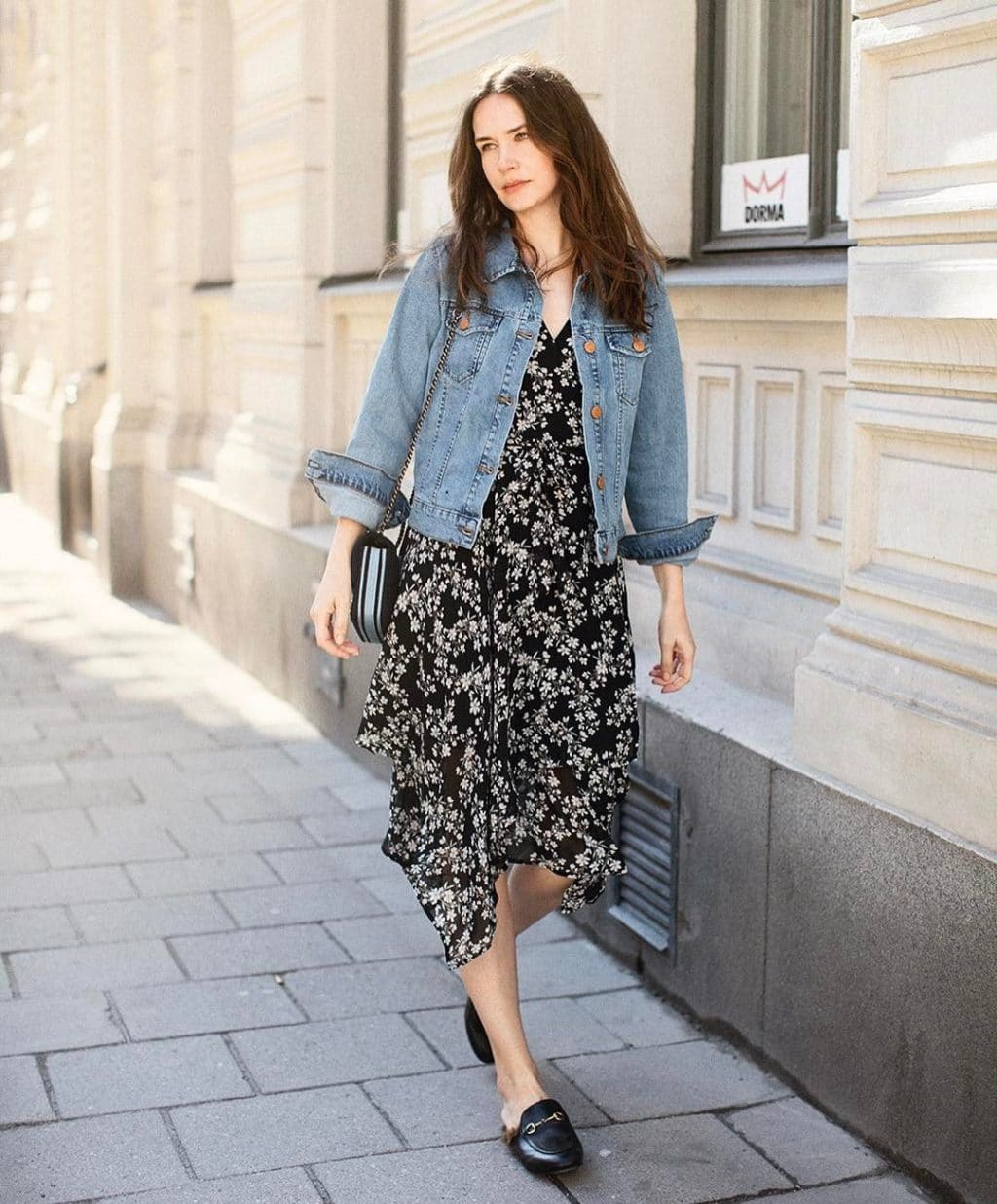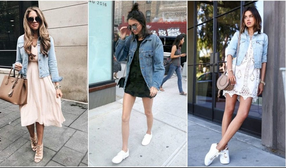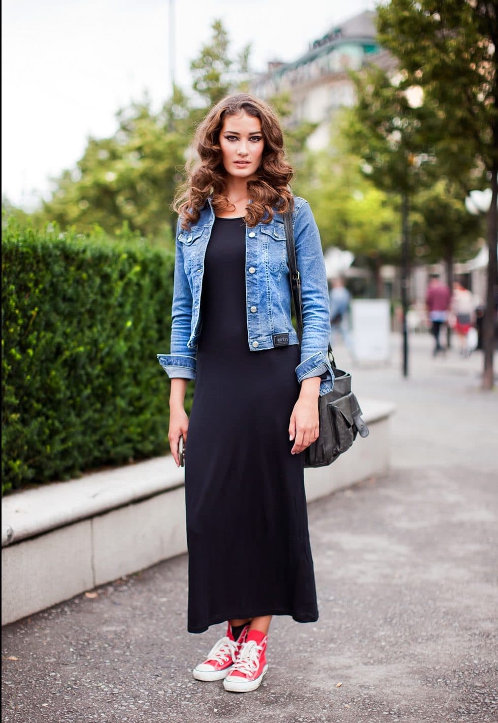 The perfect combination is to put on a denim jacket over a light and airy sundress. The sundress can be both monophonic and with a print. The sundress models on the floor will look great. This will give your image even more tenderness and femininity.
