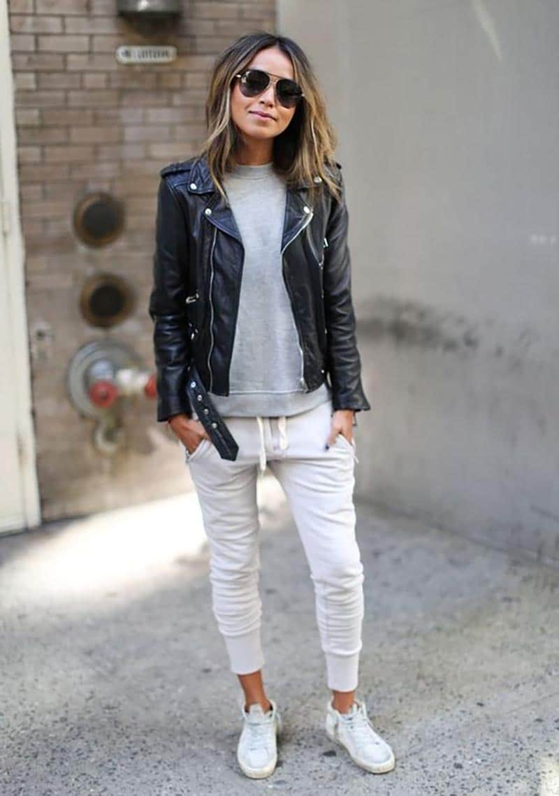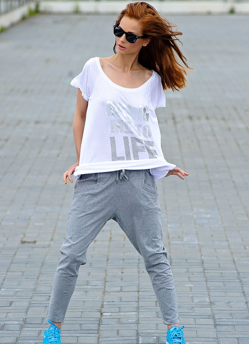 To create a free image, but at the same time stylish, use sweatpants and sneakers. On top you can wear gray or white T-shirts, and on top of a jacket-jackets.