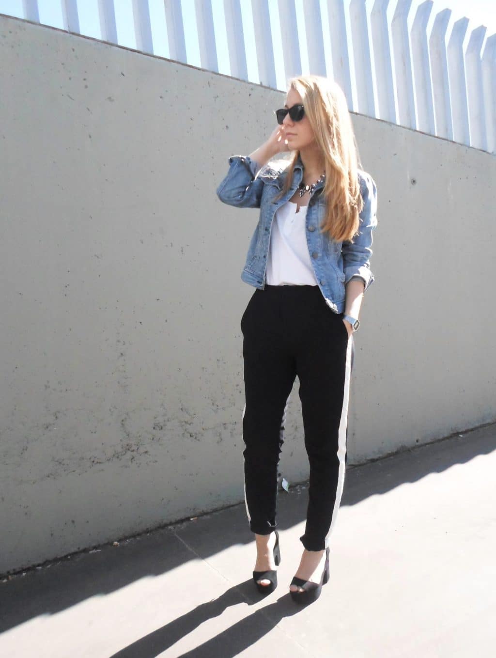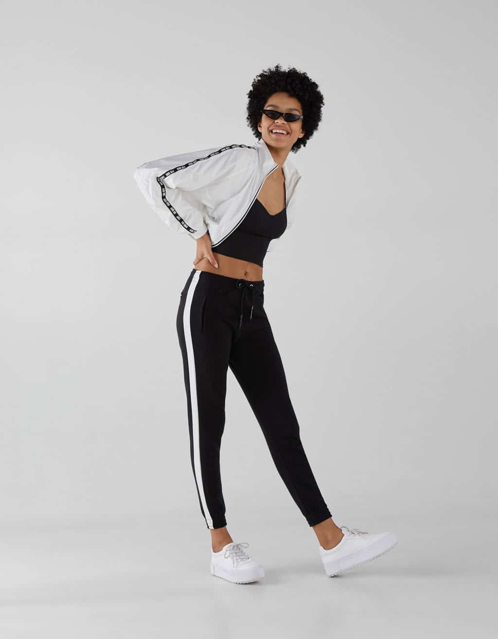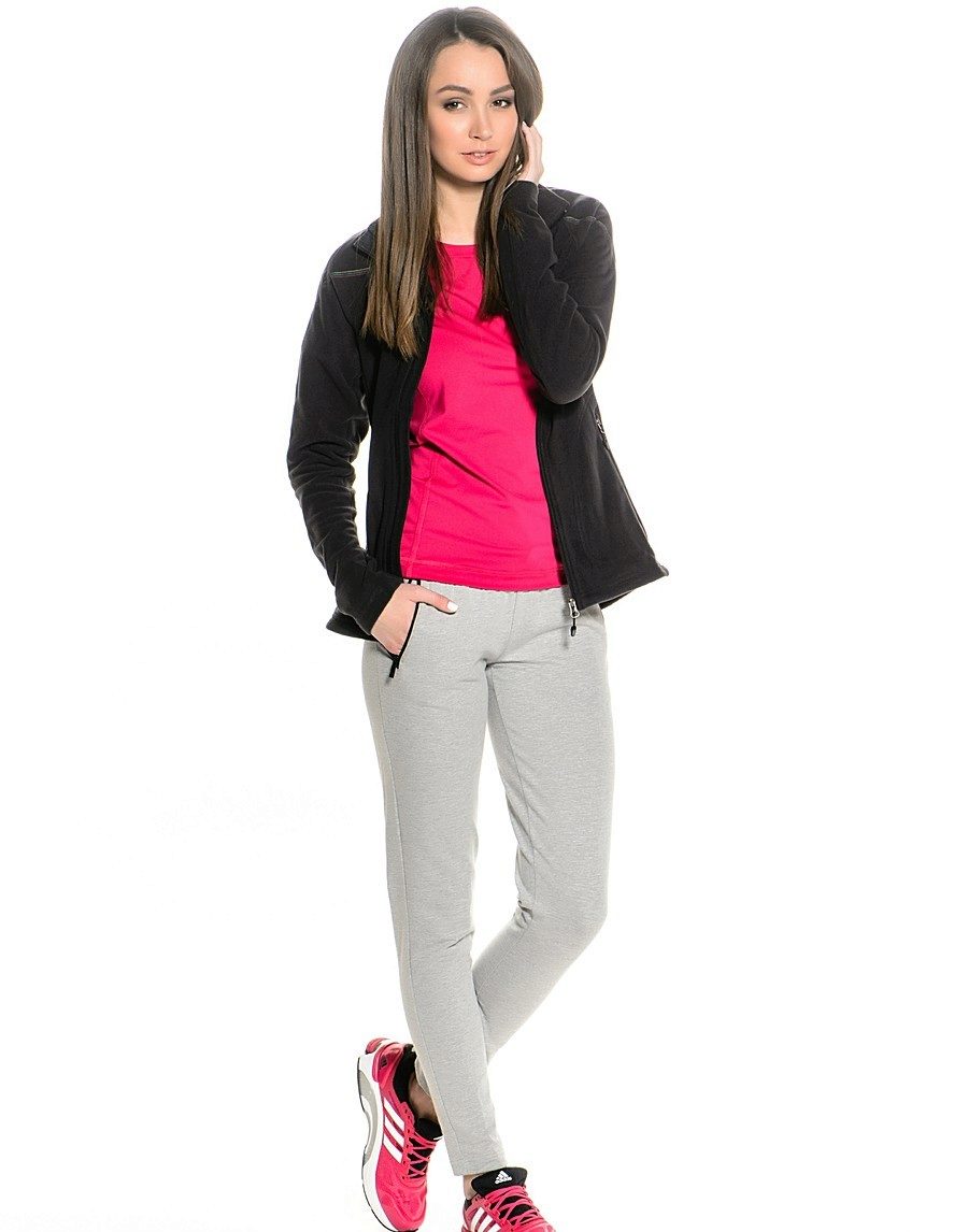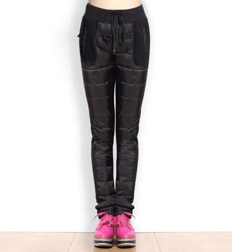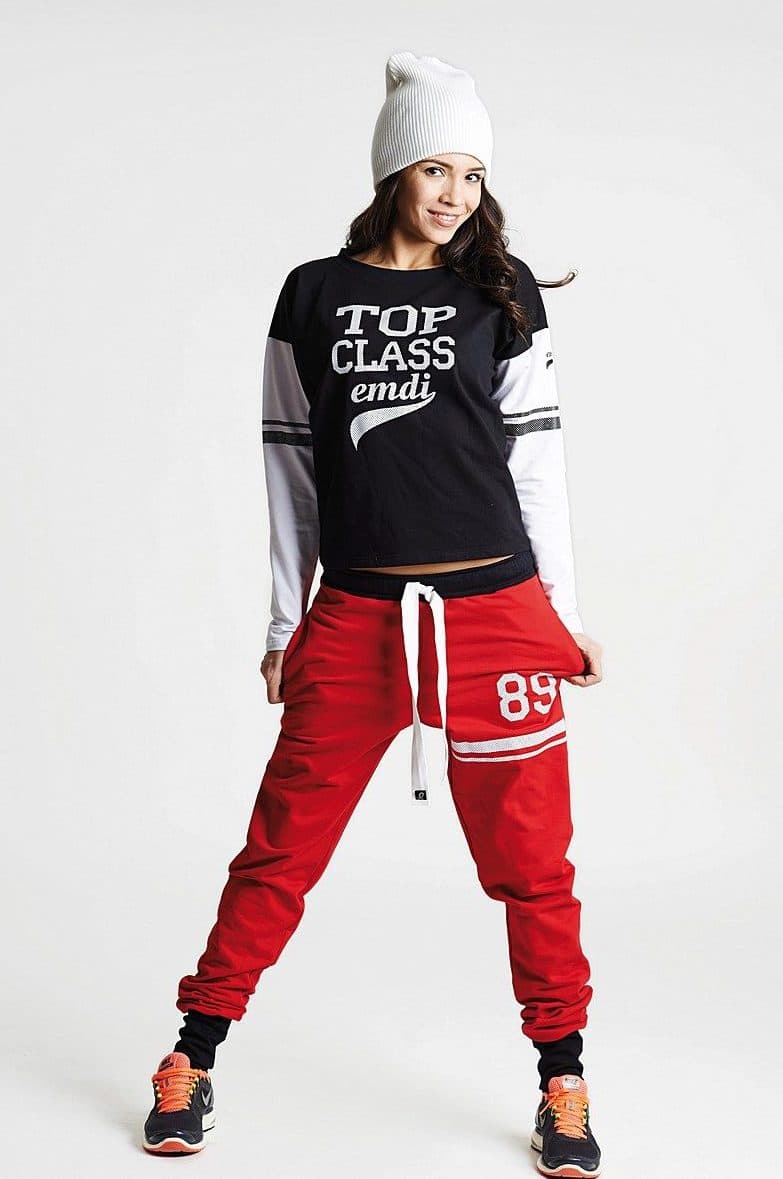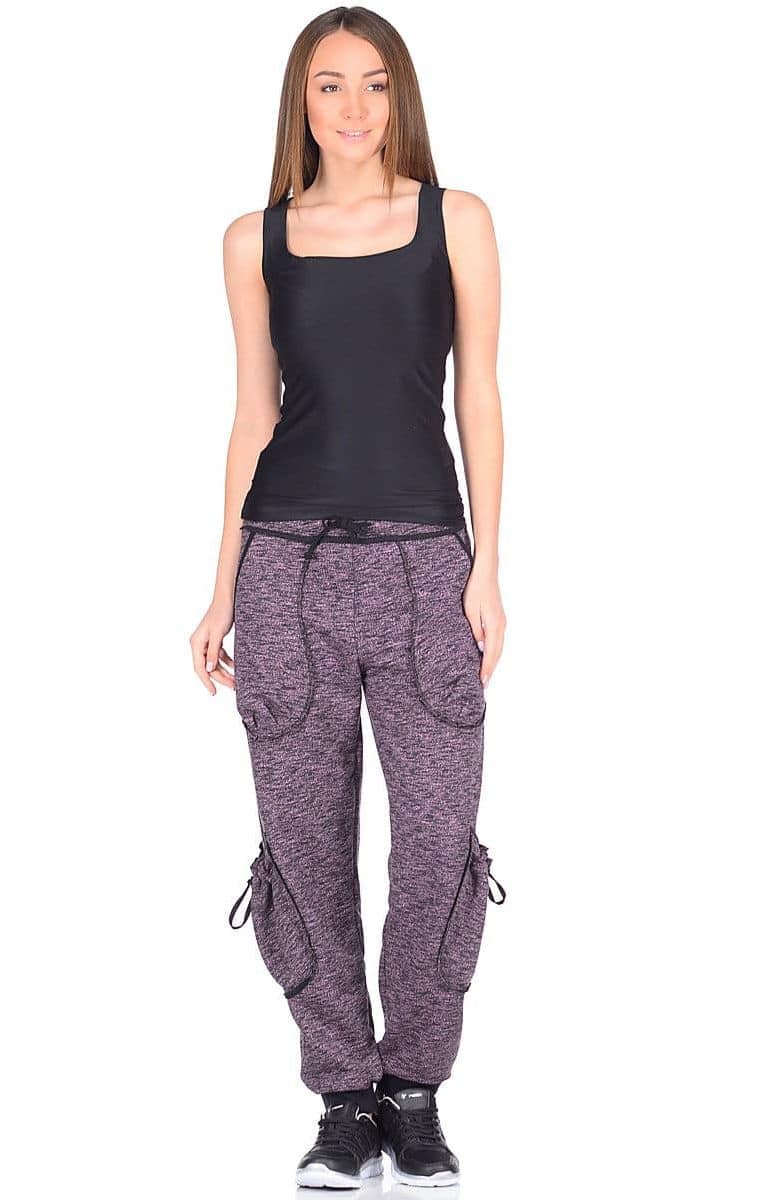 These pants will suit you for sports. Under plain pants, you can wear a black, light T-shirt or a bright top.