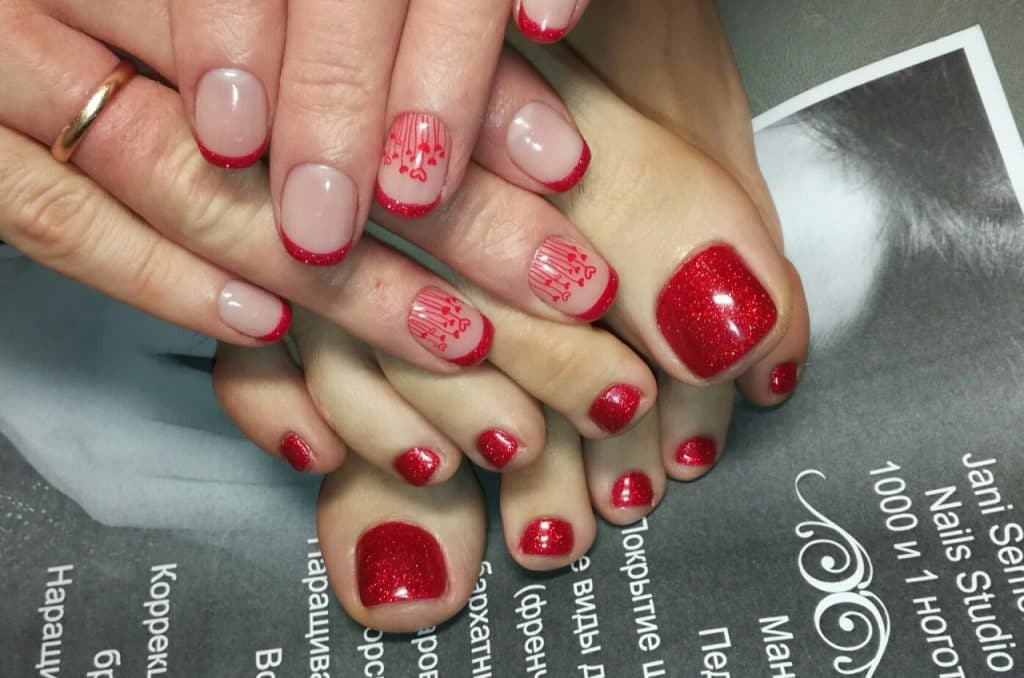 Now spangles are presented in various shapes: round, stars, hearts, hexagons. They can be of different colors and sizes. It looks very beautiful red varnish with sparkles in us. With each kind of pedicure will look different wonderful.