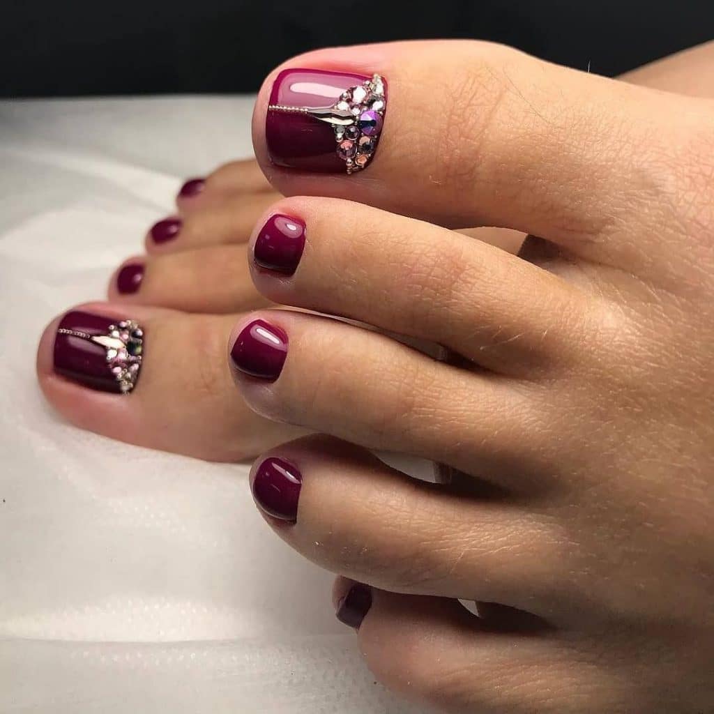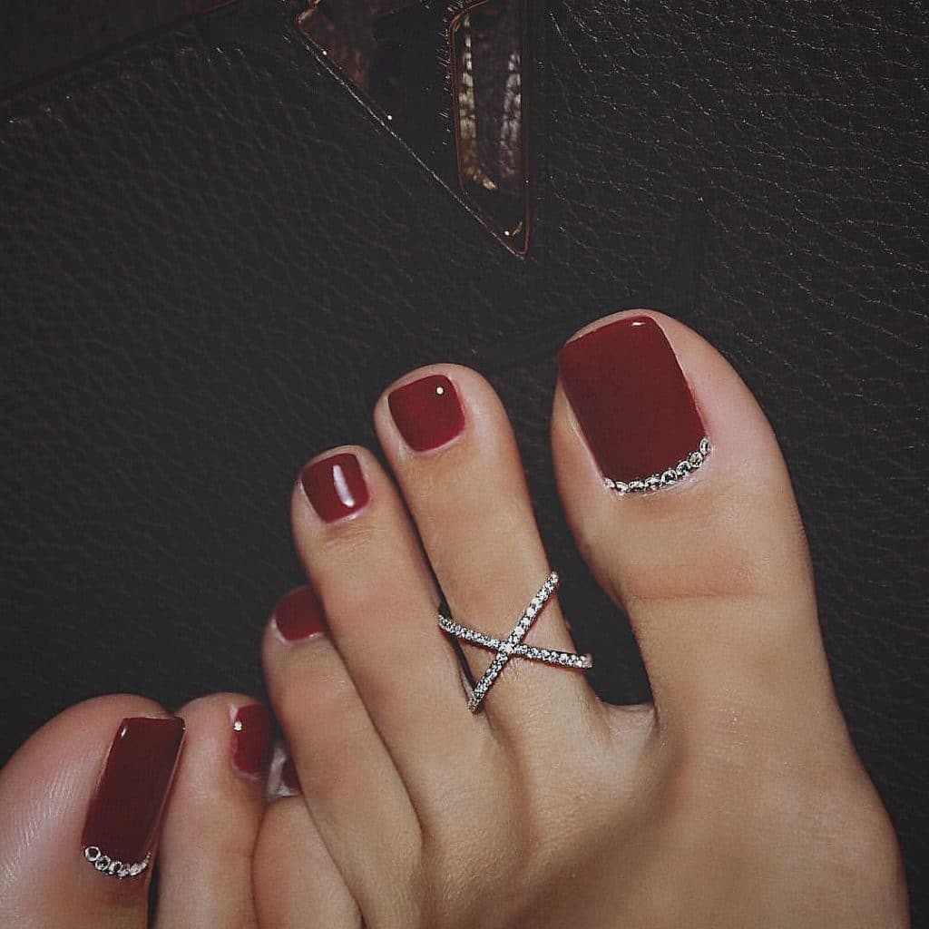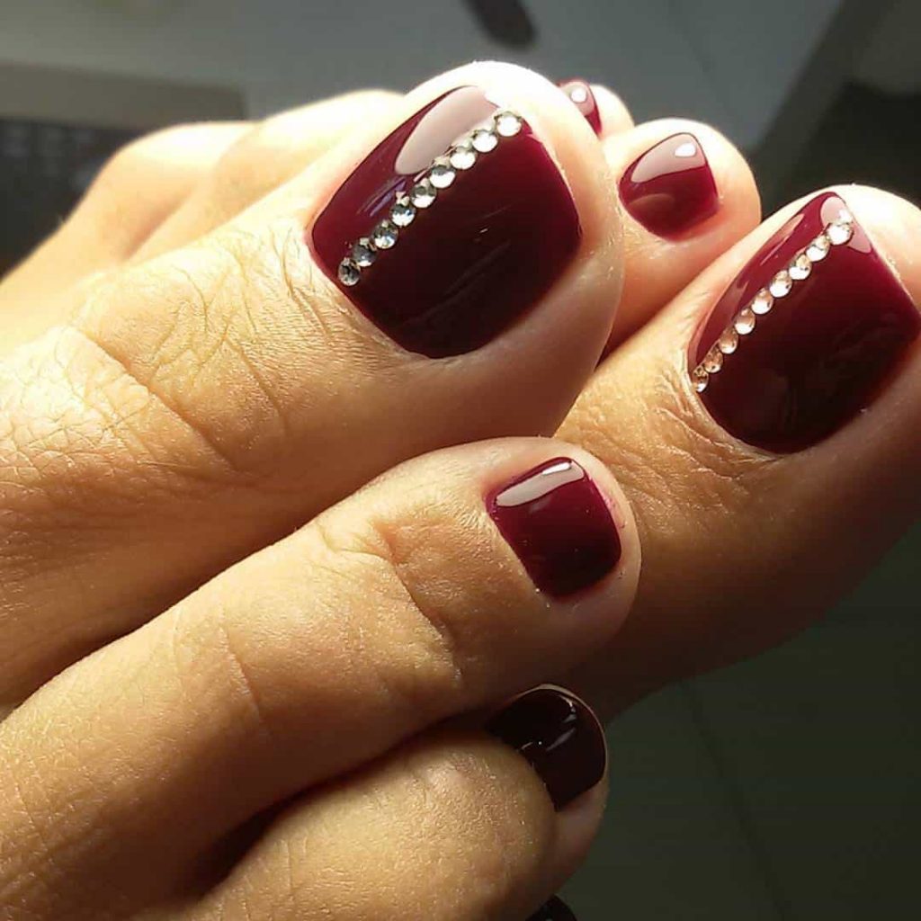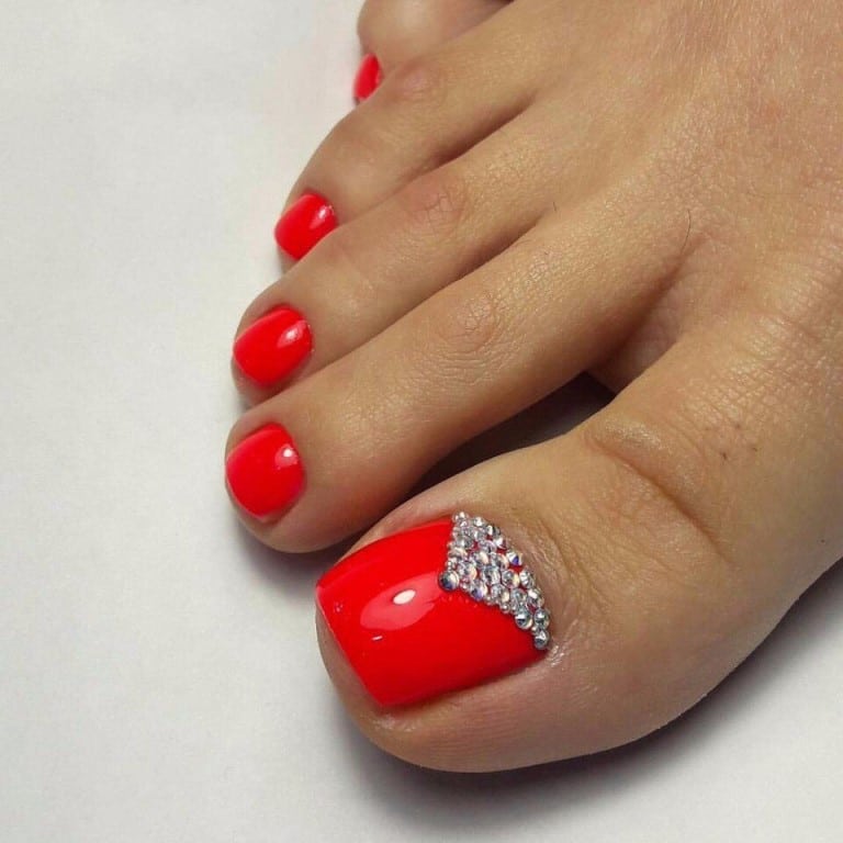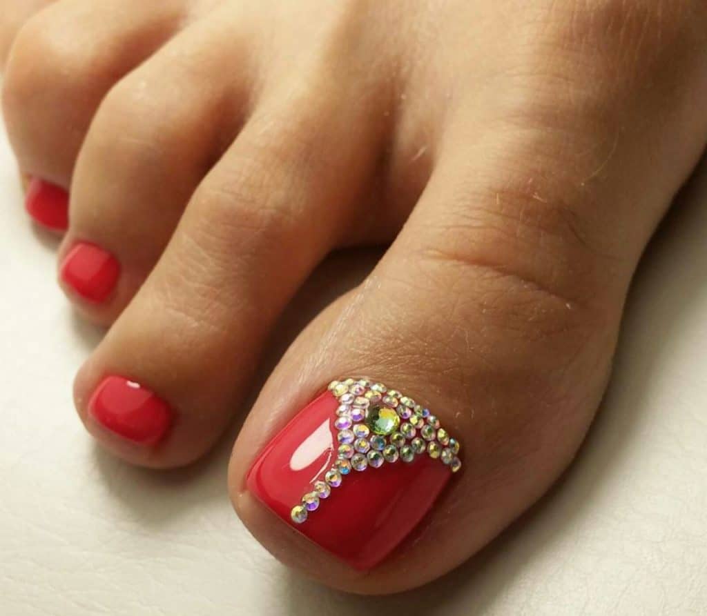 The most favorite option for many fashionistas is a red pedicure with rhinestones. In a pedicure, rhinestones are usually glued only on the thumb. Rhinestones can be adjusted in various ways. In the form of a hole, stripes, triangle, or simply in a chaotic form. Or maybe you want to cover the whole nail with rhinestones.