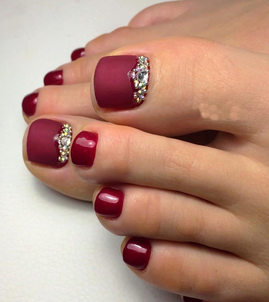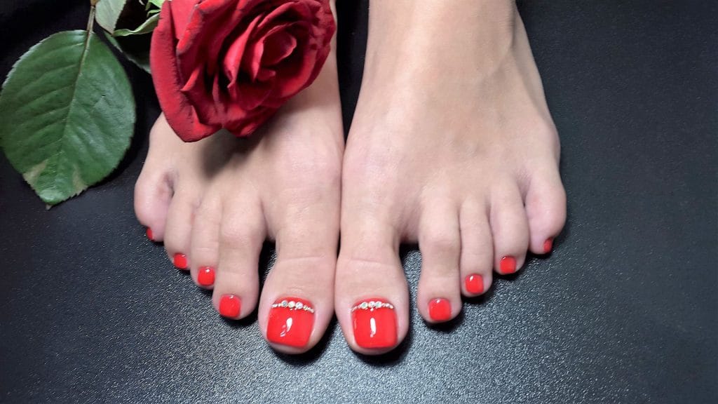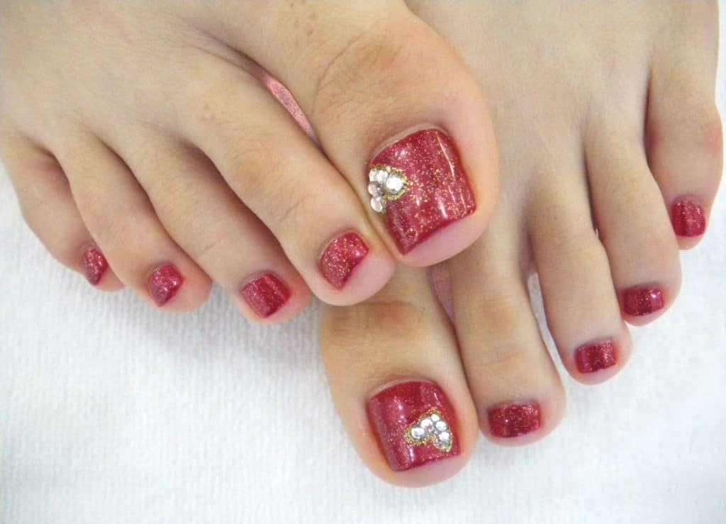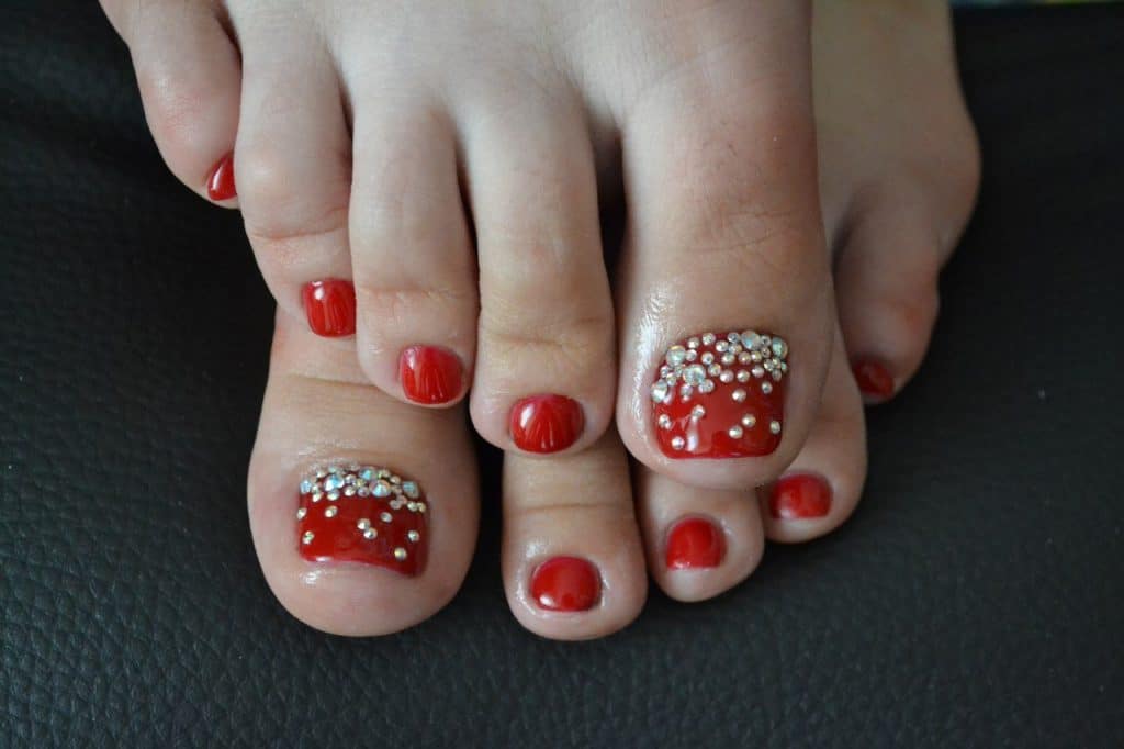 Red pedicure with rhinestones