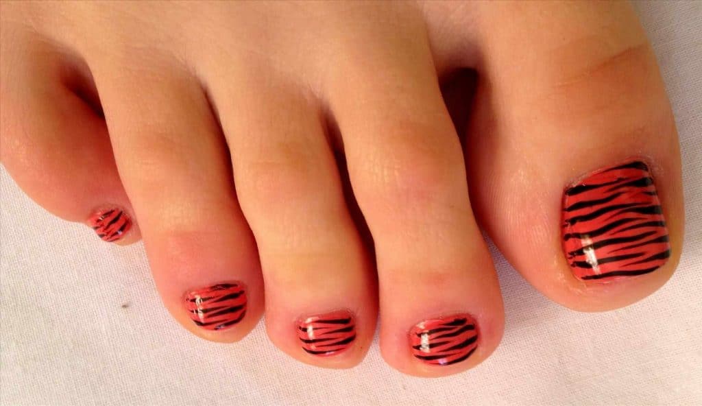 Very cute and interesting red pedicure makes the design. With him, he will look more tender. Design can be in the form of flowers, stars, stripes, monograms, geometry. Now we have an animal print in fashion, so why not try to make strips like a zebra or a leopard spot.
