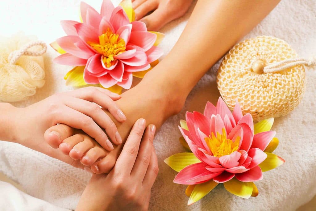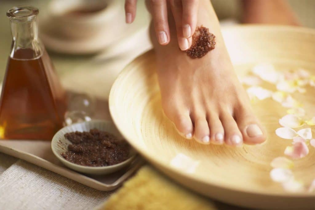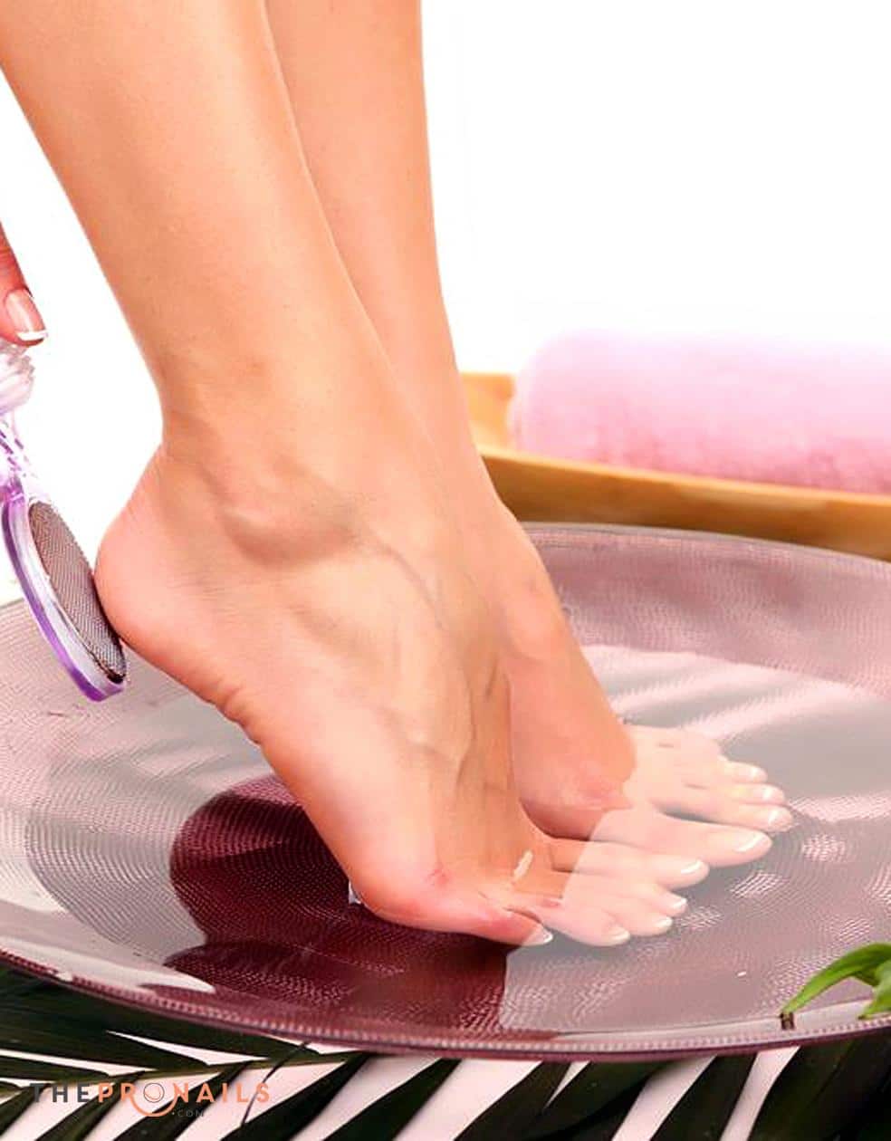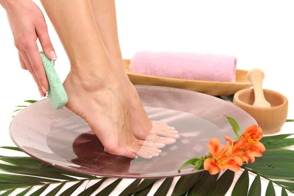 At this stage, we make a useful and relaxing foot bath. It can be done with the help of special means for pedicure or you can use home remedies, for example, sea salt, iodine, soda, liquid soap. A great addition would be a couple drops of your favorite essential oil. They will help you relax even more. So we sit for 15-20 minutes.