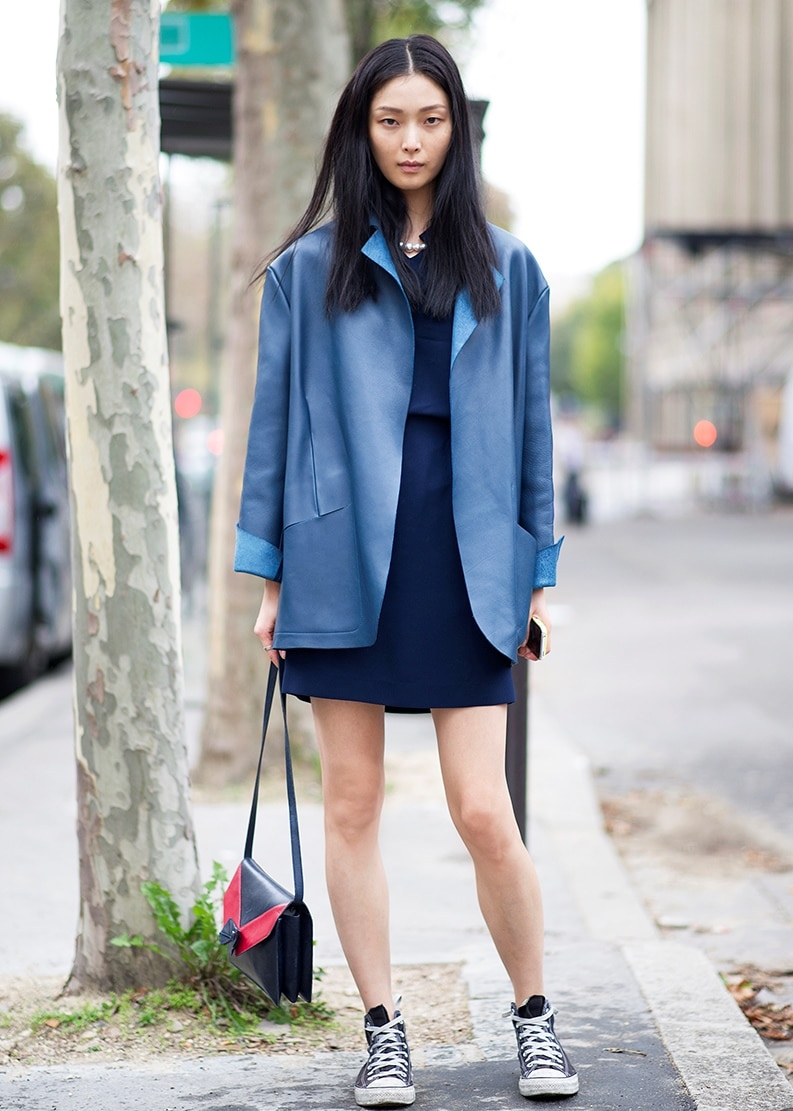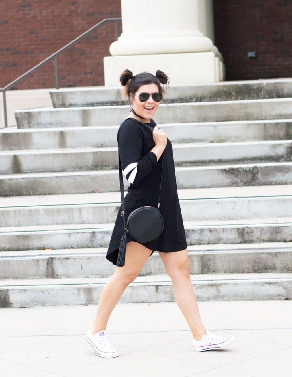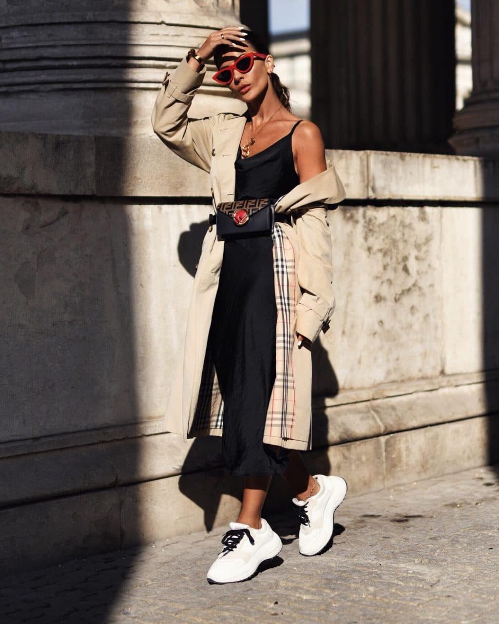 Classic sneakers will add a playful or bold mood to your look. Pick up black sneakers for dark dresses, and for bright, saturated colors for colored ones.