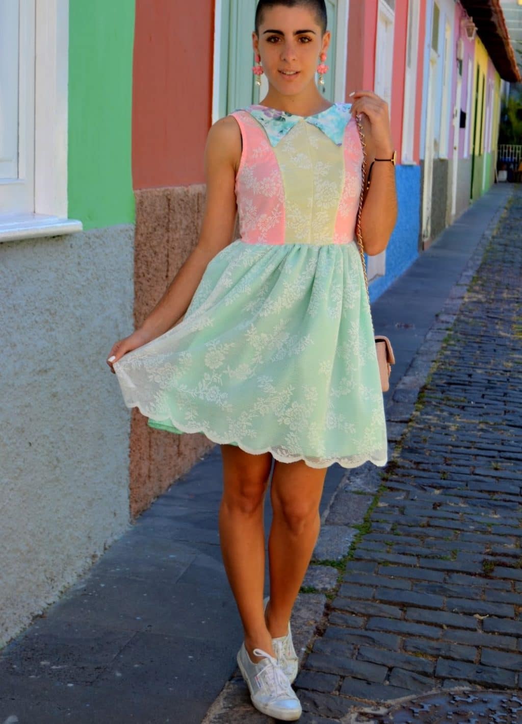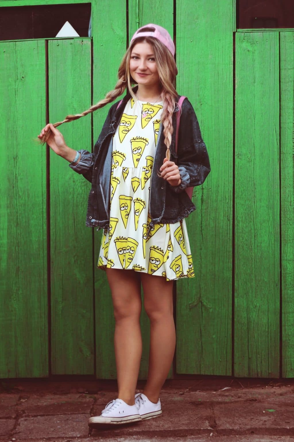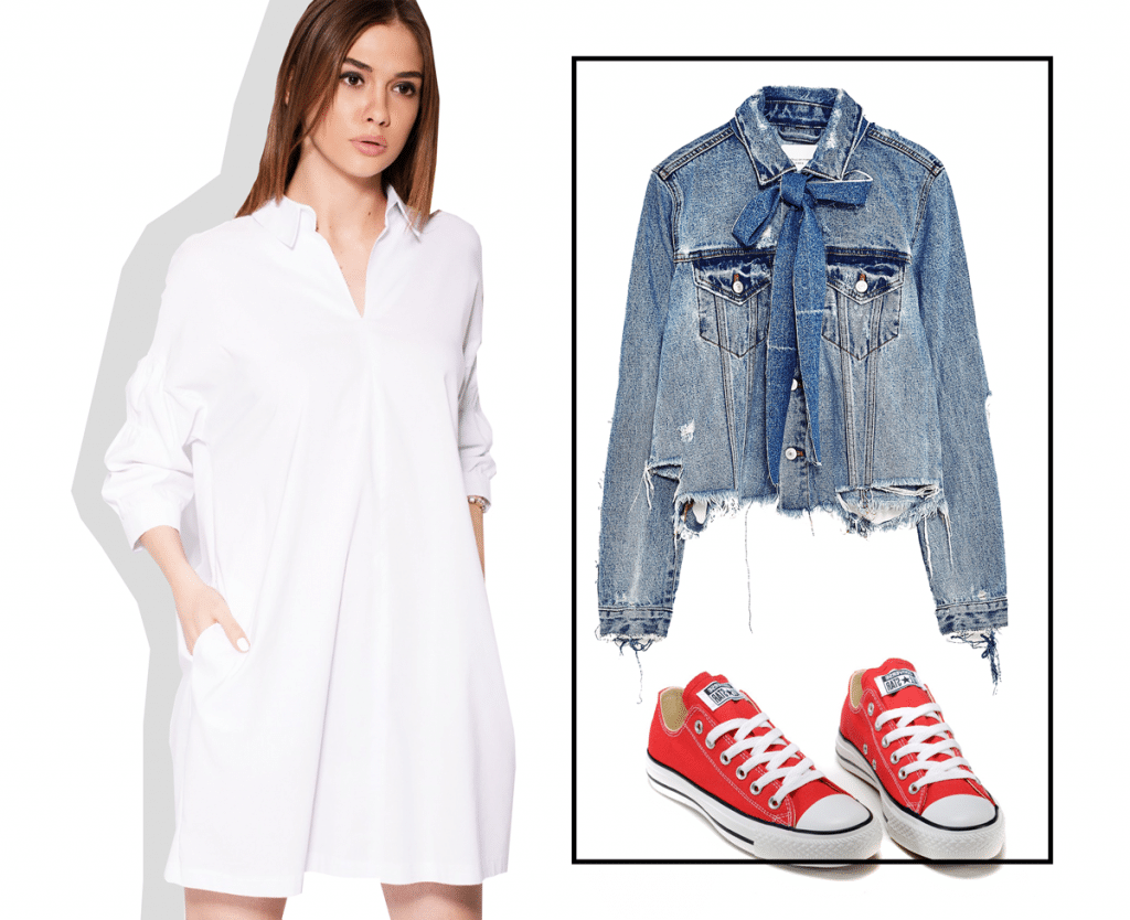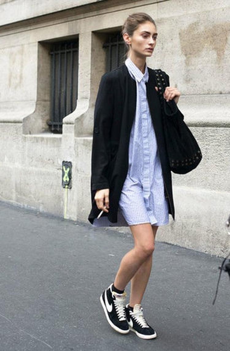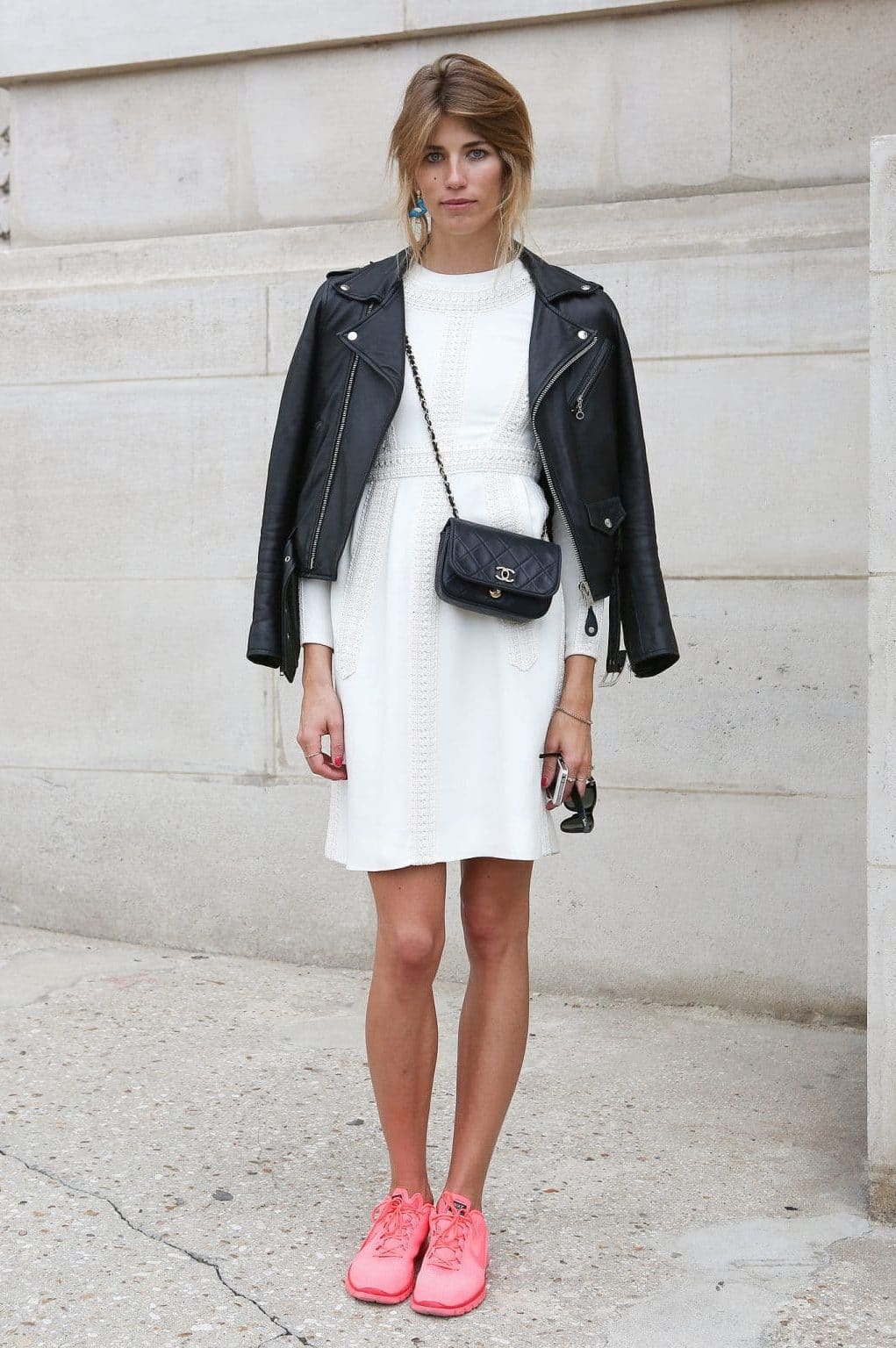 Bright sneakers will help to dilute the look. Choose any pastel or universal dress and sneakers in bright colors.