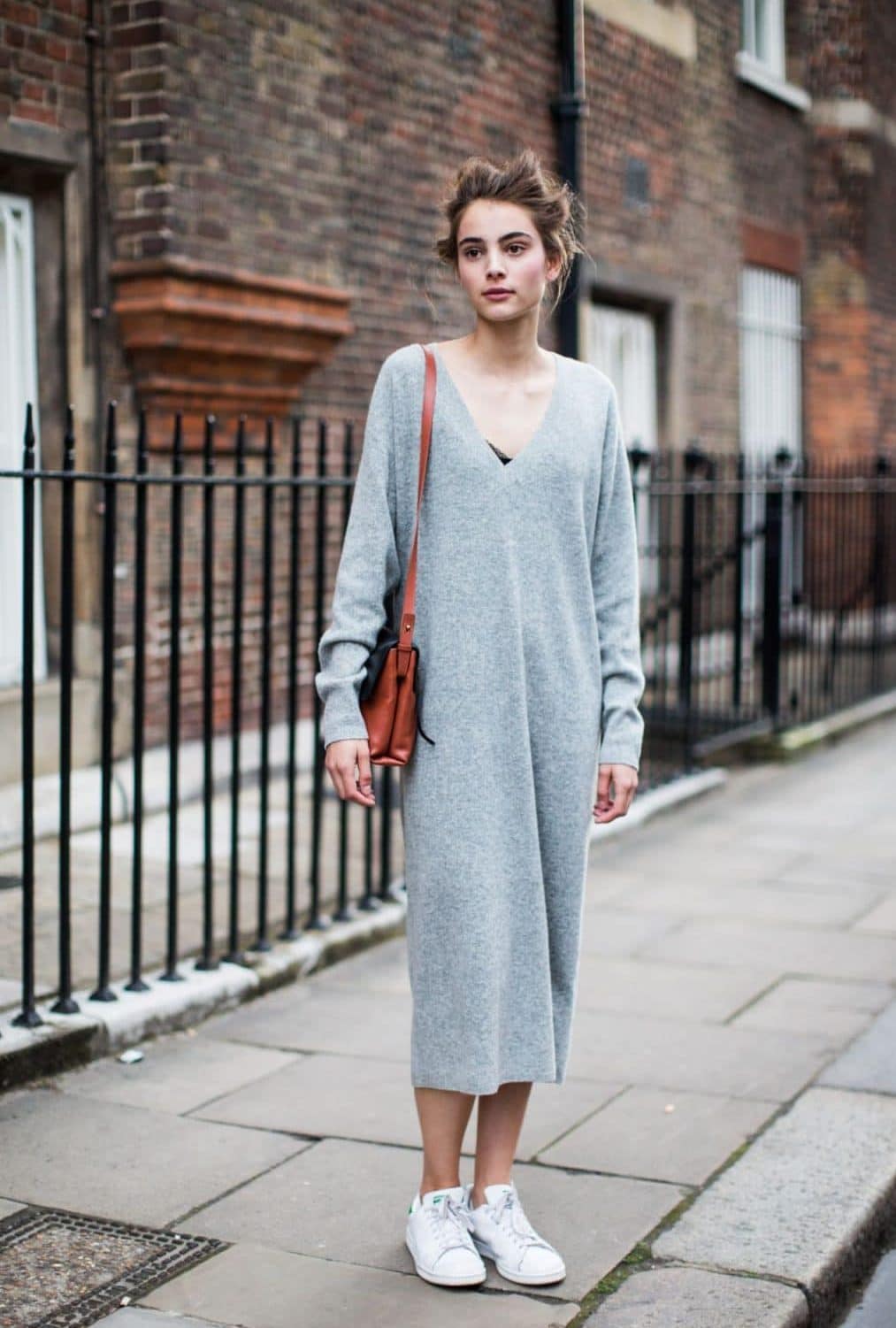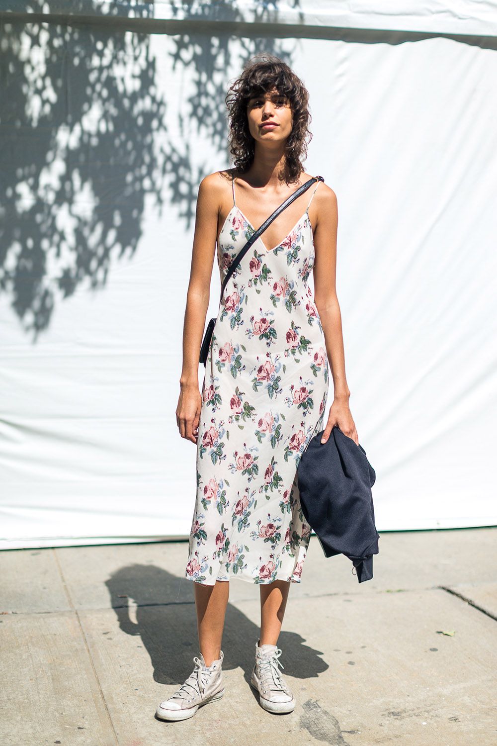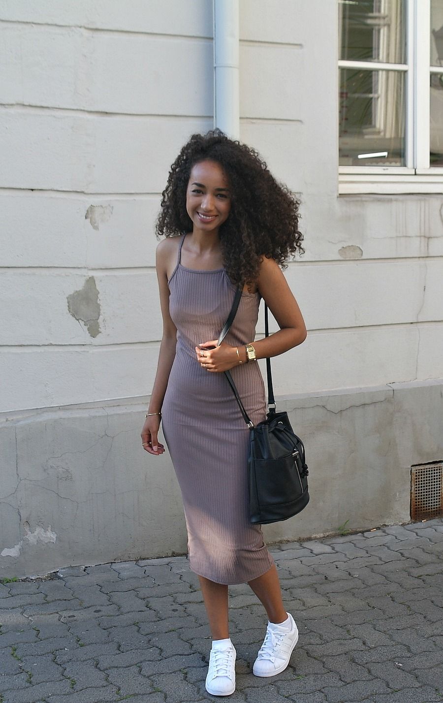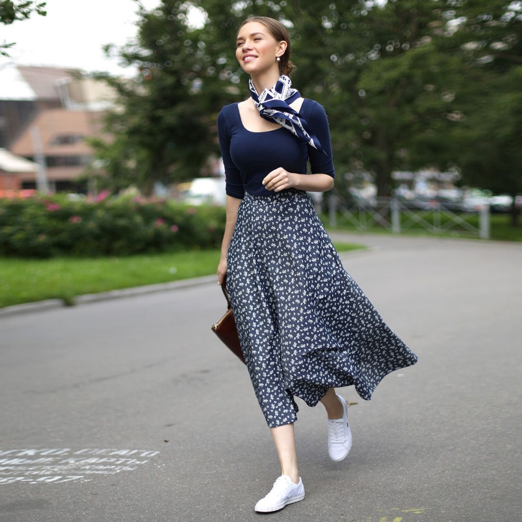 Long dresses are always associated with us in a feminine way. And it would seem impossible to put on sneakers under them, but they really will be perfect for such a length.