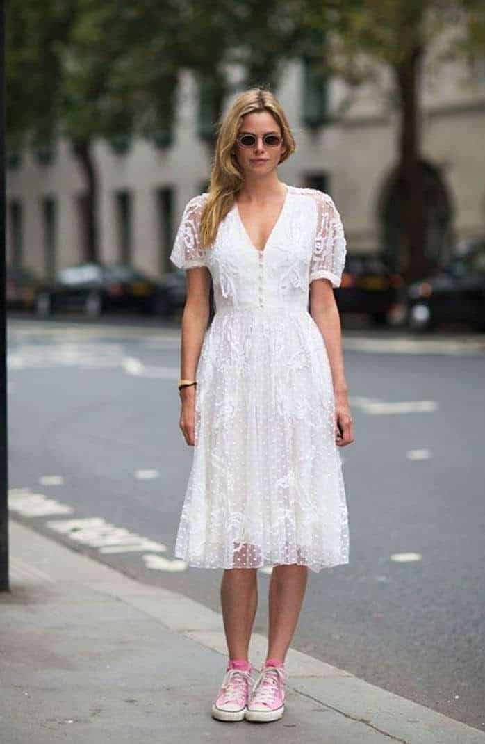 White sneakers are very popular for such dresses. They fit many dresses, and you don’t draw at all to ruin your look.