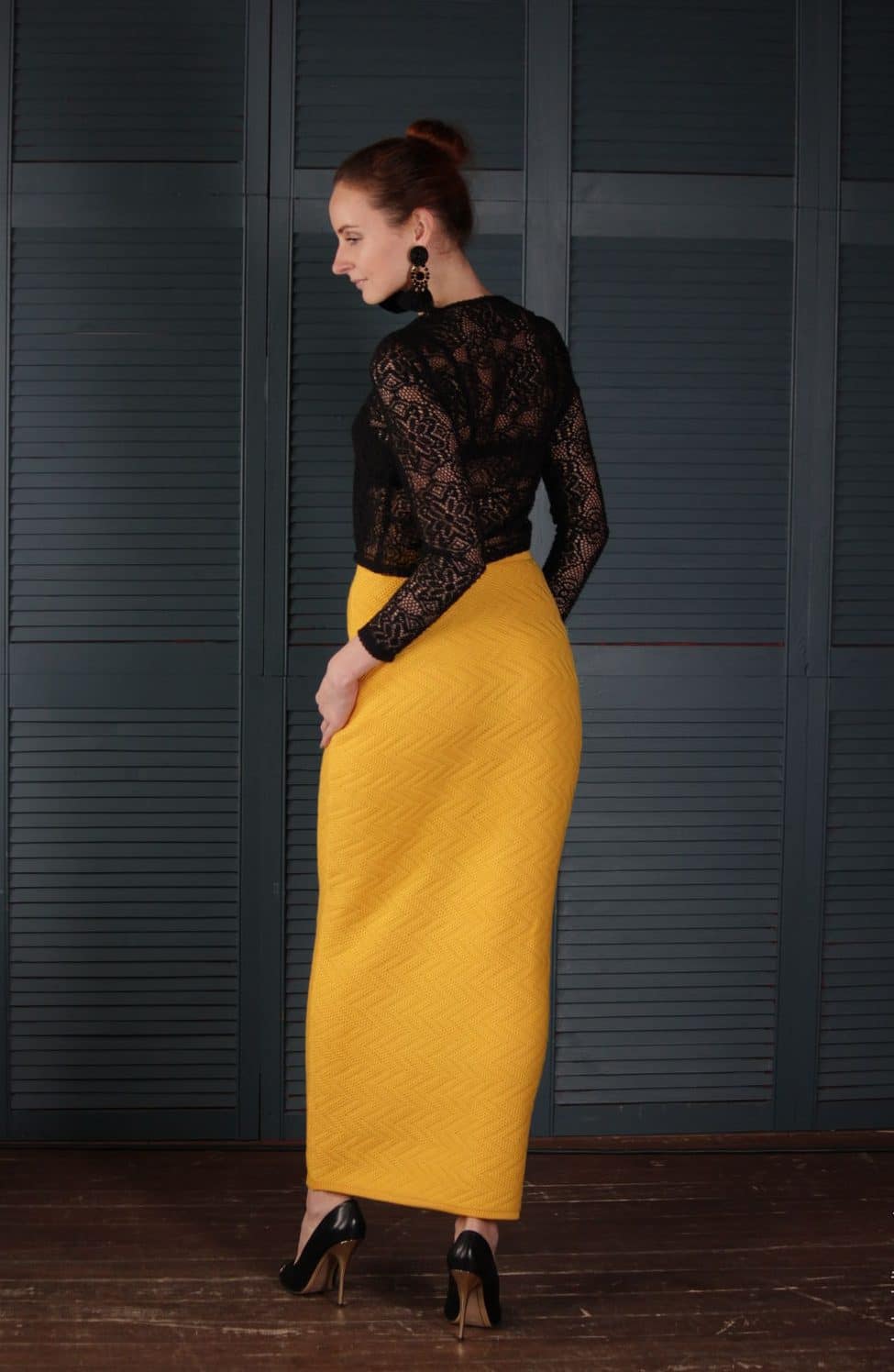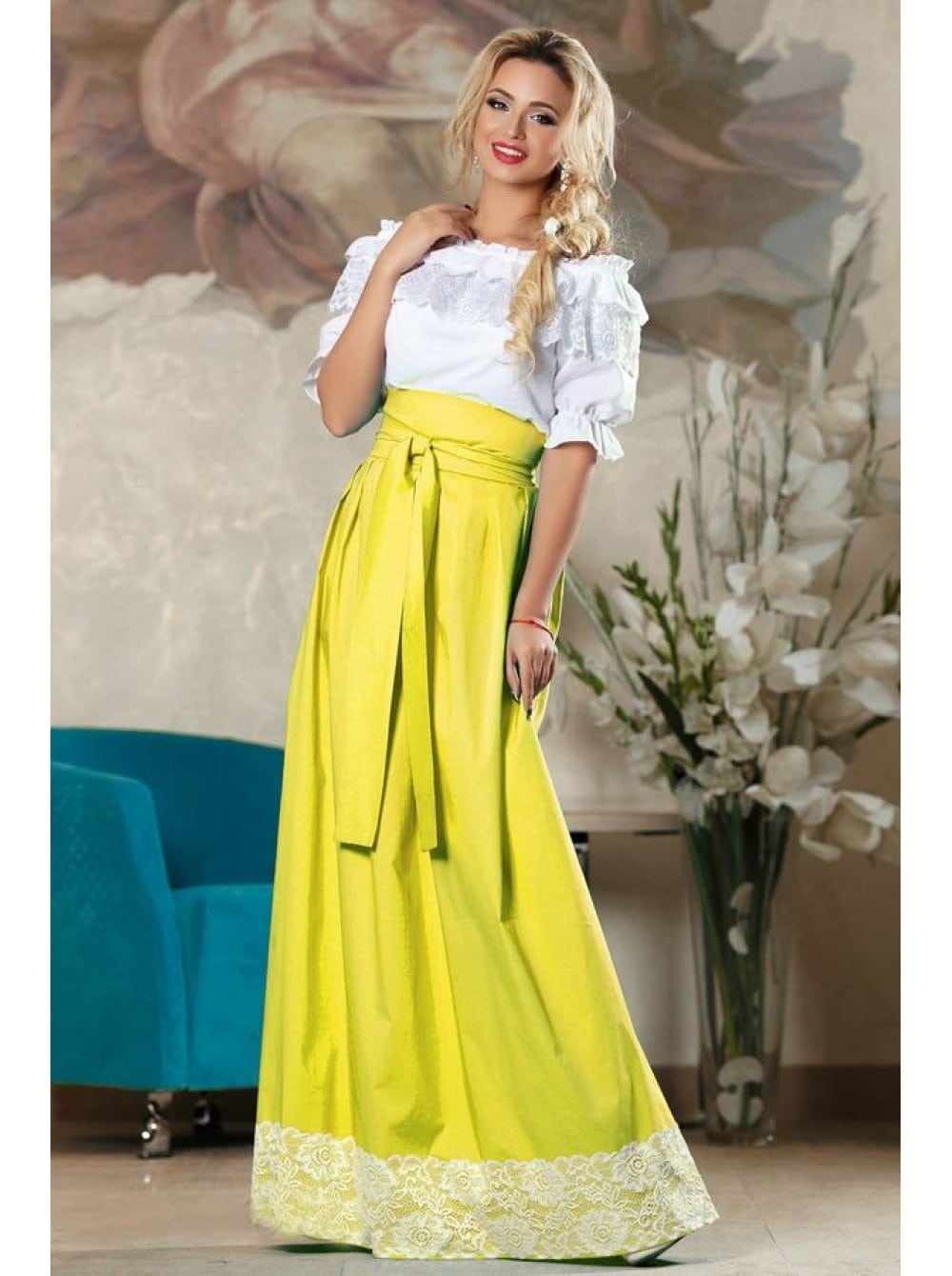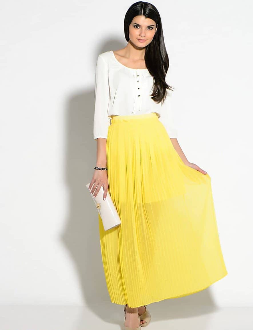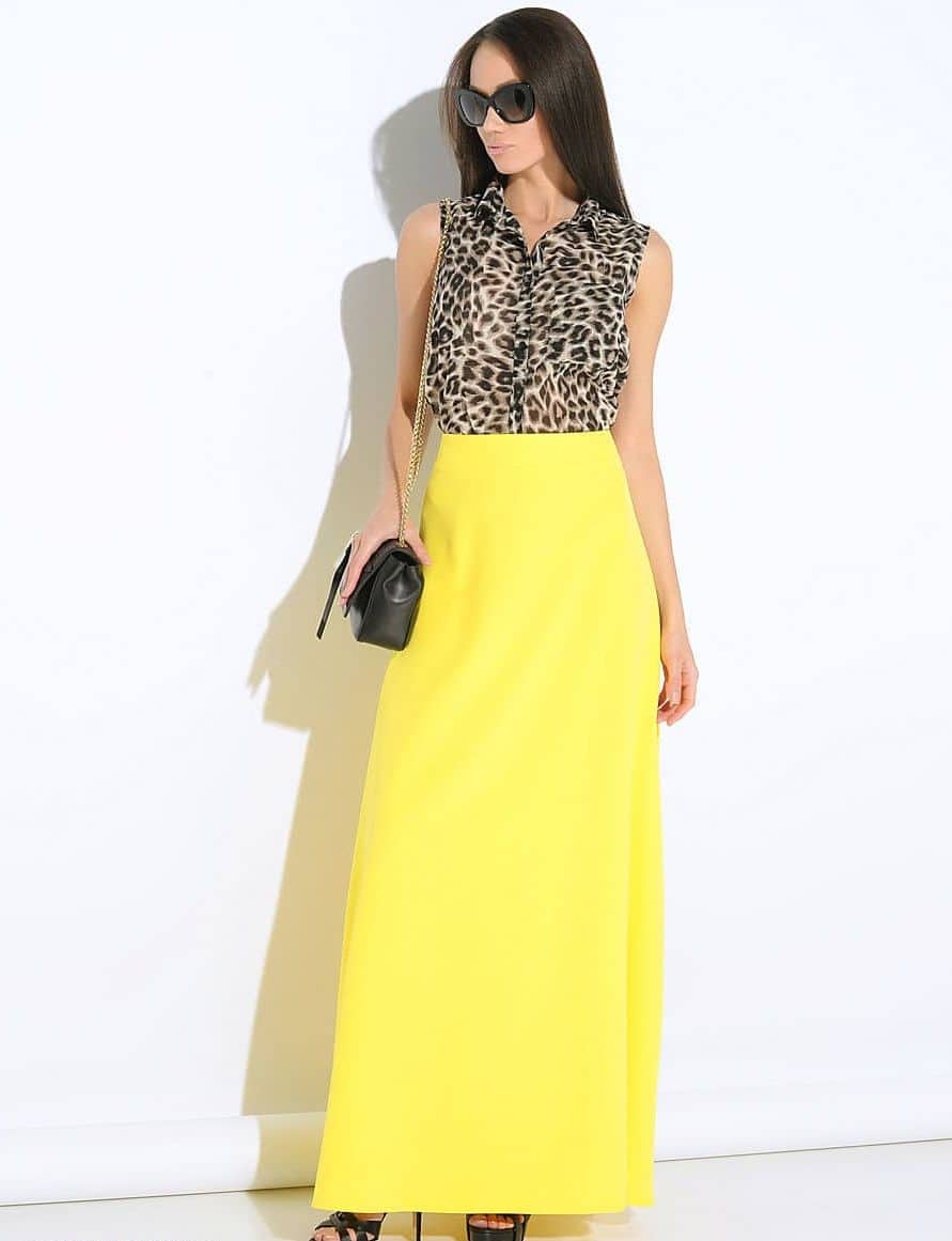 The sunny yellow color of the maxi skirt will refresh you. It will give your look an air of lightness. And in a skirt of this color, you can feel like a princess from a fairy tale.