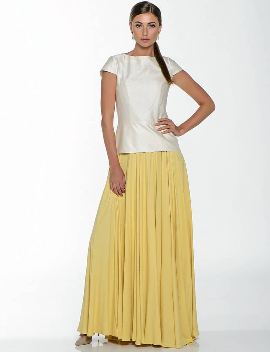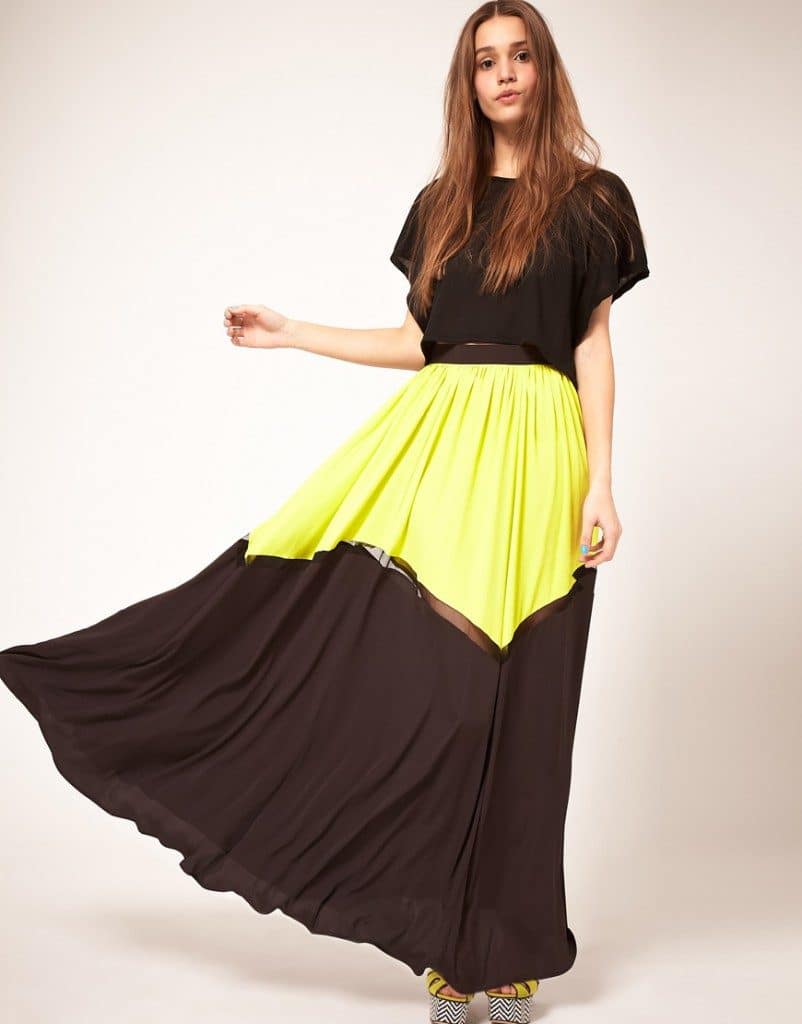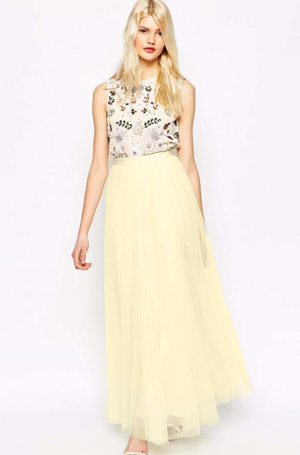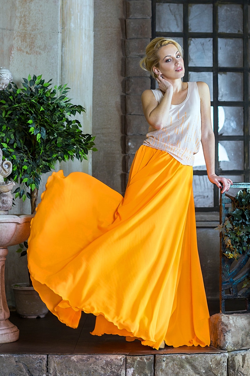 The sunny yellow color of the maxi skirt will refresh you. It will give your look an air of lightness. And in a skirt of this color, you can feel like a princess from a fairy tale.