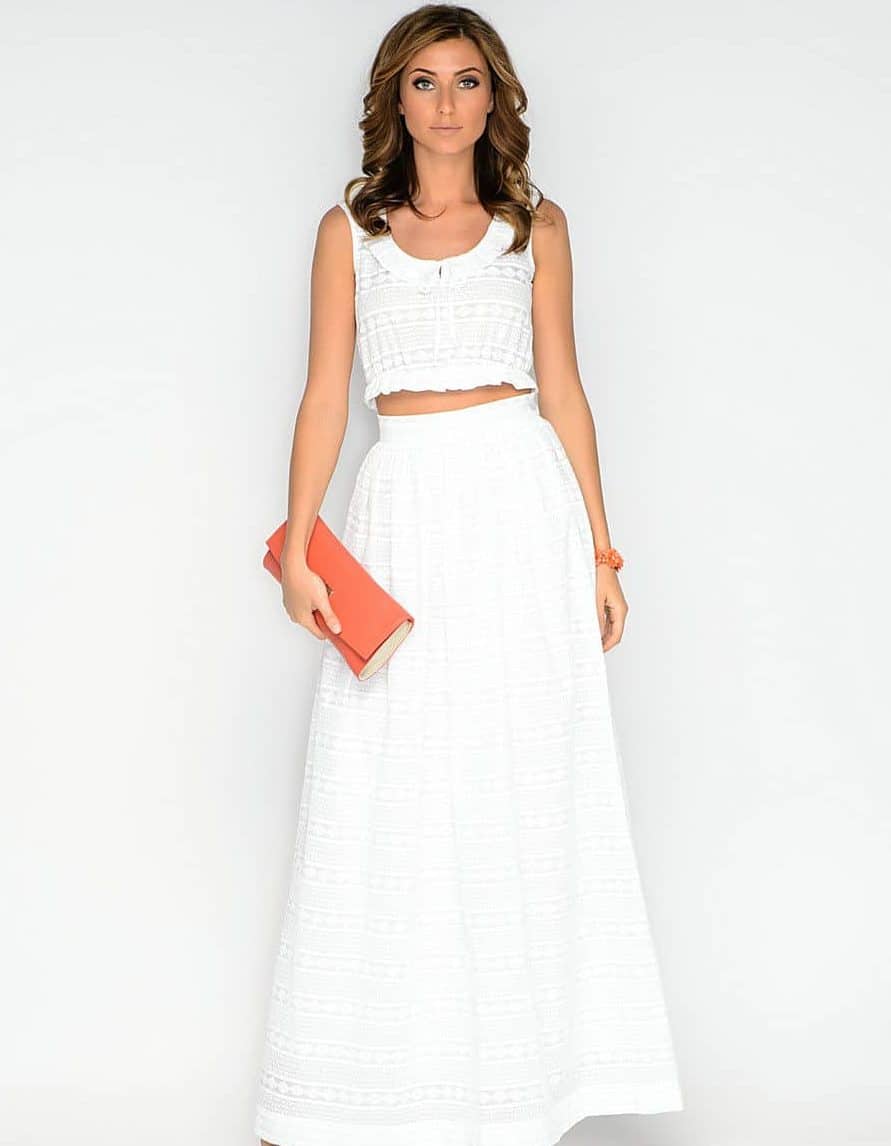 An elegant look will help you create a white top in combination with a white skirt. In this way, use a minimum of accessories and jewelry.