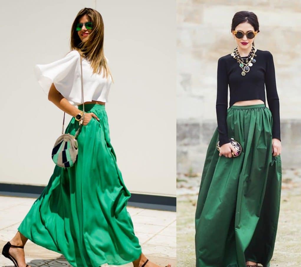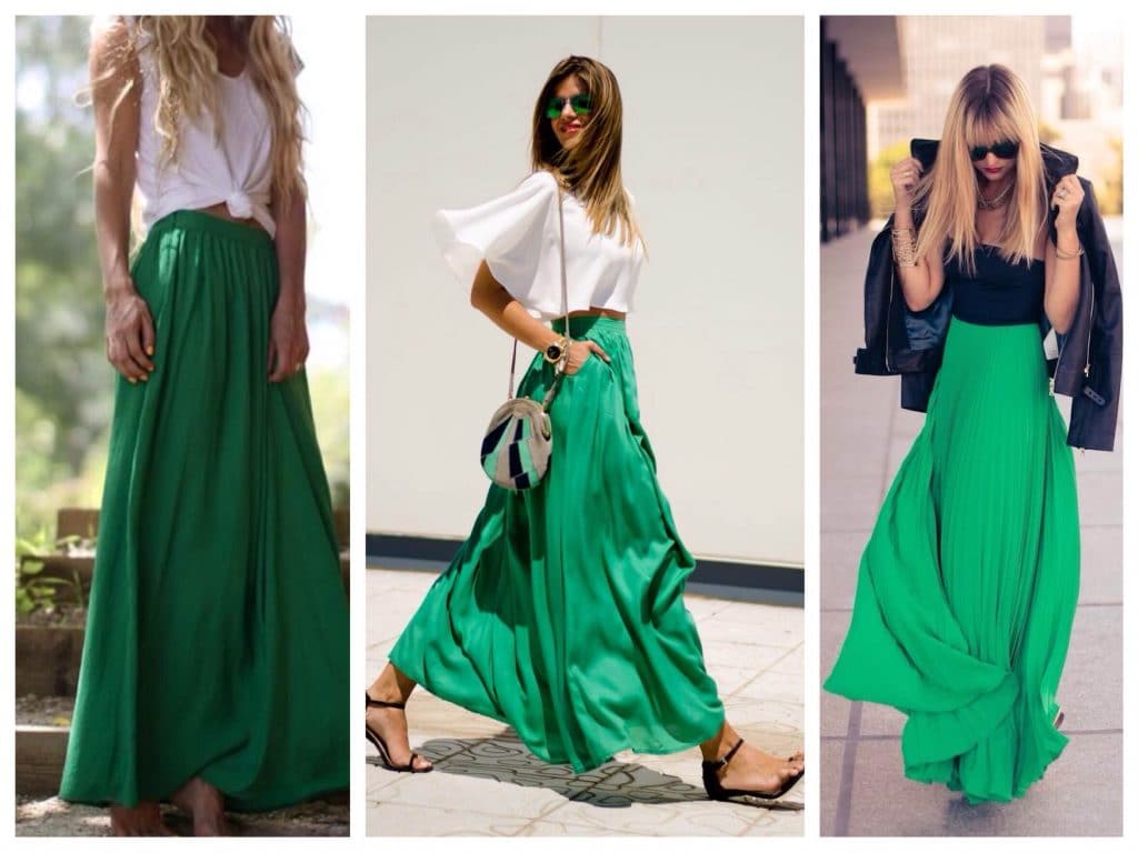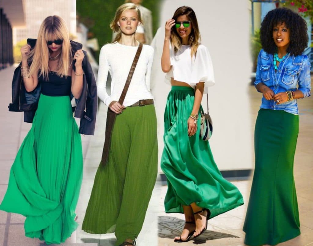 Green color gets along well with white, black. Therefore, pick things in such a gamut. You can pick up a green top for a green skirt. But it should be cold, not very colorful or rich in color.